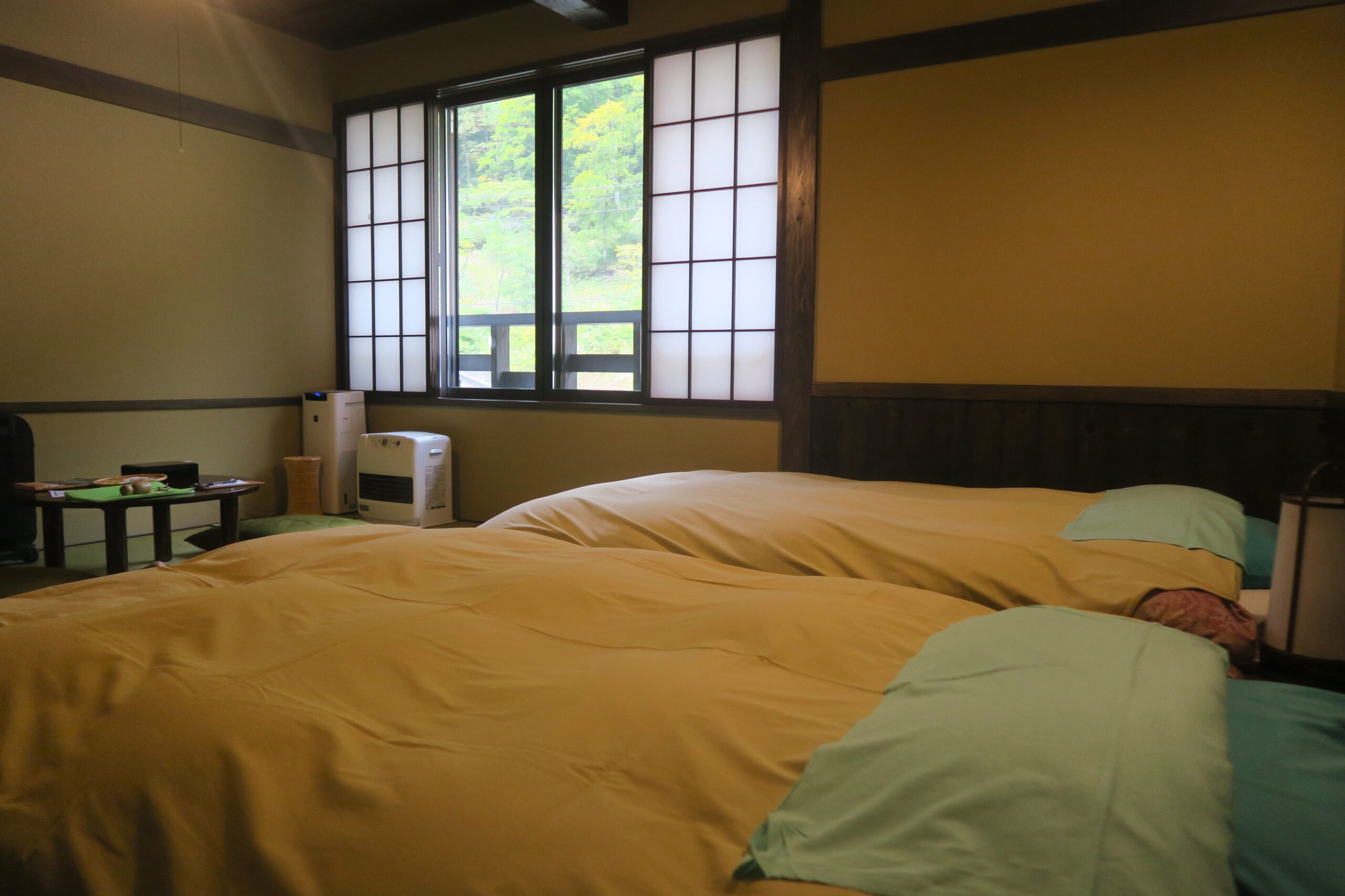 客室は和室8室に特別室1室の9部屋。大露天風呂のある山側の景観がたのしめる、板床の間に和ベッドを備えた客室「こごみ」が今宵のお部屋です。