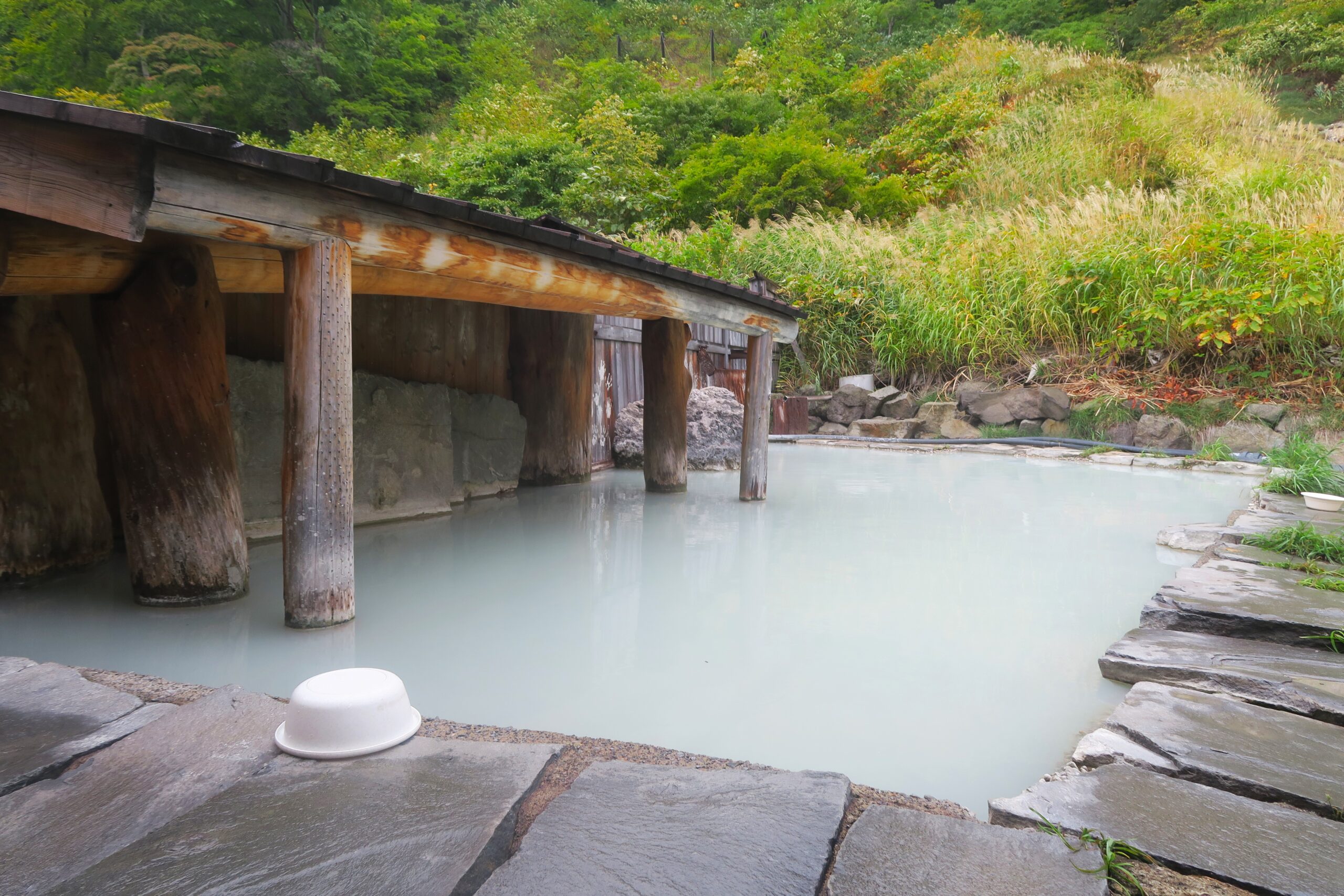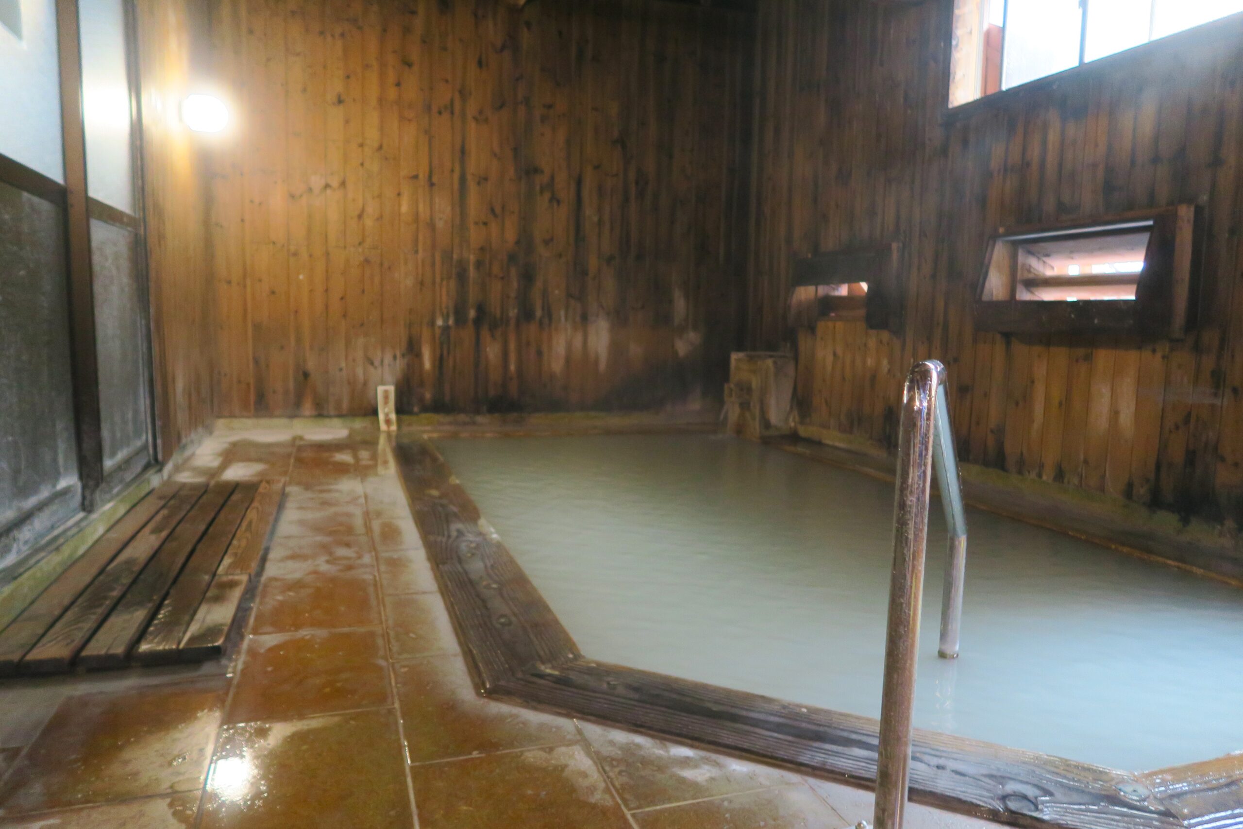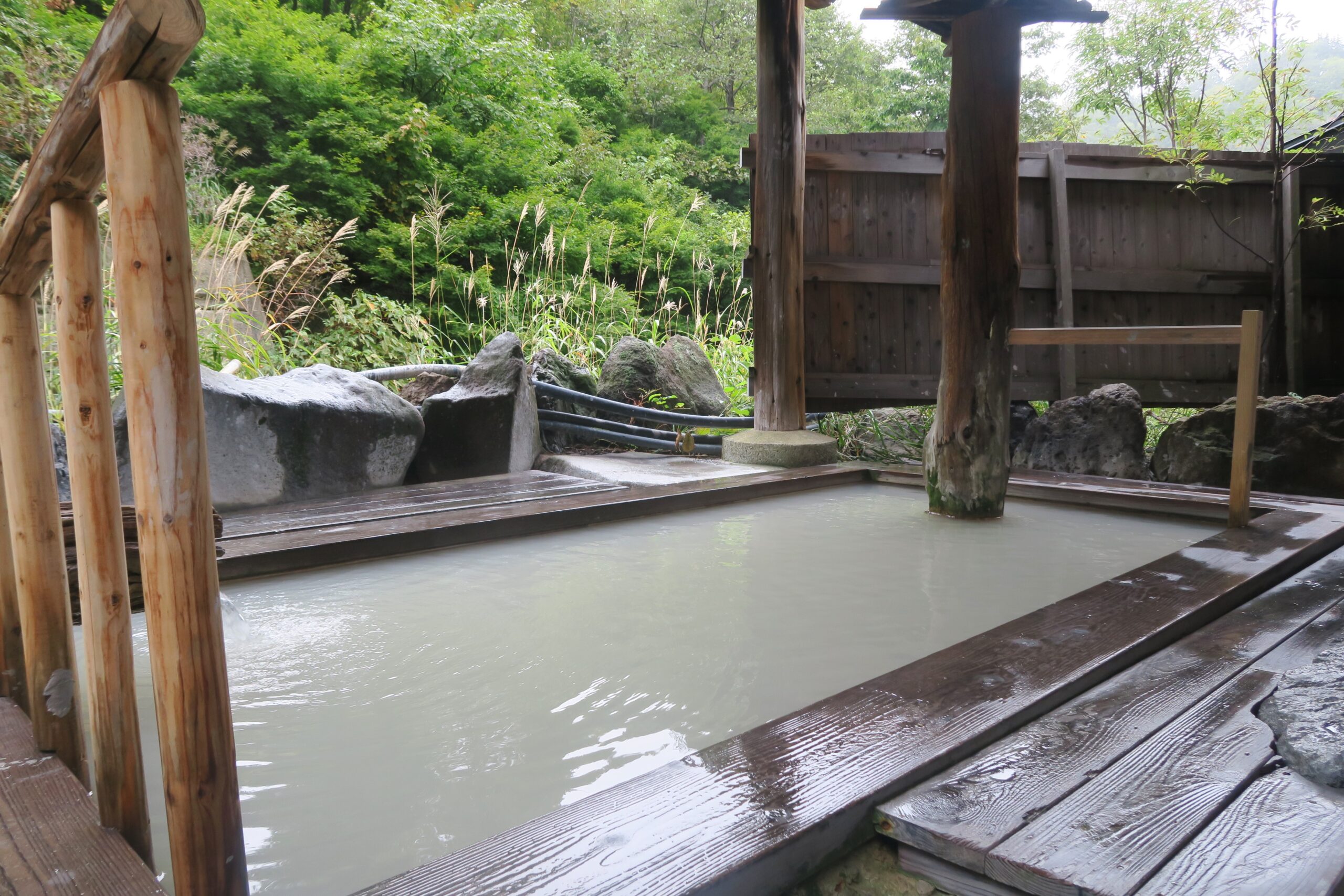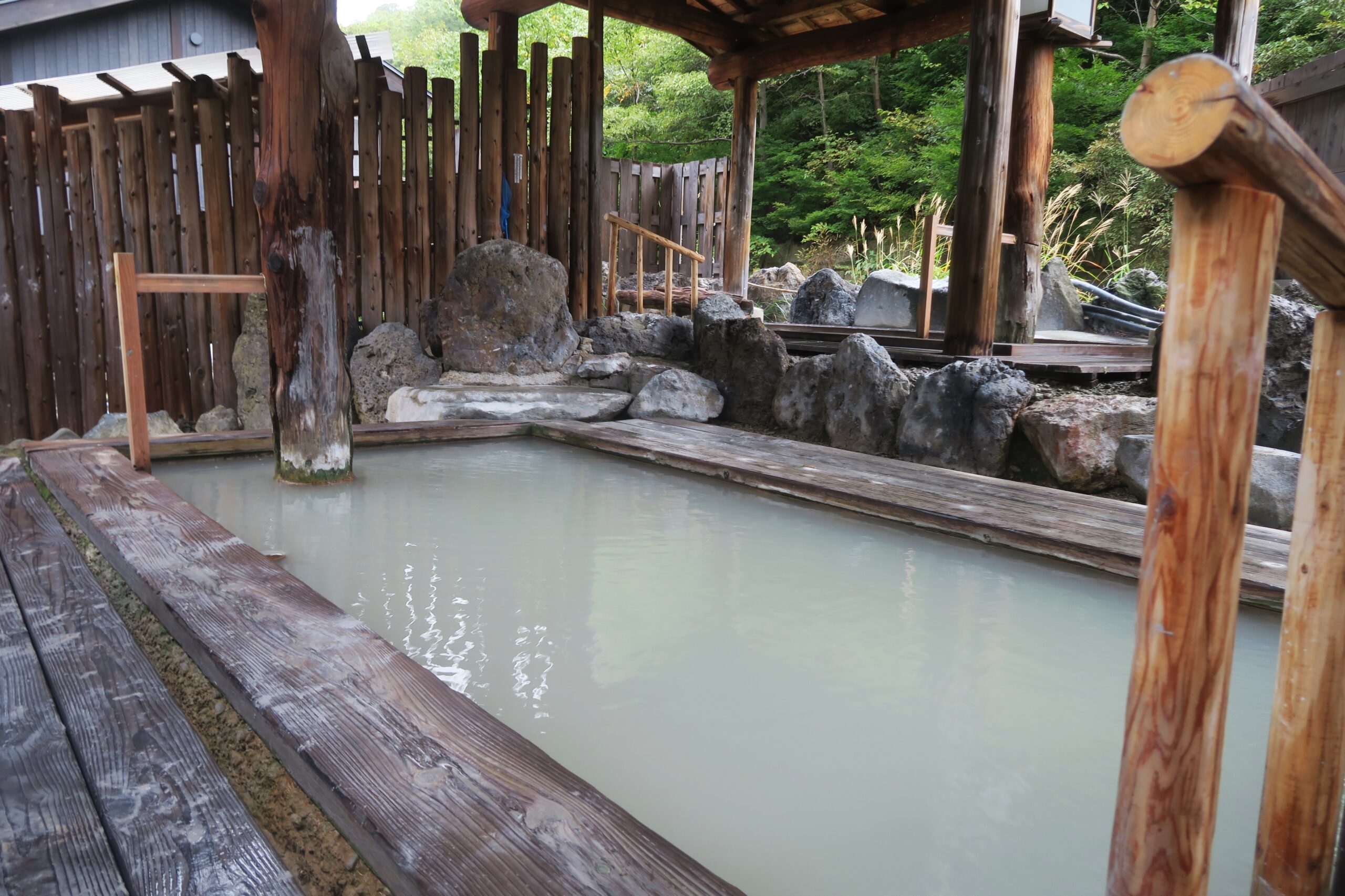 単純硫黄温泉の天狗の湯(pH3.7)、単純硫黄温泉(硫化水素型)の川の湯(pH5.8)、単純泉の新湯(pH3.8)の異なる3つの源泉からそれぞれ泉質の異なる湯が引かれ、内湯や露天風呂をめぐるのが楽しい。湯船の底に成分が沈殿するほど濃い白濁湯に浸かるとトロリとした湯が身体に浸み込んでいきます。