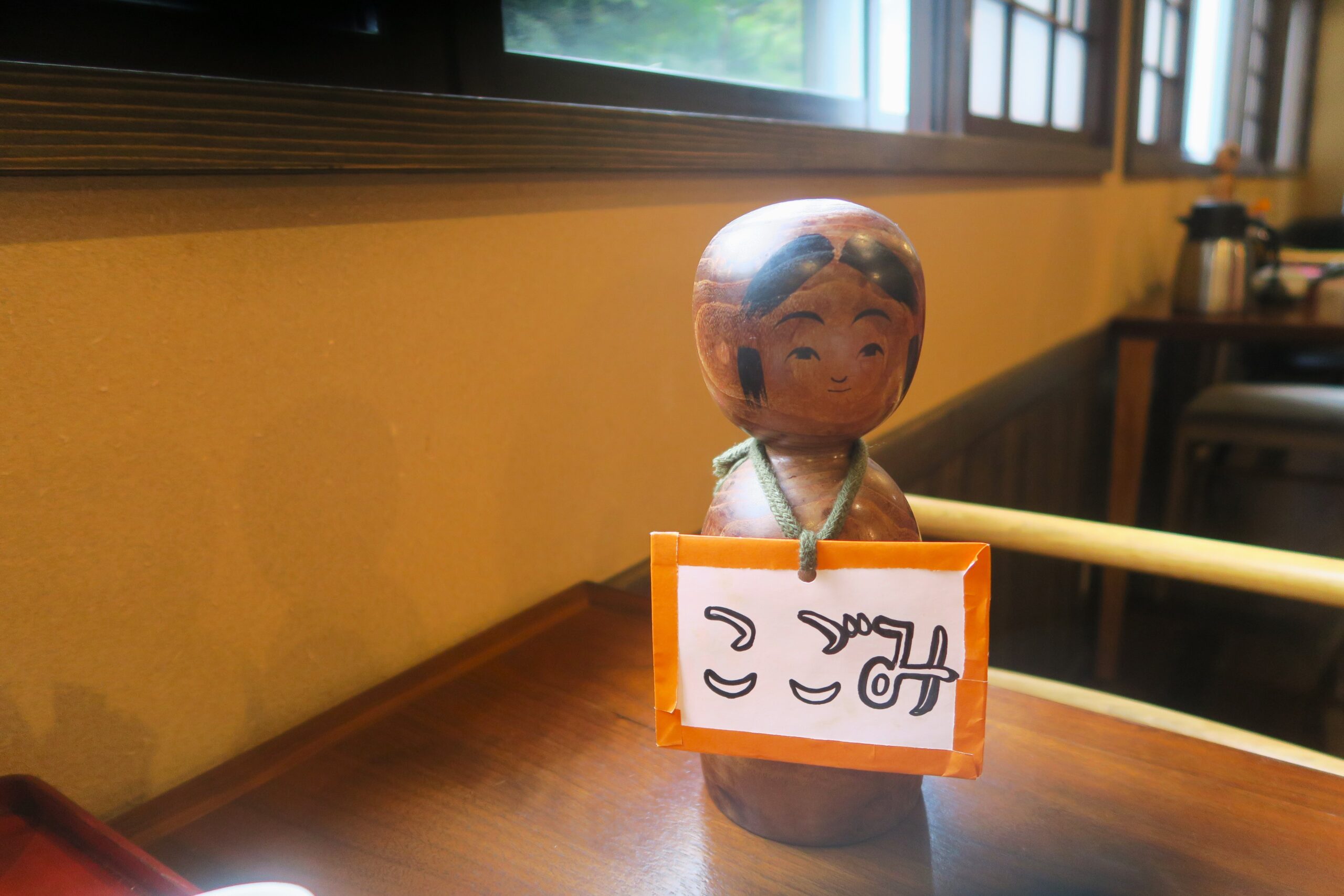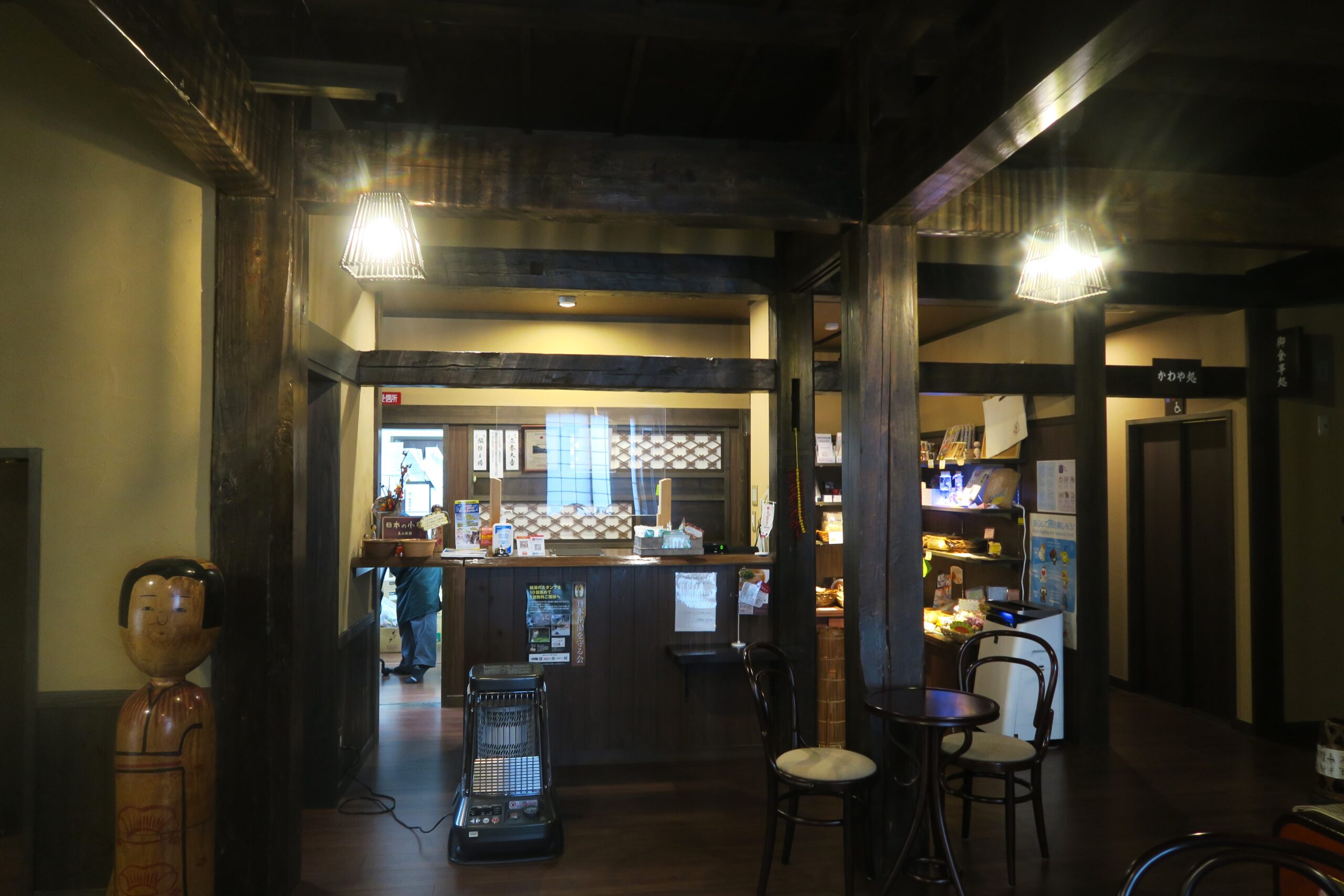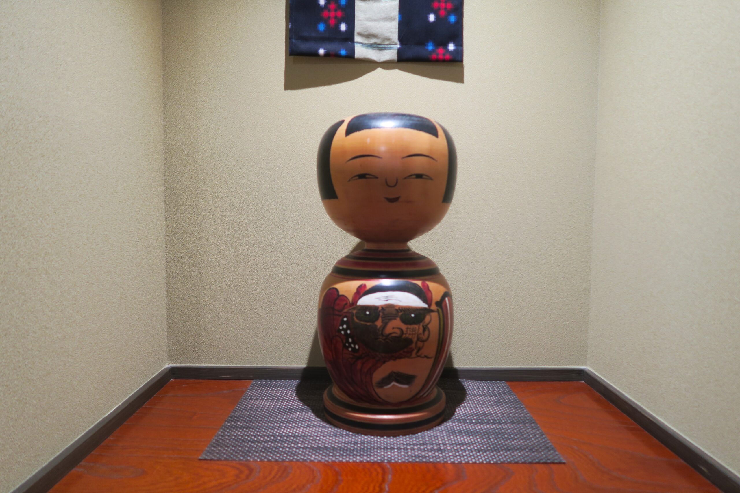 湯沢市のこけしの産地・木地山とゆかりがあり、名工・小椋久太郎作の前だれ梅花こけしが玄関に佇んでいます。江戸末期に、椀や盆などの漆器の木地を作る木地師たちが、より質のよい材料を求めて移住してきたのが木地山地区。その木地師たちにより、子供の玩具として作り始められ、木地山こけしと呼ばれます。木地山こけしは頭と銅を一本の木でつくりボリュームがあります。大きいものは前垂姿の梅花模様で描き、小寸のものには簡単な菊を描いています。