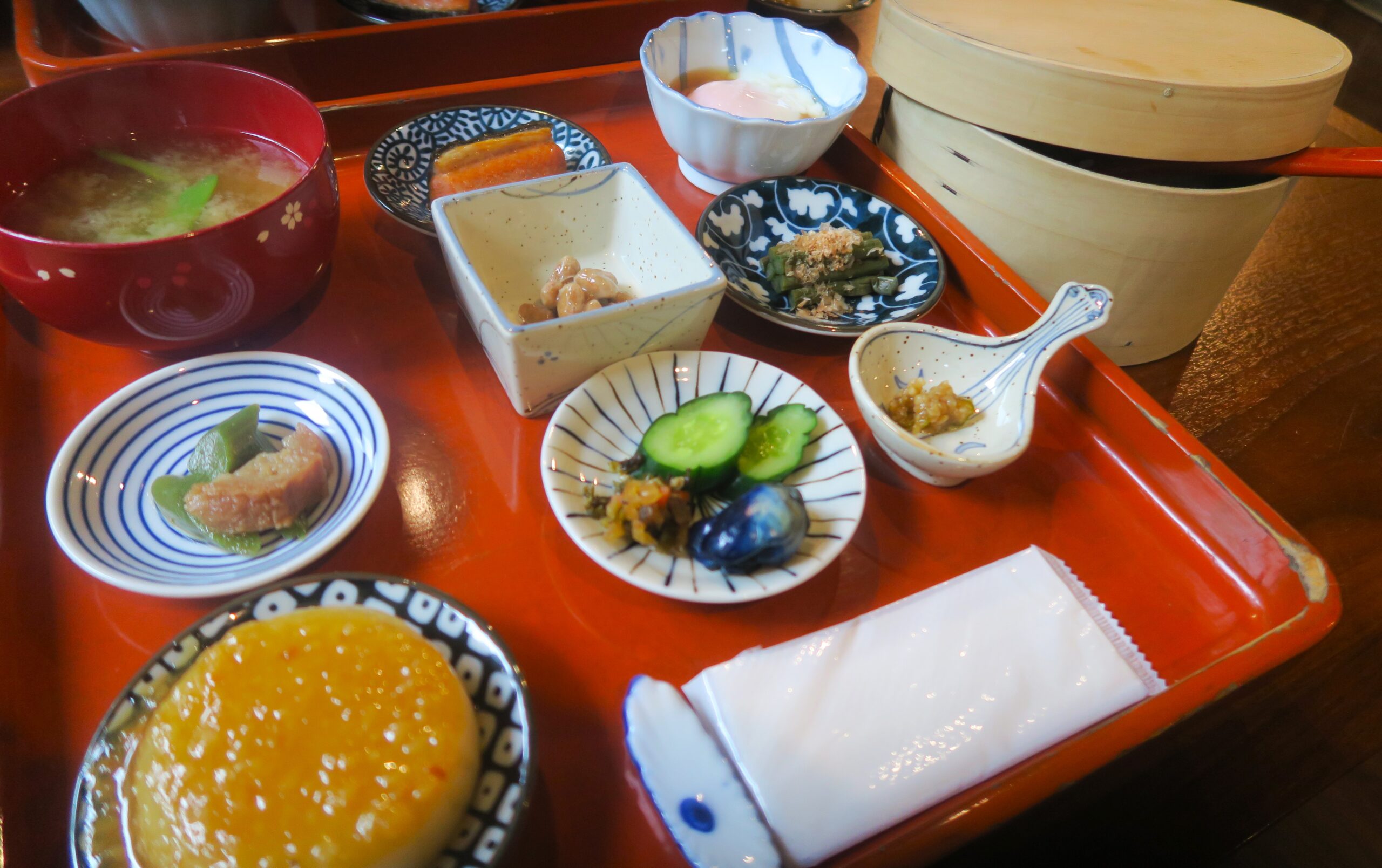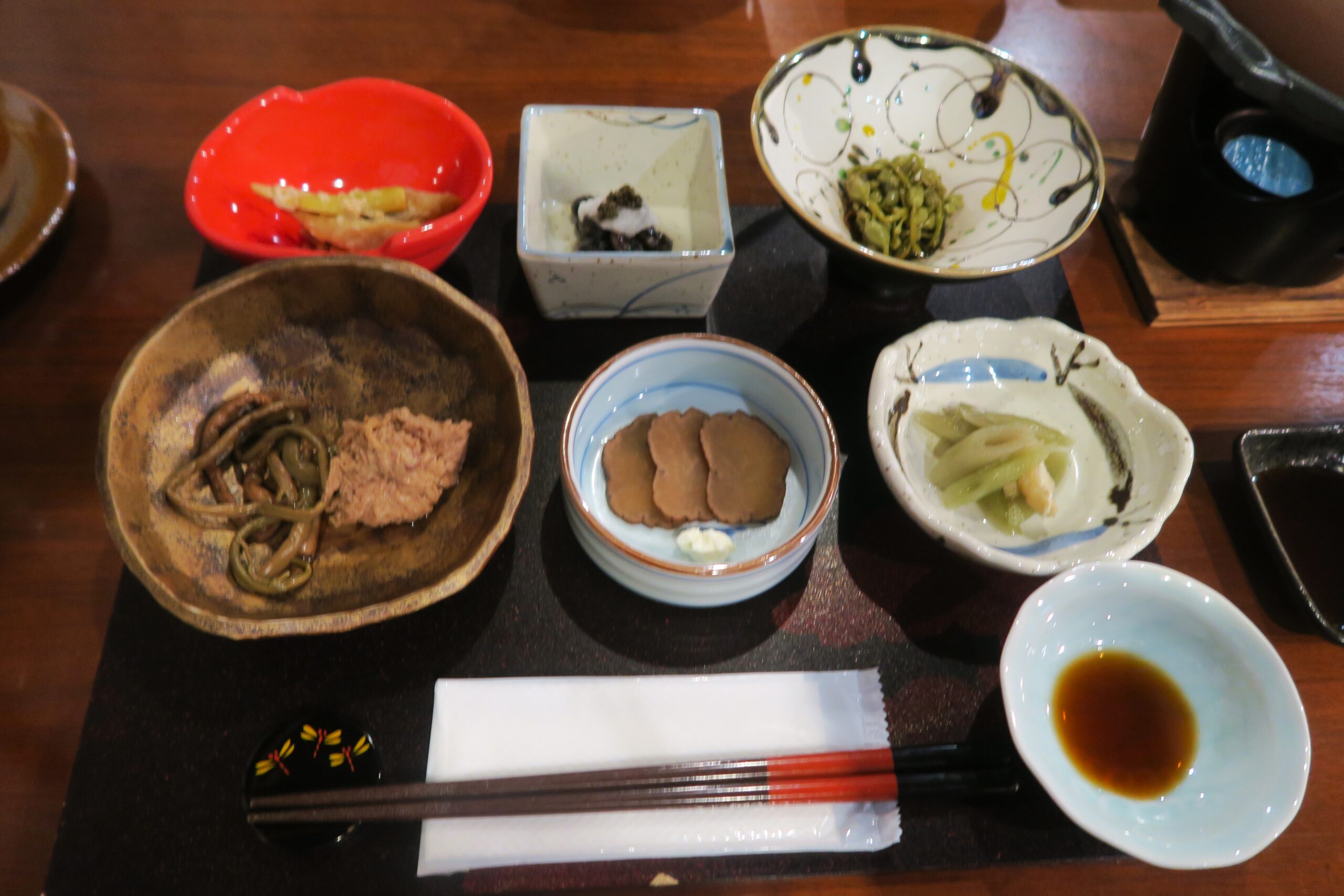食事も魅力的で夕食は地元で採れた山菜や湯沢市特産の皆瀬牛など地元の旨いものが季節ごとの多彩な料理で堪能できます。食前酒が湯沢の酒蔵両関で、前菜に“いぶりがっこ クリームチーズ添え”“日本一高級な納豆屋の黒豆納豆やまかけ”“山蕗の煮物”“根曲がり竹の味噌煮”“みずのコブ松前漬け”“ぜんまい一本煮”“鯉の卵煮”の7品