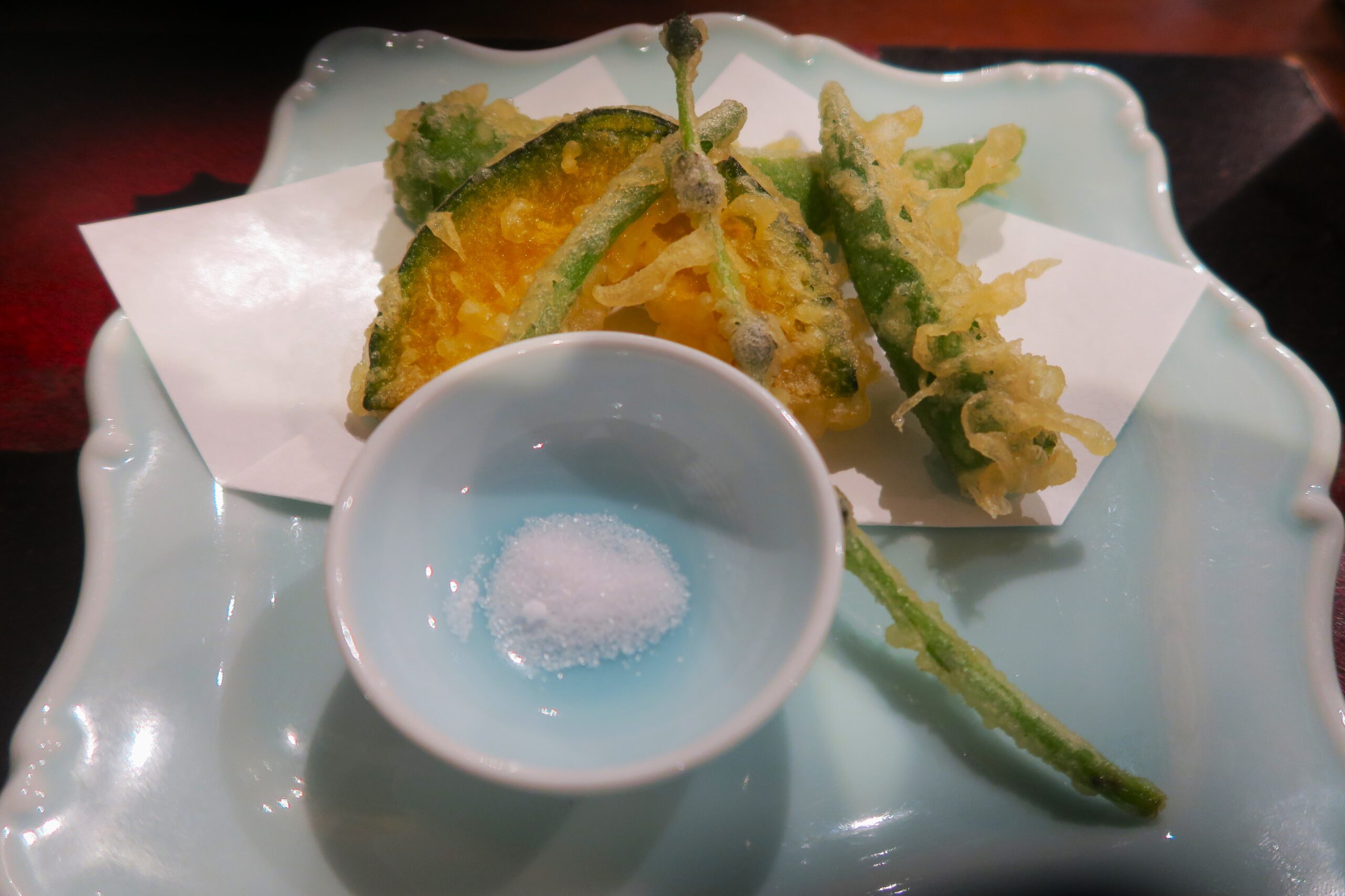 “本日の揚げ物”は、ししとう、オクラ、かぼちゃにみずのコブといった揚げたての山菜の天ぷらを藻塩でいただきます。