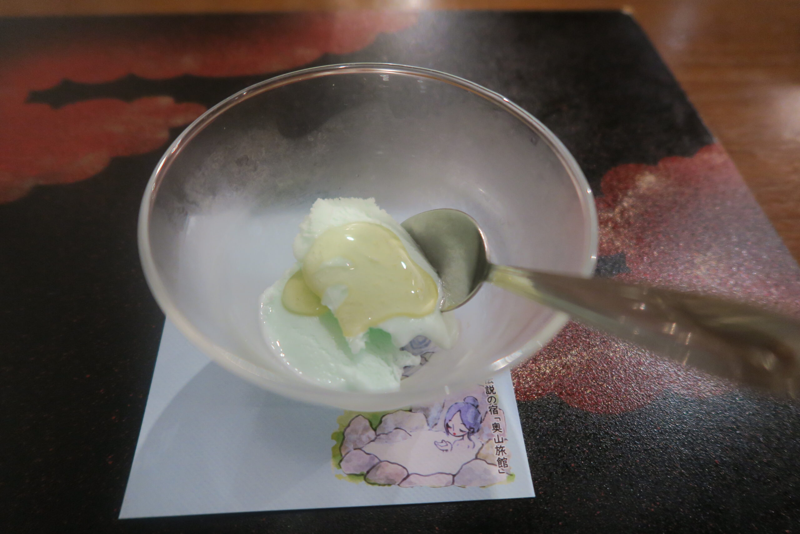 最後にデザートは“ナガハマジェラート 男鹿塩マーレ トチ蜂蜜かけ”の全16種類もの品々がタイミングよく出来立てで運ばれてきます。ここまでの夕食の卓にはさりげなく敷かれたランチョンマットが料理を引き立てています。ほかにも箸や箸置きにも川連漆器を使用。川連漆器は鎌倉時代、武具に漆を塗ることから始まったとされます。
