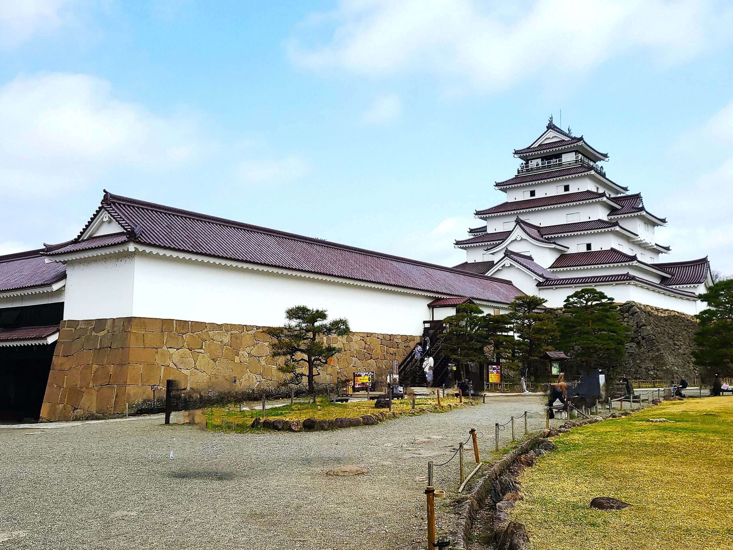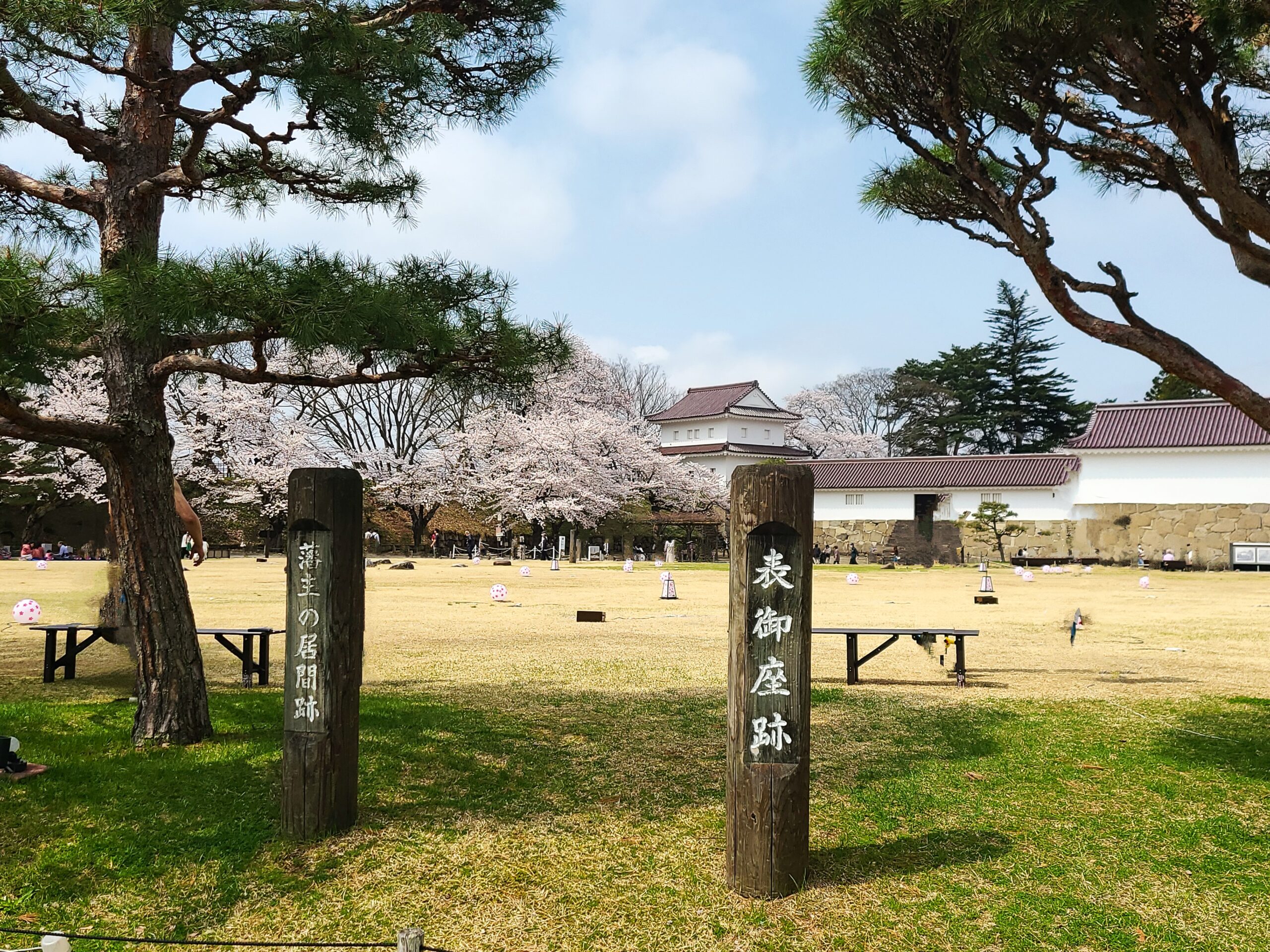 御三階跡付近から見た大天守。松の木と白壁と赤瓦のコラボがまた桜とは違って素敵です。御殿を挟んで天守の反対側に本丸内唯一の高楼建築で三階建ての「御三階」が建っていました。藩主の御休息の間のすぐ背後に位置し、限られた人しか近づけなかったと考えられます。戊辰戦争でも焼失することもなく現在は城下の阿弥陀寺の本堂として移築されています。