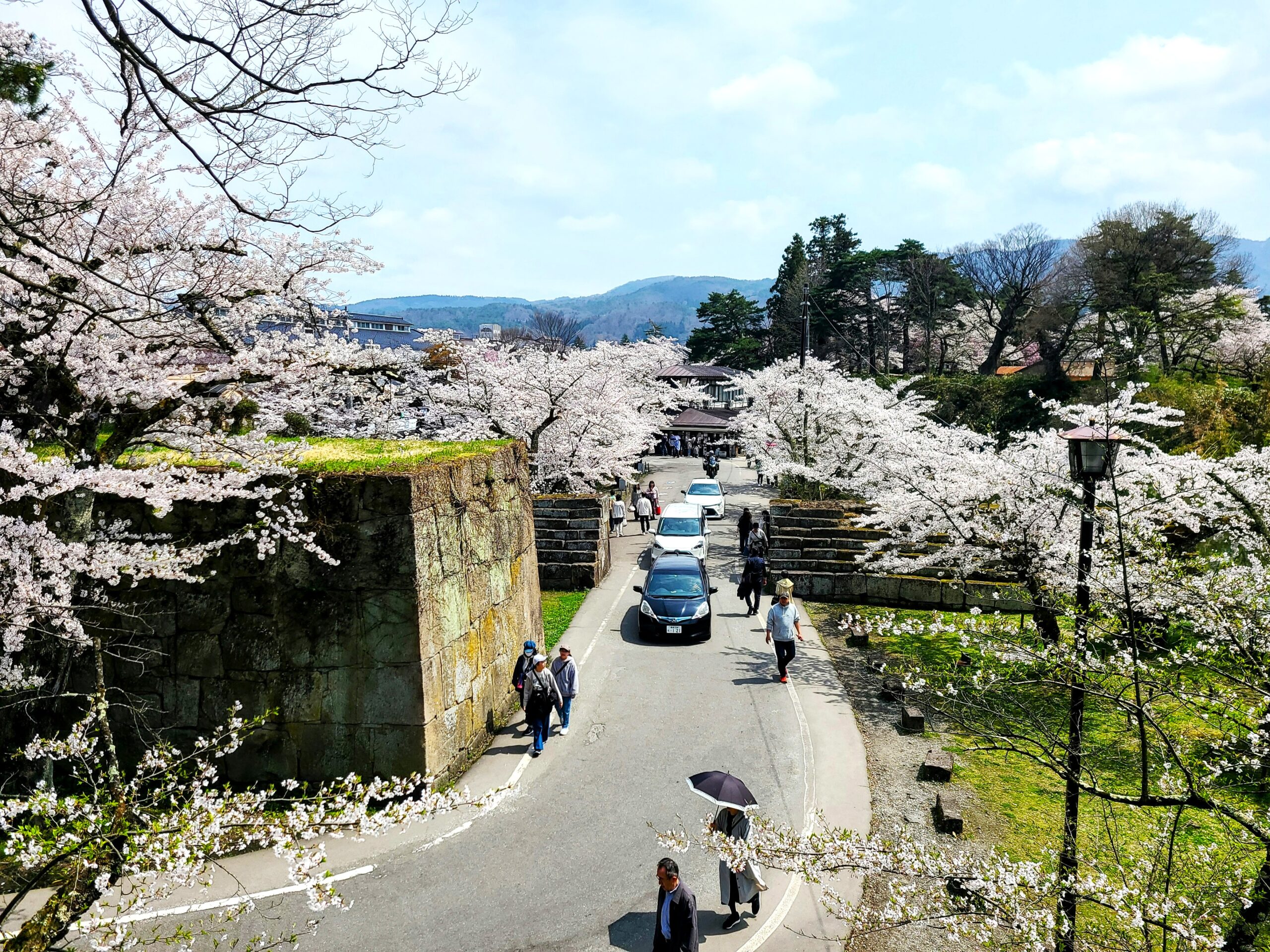 盆地特有の気候からか、会津の冬は長く厳しい。その季節をじっと耐えて咲くからこそ、この地の桜は美しいのかもしれません。会津人の気質にも通じるような、気高さや強さが宿っているようにも感じます。会津若松の桜名所として一番に挙がるのは、やはり鶴ヶ城(会津若松城)でしょう。幕末の戊辰戦争で、籠城戦の舞台になるなど、会津の激動の時代を見続けた城です。真っ青な春の空の下、純白の漆喰壁に赤瓦を葺いた天守閣が誇らしげな南東北の雄都・会津若松のシンボルにふさわしい威容は、難攻不落の名城と称えられます。城の天守を取り囲むように、春は約1000本のソメイヨシノがいっせいに咲き誇りまるで桜の海に浮かんでいるような情景になります。石垣の上から眺めたり、天守の最上階から見下ろしたり、さまざまな角度から桜と城の風景を楽しみます。