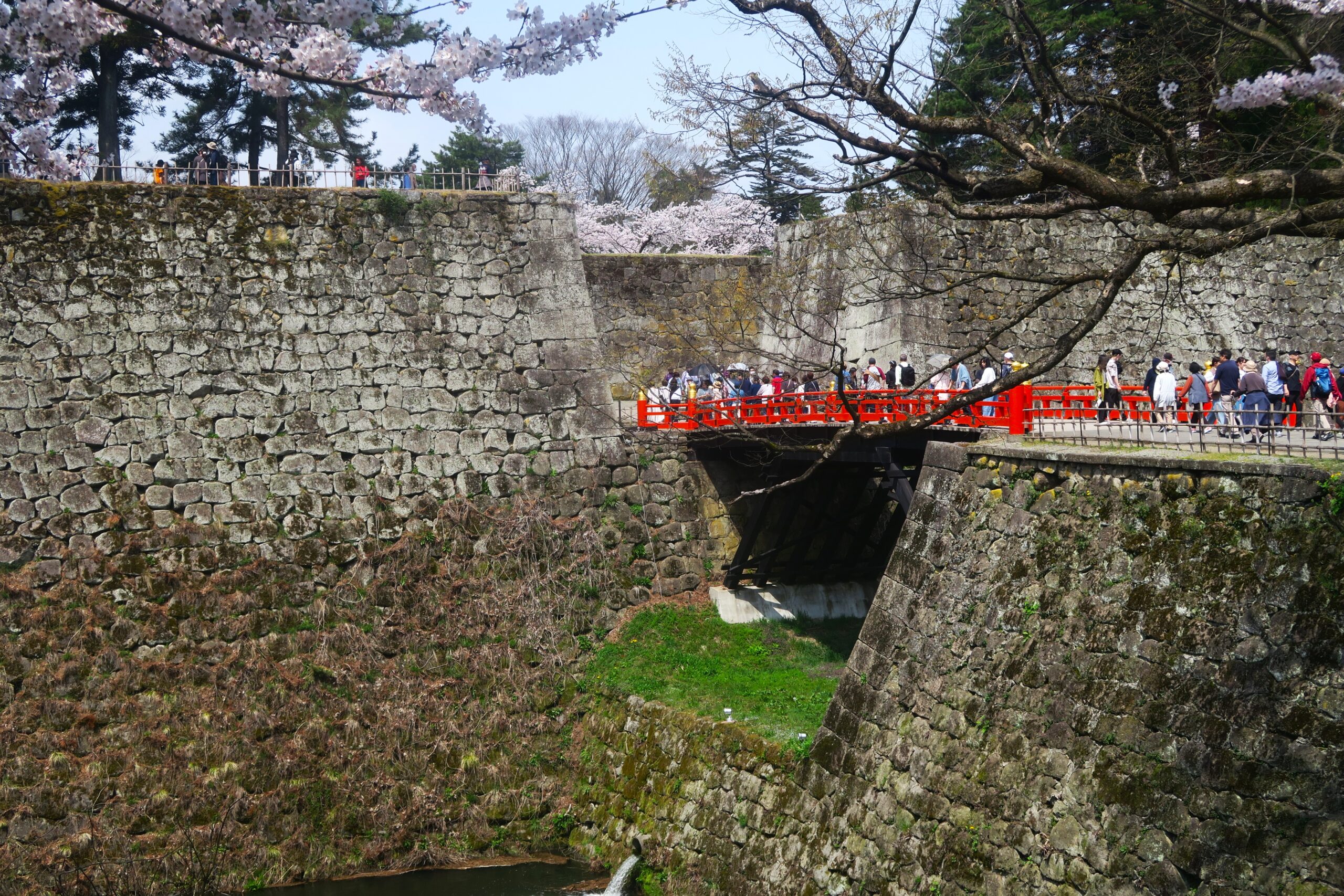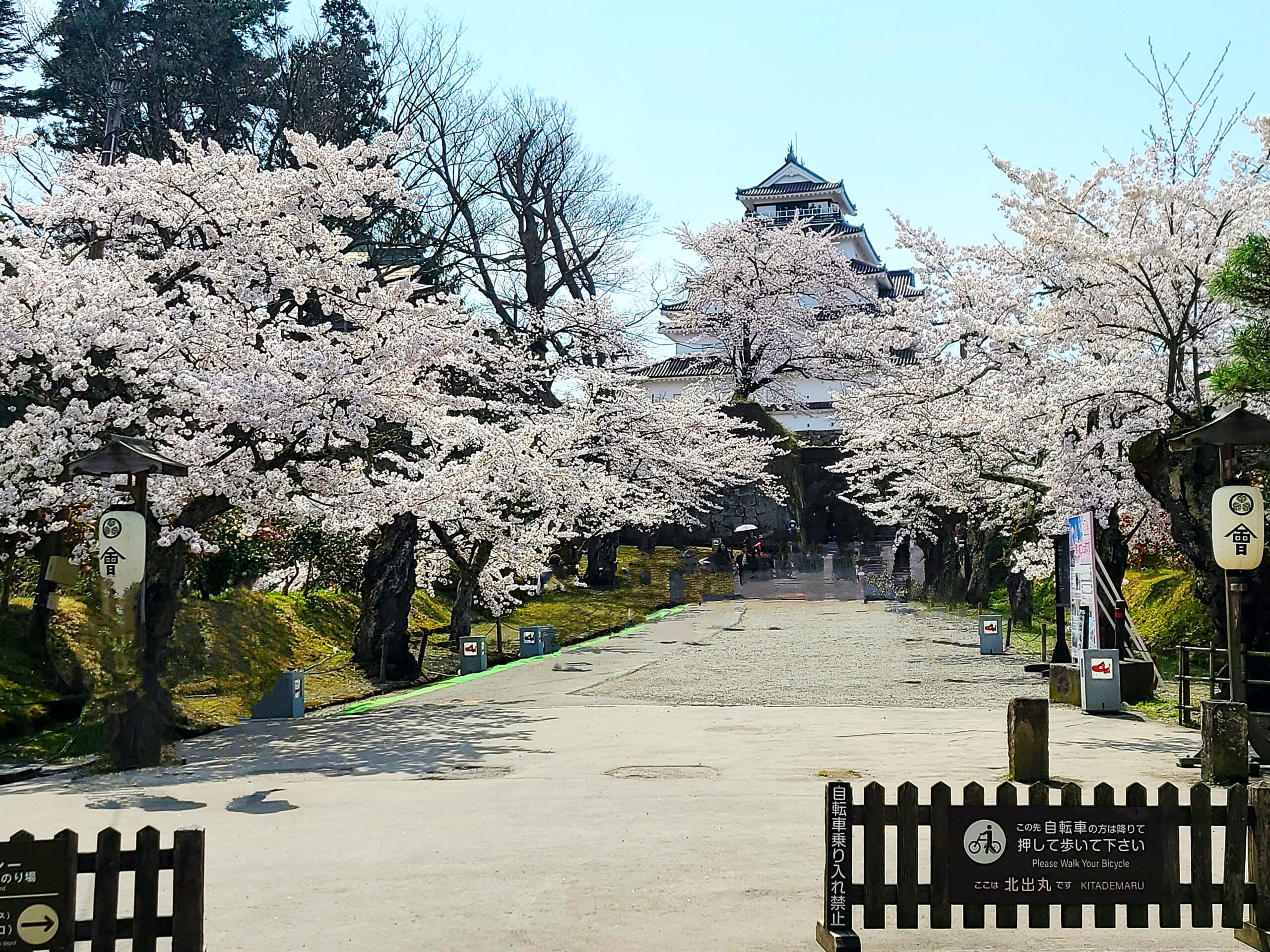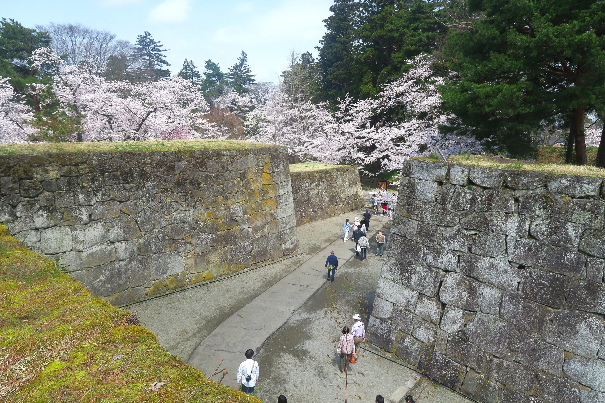 鶴ヶ城へは3通りあります。ひとつは車を東側の東口P(129台)に停め三の丸、二の丸を通って廊下橋から本丸へのルート、2つ目は北側の鶴ヶ城会館臨時Pに停め北出丸大手門跡から太鼓門跡をへて本丸へのルート、3つ目は会津葵本店(菓子店)の交差点から一方通行の道を北出丸を通って西出丸P(170台)に車を停め本丸へ向かうルートです。車の場合は西出丸がおすすめですが、新政府軍の攻城進路を体感できる北側がおもしろいです。従来は小さな馬出だったこの場所を加藤明成が北出丸に改築し、本丸の北側を守る拠点としました。北出丸は東を伏兵郭、南を本丸、西を西出丸に囲まれた場所で、ここに進入した敵を三方から殲滅する堅固な造りで別名「みなごろし丸」と呼ばれました。新政府軍は城の北出丸まで攻め入ろうとしましたが、直方体の石で形成されたくい違い虎口と内側を上り石垣の上から敵を銃撃できる大腰掛や、濠向かいから銃撃できる伏兵郭など、敵をいろいろな方向から攻撃できる造りになっていて侵入を許しませんでした。写真は北出丸大手門石垣上からみた北出丸大手門跡