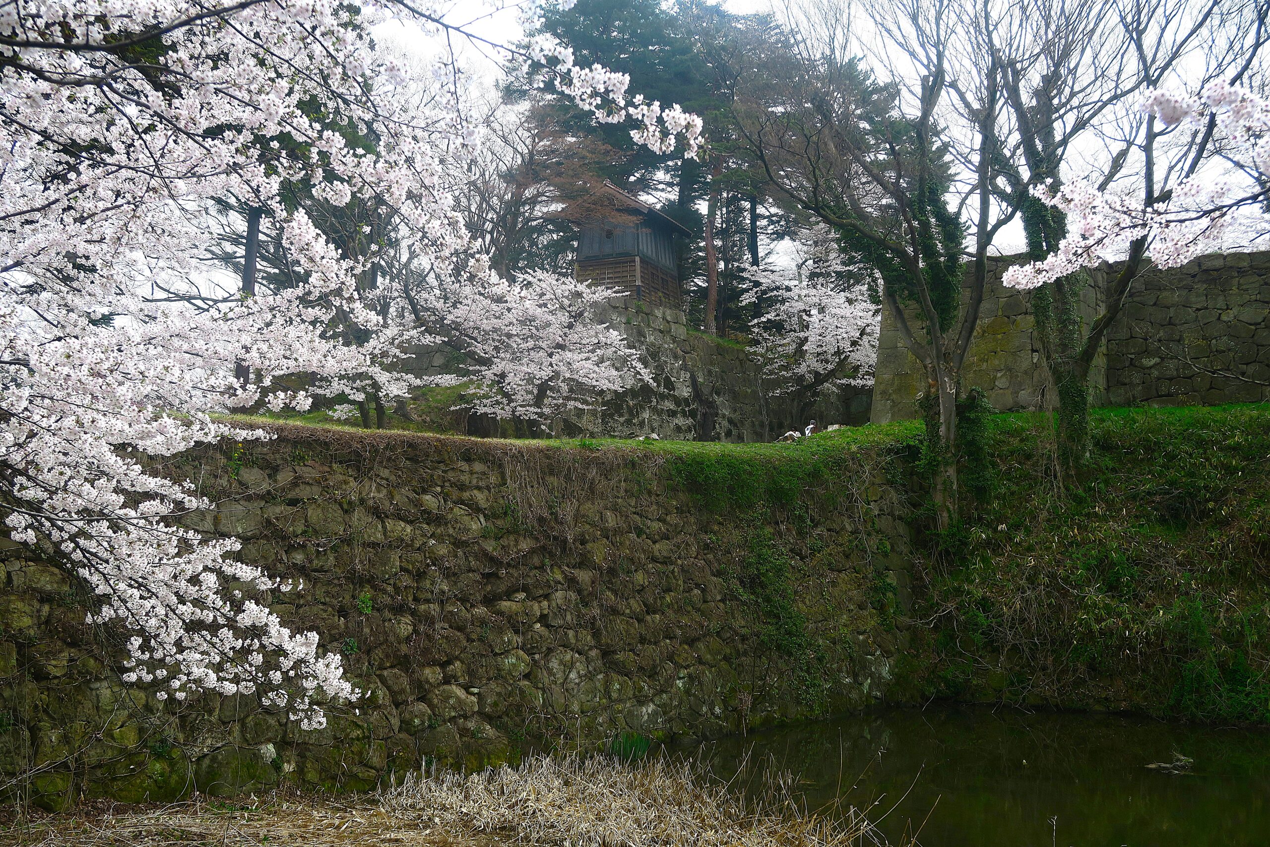 一方城内一の高さを誇る本丸東側、五軒堀の石垣は、加藤明成が改修したもので急傾斜で隙間なく積まれた打込接です。