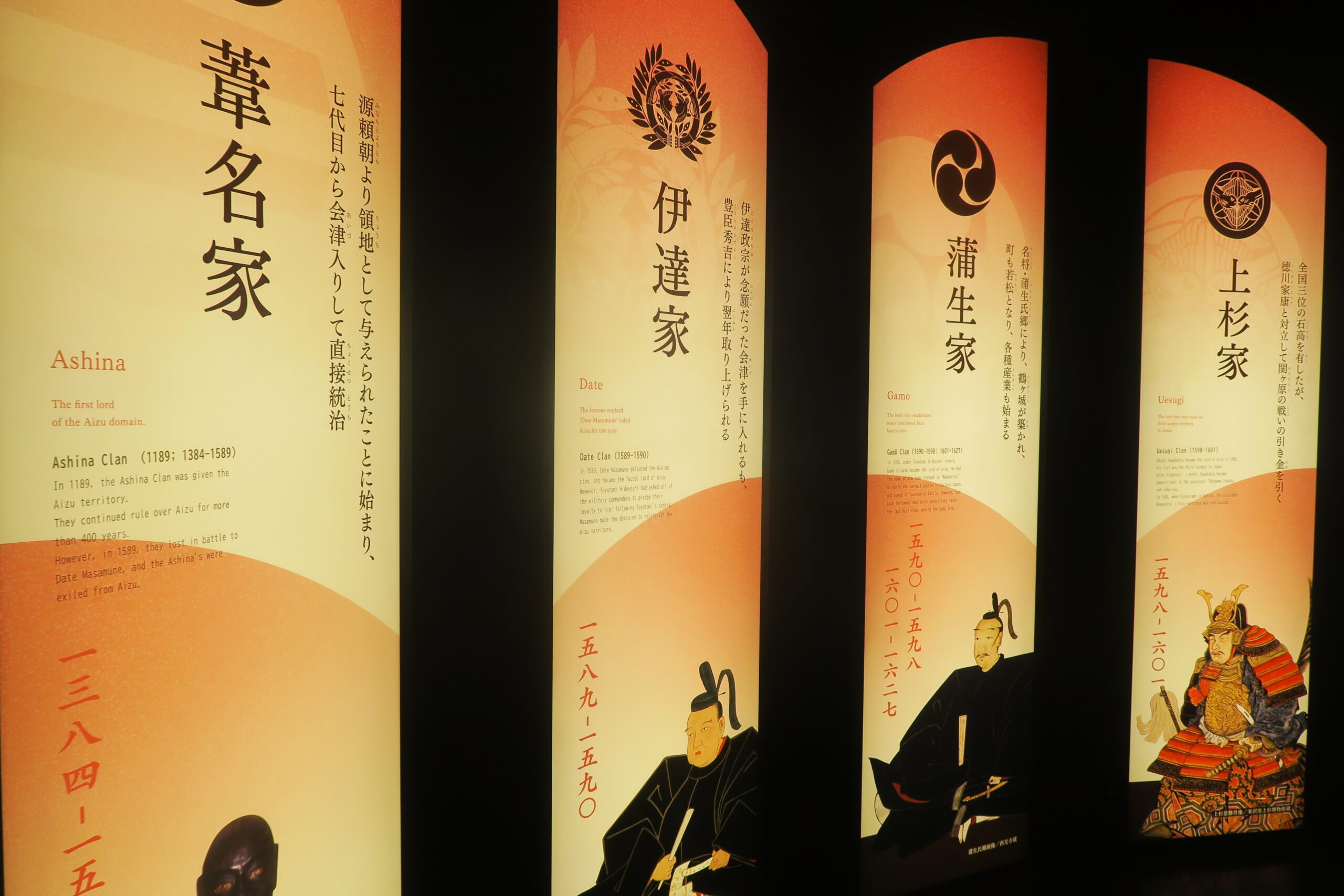 2層の鶴ヶ城ヒストリーコリドーでは、領主の変遷と国づくりをテーマに歴代の領主や領主にまつわるエピソードを資料や観光情報で紹介しています。3層では幕末の動乱と会津を展示。モニターと音声で戊辰戦争を解説し、五感で追体験します。