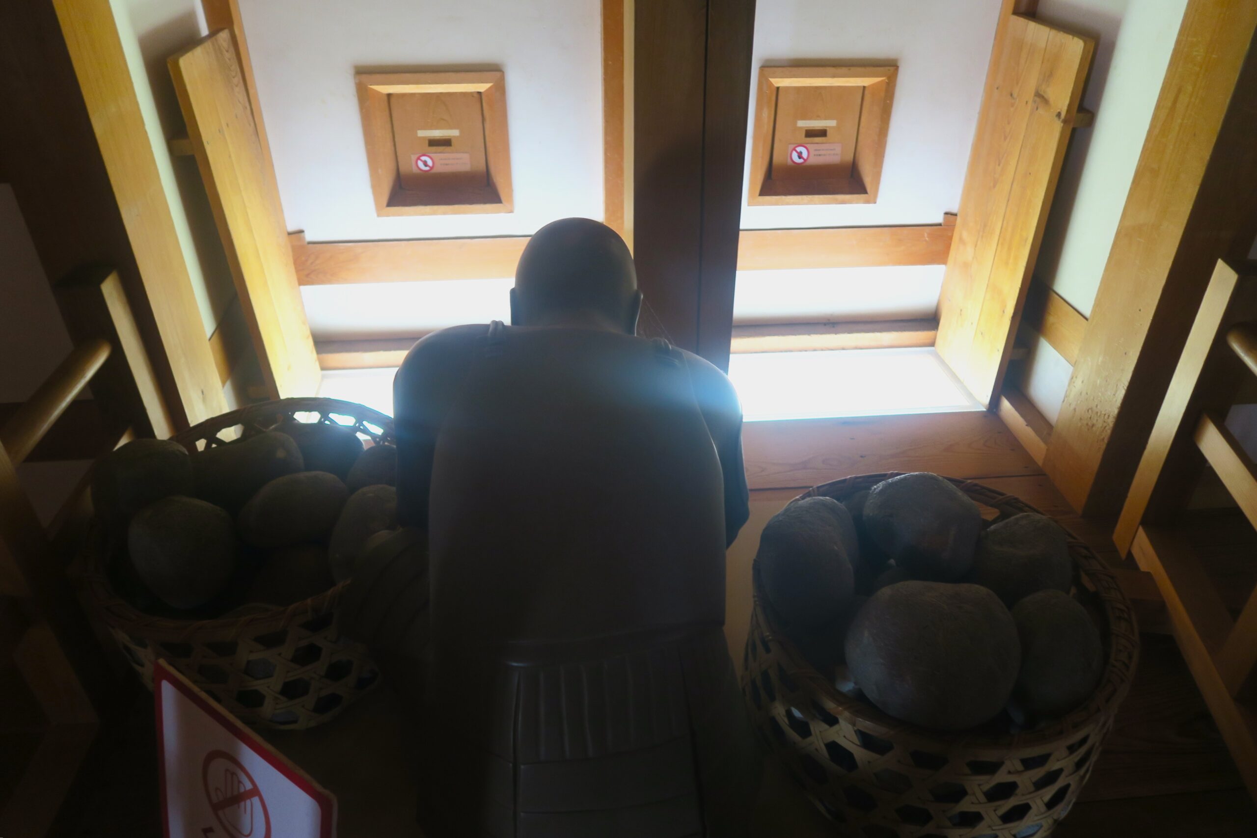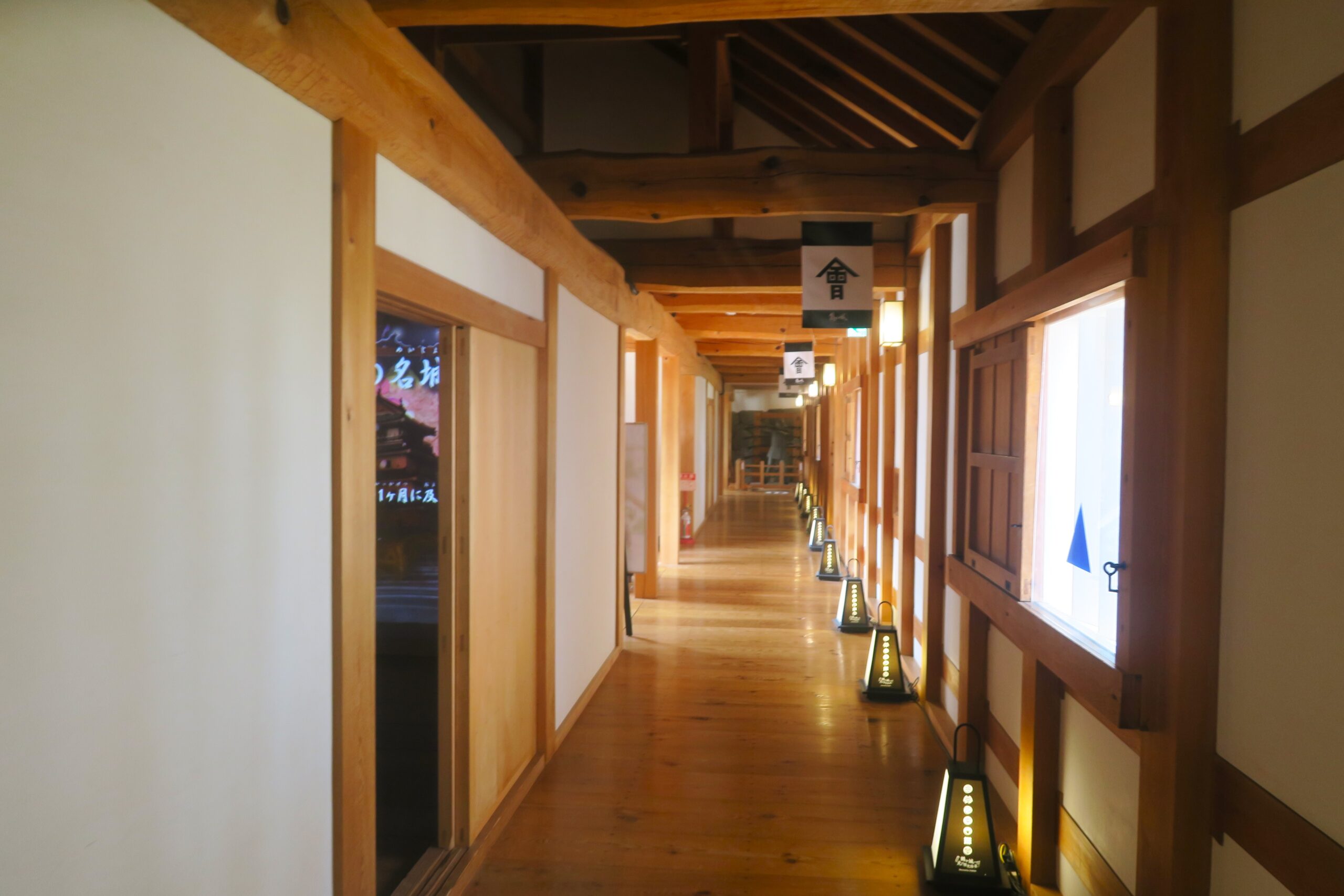 木造復元された南走長屋は長い廊下と小部屋が延々と続き、各部屋にはちょっとした展示コーナーが設けられています。一番奥が南走長屋と干飯櫓の接続点。階段の上が櫓で鉄砲狭間から銃を構える等身大人形が展示されています。泥人形なので逆にリアルです。