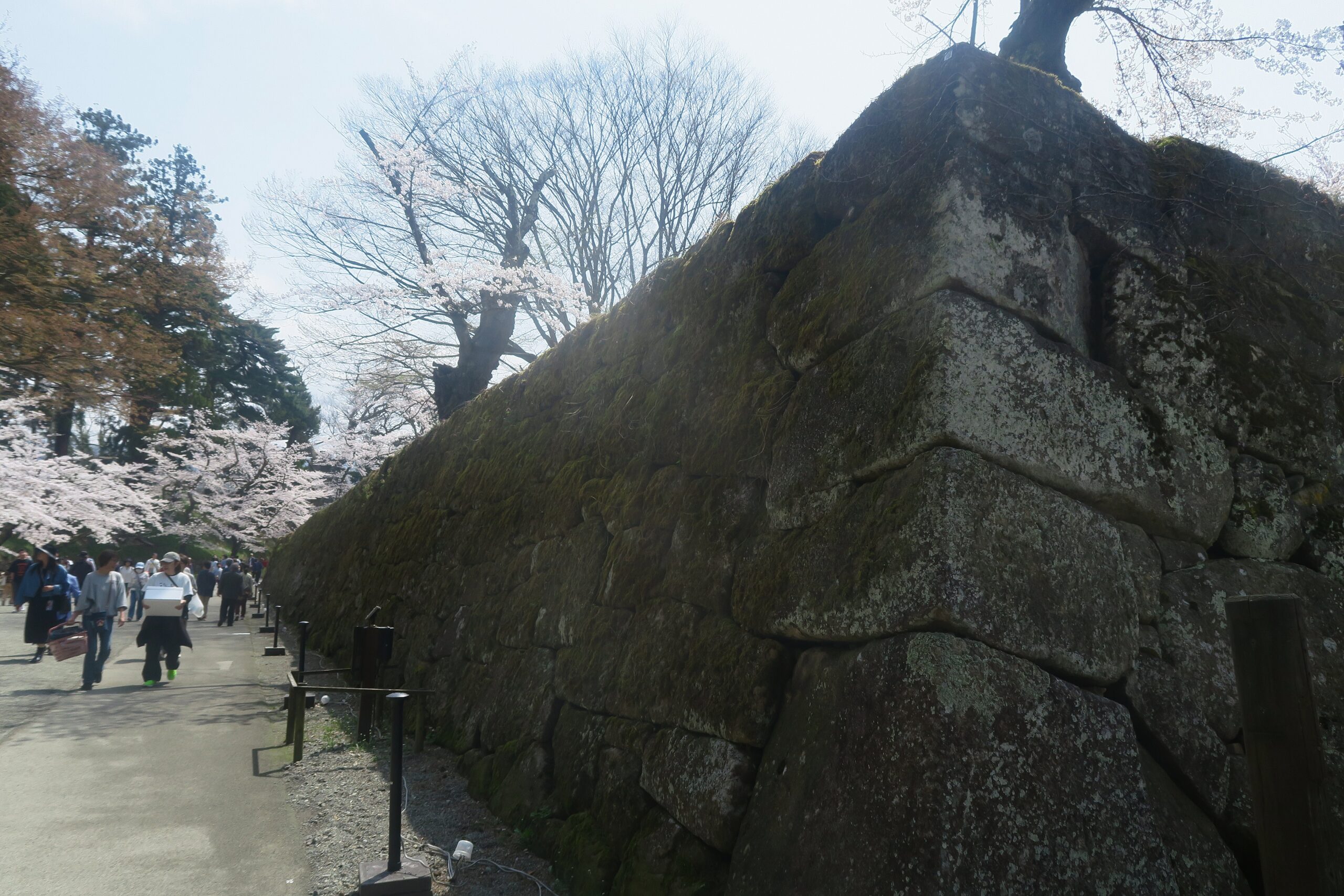 埋門まで戻り本丸外周の帯郭へ。東へ伸びる石垣に沿って歩いて廊下橋に向かいます。がっちりとした打込接の石垣は適度に苔むしていて時代を感じます。