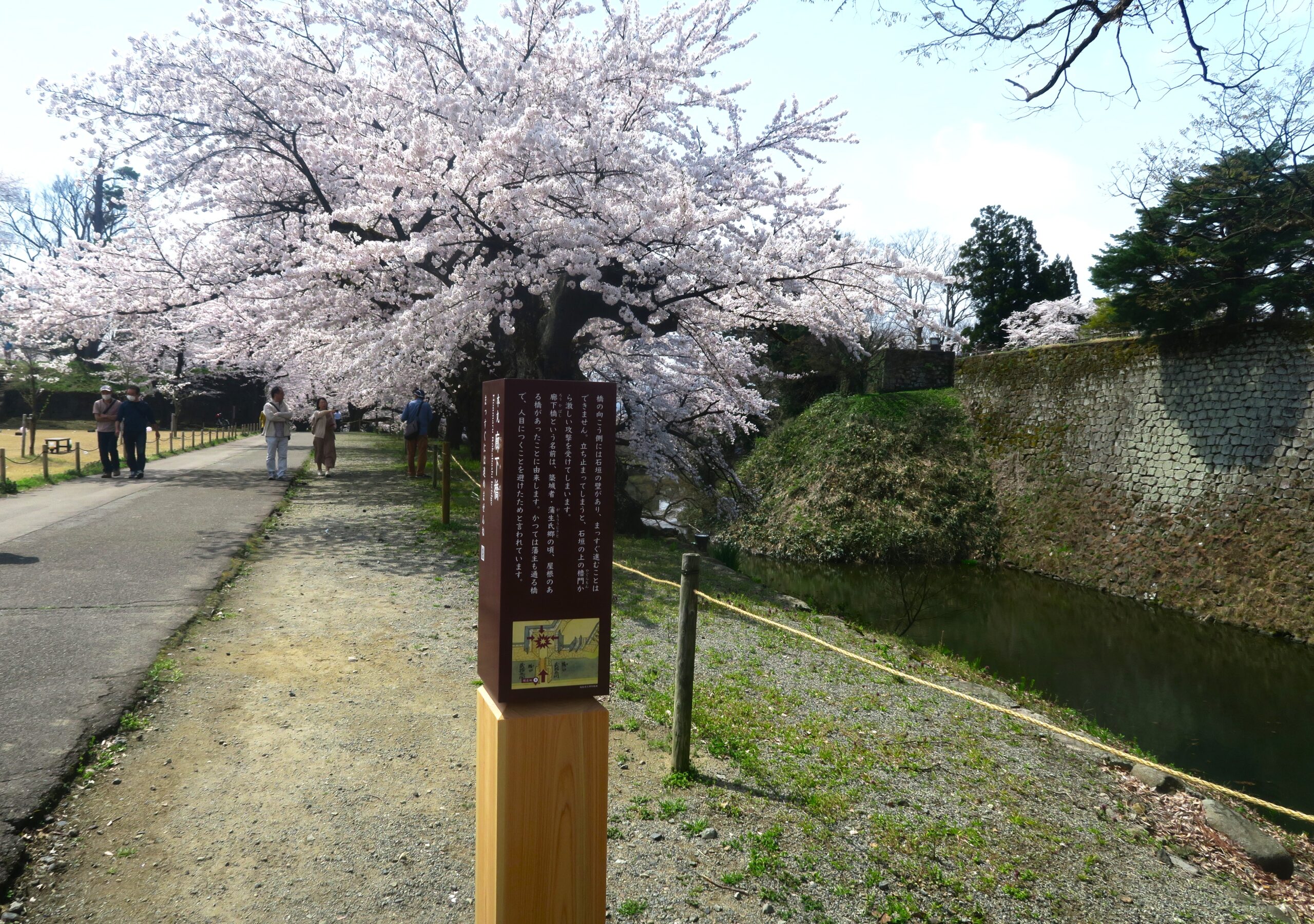 本丸入口、太鼓門跡です。北出丸から本丸に通じる鶴ヶ城の大手門(追手門)にあたり、石垣の上には多門櫓と呼ばれる櫓が建てられ、中には直径5尺8寸(約1.8m)の大太鼓を備え、藩主の登城や非常事態、その他の合図に使用したことから太鼓門と呼ばれました。右手石垣の中ほどに大きな鏡石があります。鶴ヶ城の石垣で最大の直径2m、奥行き3m、重さは8tの「遊女石」と呼ばれる大石です。男衆の士気を高めるために遊女を乗せて運んだといいます。鏡石は、姿を映した妖怪が自分の風貌に驚いて逃げ帰るように置いたものとか諸説さまざま。