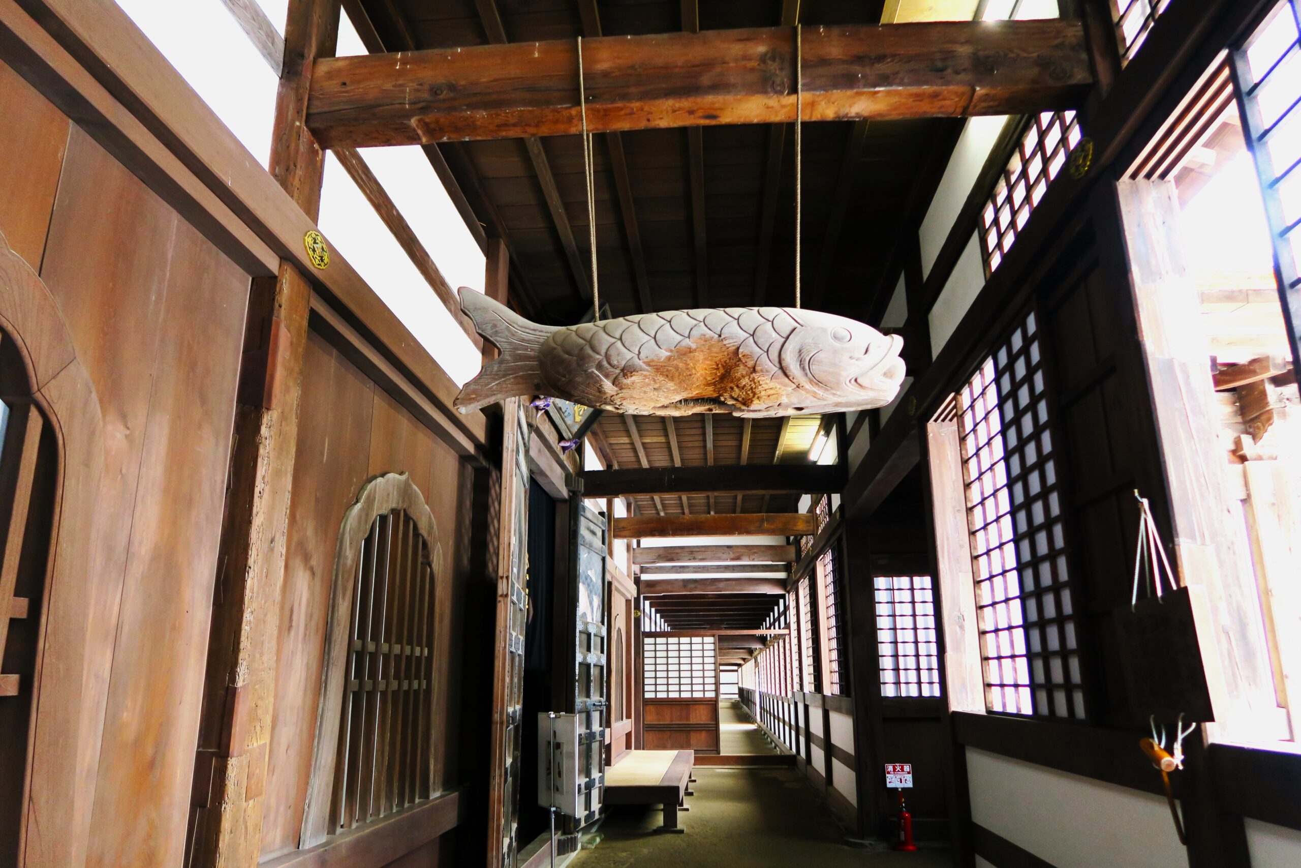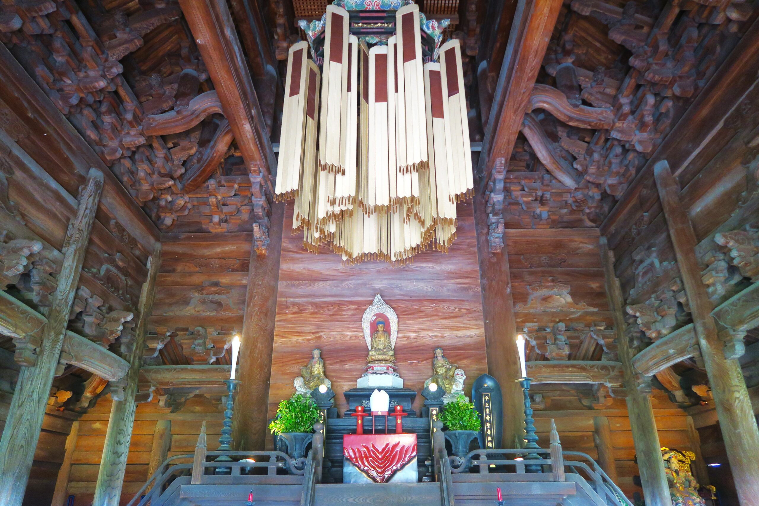 圧巻は内部で見上げる天井です。高さ6尺の須彌壇、創建当時の天蓋などがあります。須弥壇上には中国明代の本尊・釈迦如来・脇侍に文殊菩薩と普賢菩薩、後方に達磨大師像などが安置されています。上層軒組は禅宗建築の純粋な形式であり、屋根裏には、天井絵が流行した時代、山上善右衛門嘉廣は天井構造に技の粋を凝らしました。扇垂木や美しい曲線を描く“エビ虹梁”など複雑な組物でありながら乱れのない丹精な極上の工芸品、見えないような高さにも、獏などの彫刻が施され執念さえ感じる。ずっと見上げ続け、ふと外に目をやると広々とした境内に植えられた一面の芝から時折吹き抜ける風が気持ちいい。