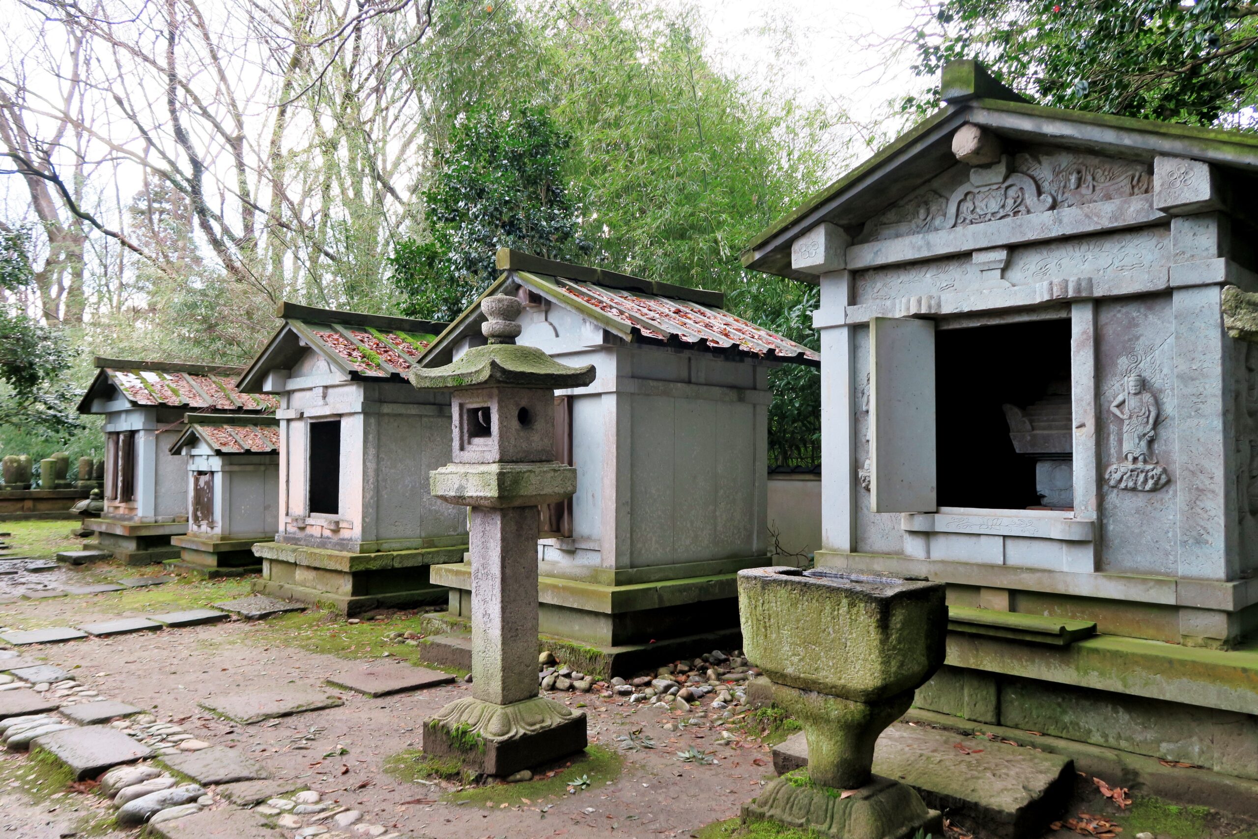 西南部回廊裏にある瑞龍寺石廟には、前田利長、利家、織田信長とその側室(正覚院)、長男信忠の五基の廟が並んでいます。前田利長公は本能寺の変後、織田信長公親子の分骨を迎えて、その霊を慰めたと伝わります。利長公の菩提寺瑞龍寺を造営した時、開山広山恕陽禅師が利長公親子も加えて同じ形式の五基を建造したのが、この石廟の由来です。廟の石材は淡緑色の凝灰石(俗称越前笏谷石)を用い壇上積の基礎の上に立つ切妻型石廟建築です。廟内の宝篋印塔は越前式の月輪装飾を施したもので、越前の国を源流とし、加越能三国に分布している。石廟は向って右から前田利長公、前田利家公、織田信長公(利長夫人王泉院は織田信長の四女永姫)、織田信長公側室(正覚院)、織田信忠公のもので、中でも利長公の壁面には二十五菩薩が刻まれています。