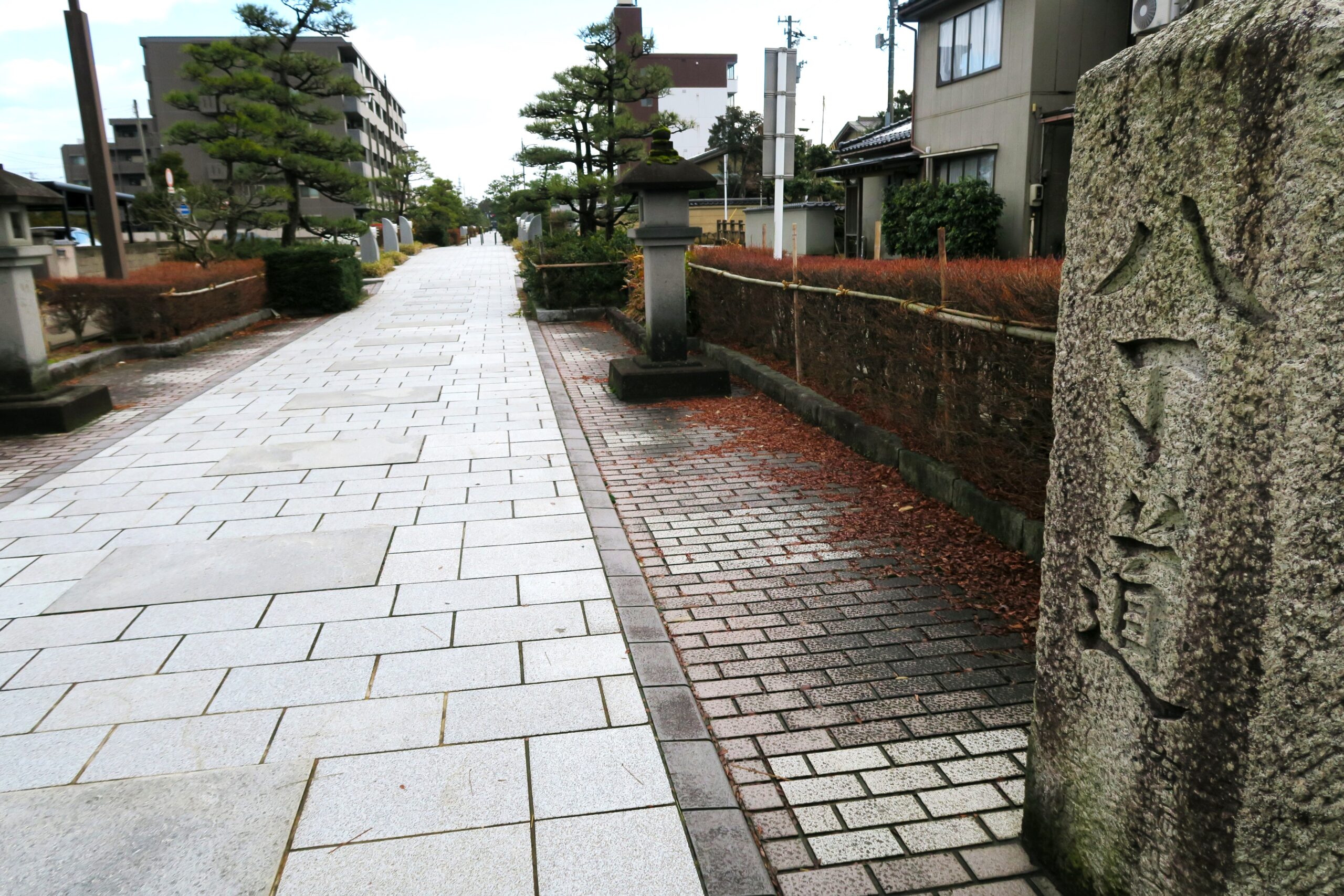 北陸新幹線の最寄駅:新高岡駅とJR高岡駅の間にある国宝「高岡山瑞龍寺」に向かいます。瑞龍寺と前田利長墓所とを東西に結ぶ参道を八丁道といい、その長さが約八町(870m)のまっすぐ続く石畳の道であることから名付けられました。参道には高岡の開祖である加賀藩2代藩主前田利長の像も置かれています。