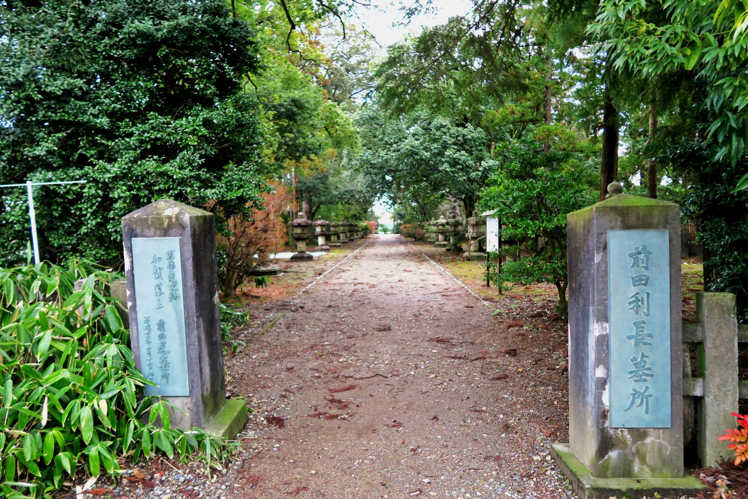 石燈籠に導かれて前田利長墓所へ。3代利常が慶長19年(1614)に53才で生涯を閉じた利長の33回忌に造営されたもので、近世段階の墓域の総面積は約3万3千㎡(約1万坪)と広大で、大名個人墓所としては国内屈指の規模を誇ります。