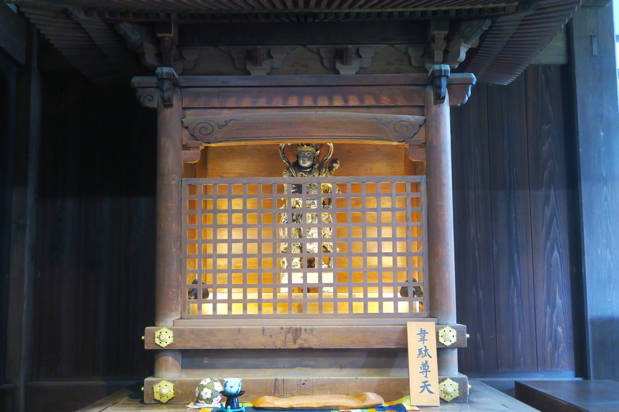 大庫裡は調理配膳や寺務運営を行うお堂。真っ白な天井が漆喰で曲線になり防火と結露に配慮されている。古図面から復元され、すす跡の形から、別の場所に移されていた韋駄天様もここに戻されました。「韋駄天走り」とは、空を飛び釈迦の遺骨を盗んだ鬼から取り返したことから言われます。また食材を集めてくれることから台所の守護神とも言われるようになりました。