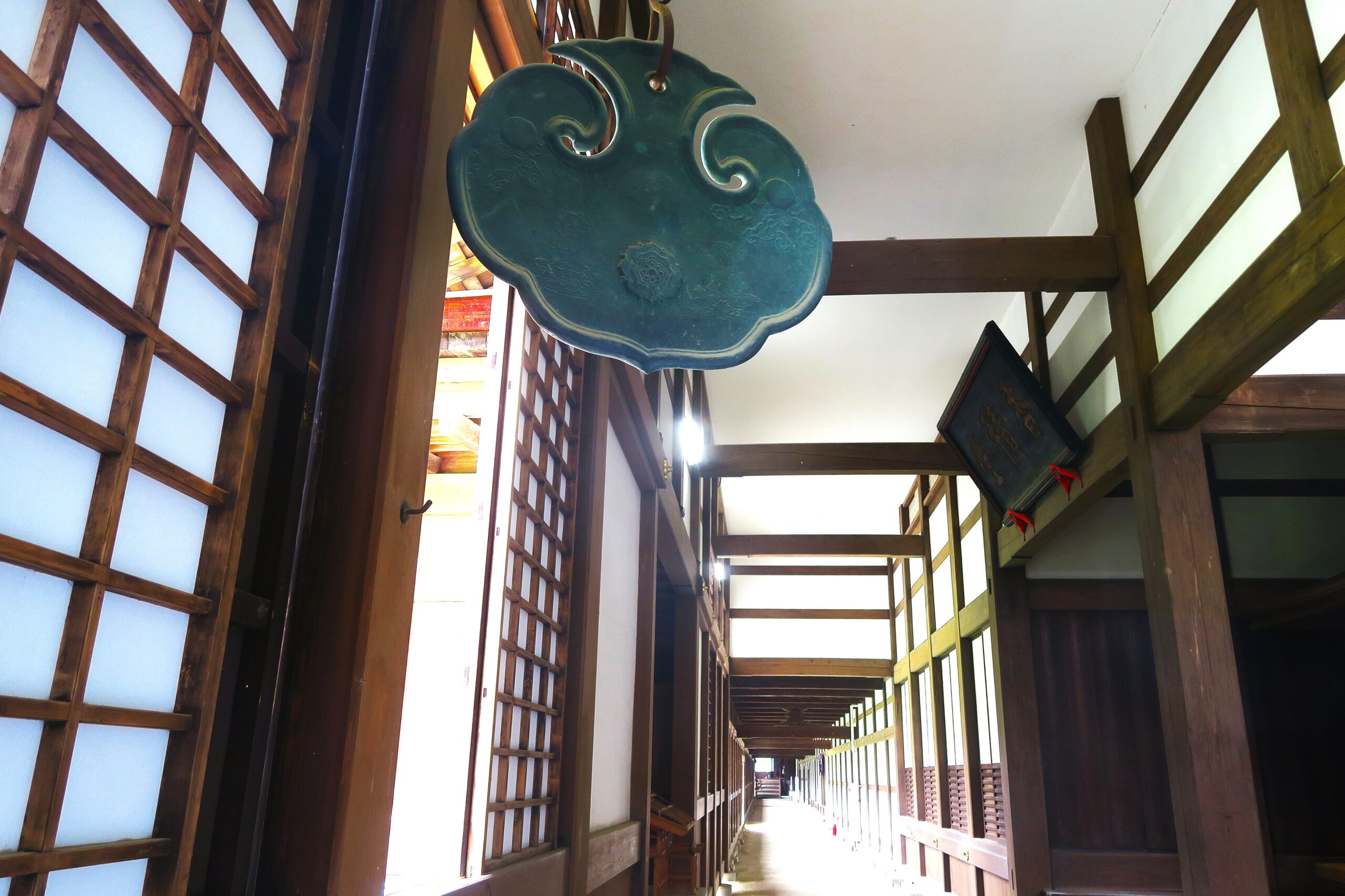 七堂伽藍をつなぎ約300mの円相を描く回廊。窓枠の敷居にうがかれた穴は、材木を腐りにくくするための水抜孔で、棟梁の卓越した技術とモノづくりへの執念に圧倒されます。写真は大庫裡から大茶道に向かう回廊
