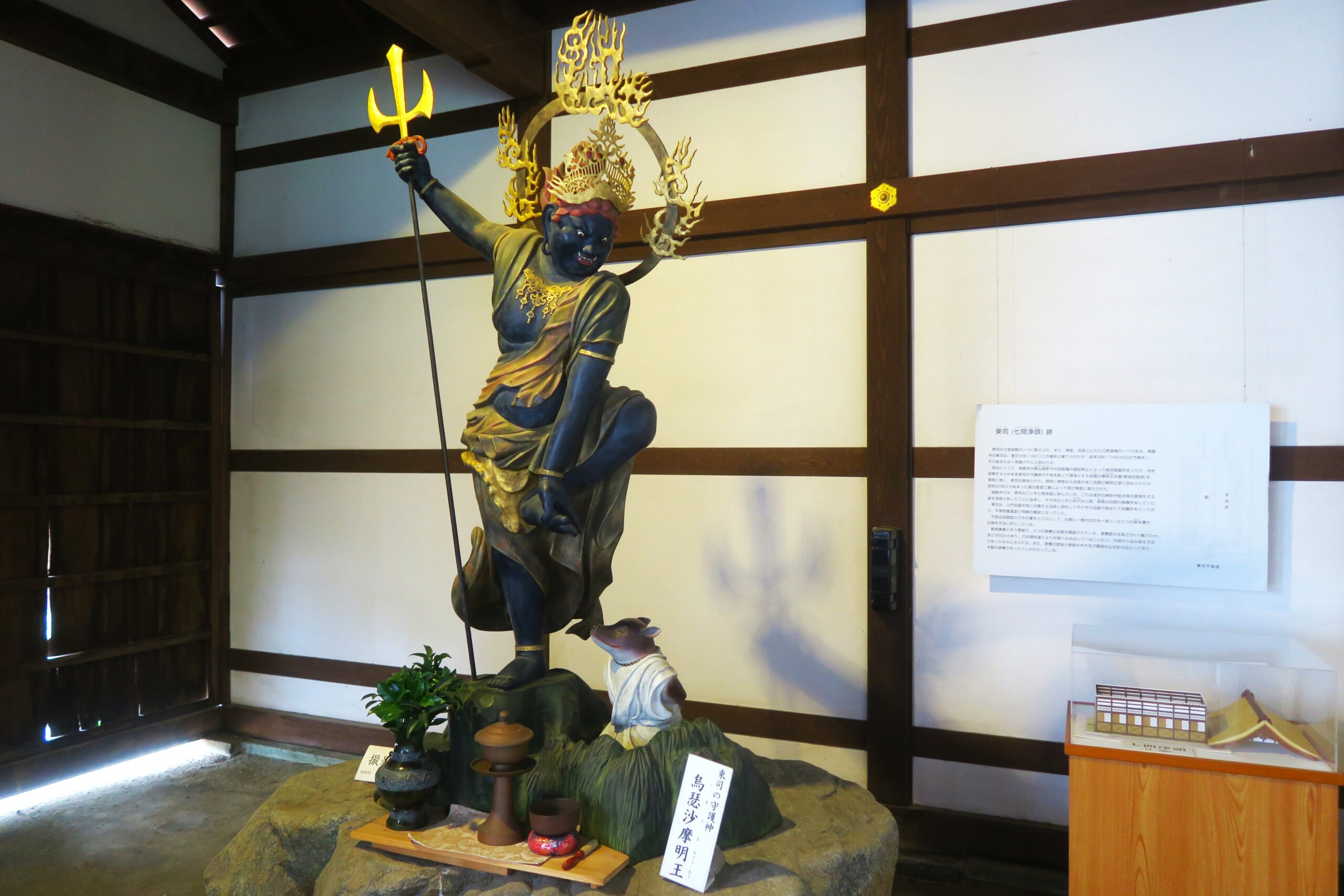 東司の守護神である鳥瑟沙摩明王木像の足元には、お釈迦様の修行の場をいたずらして汚してしまった猪頭天が明王様に叱られています。明王様はその汚物を怒りの炎で清められたことから東司の守護神といわれています。