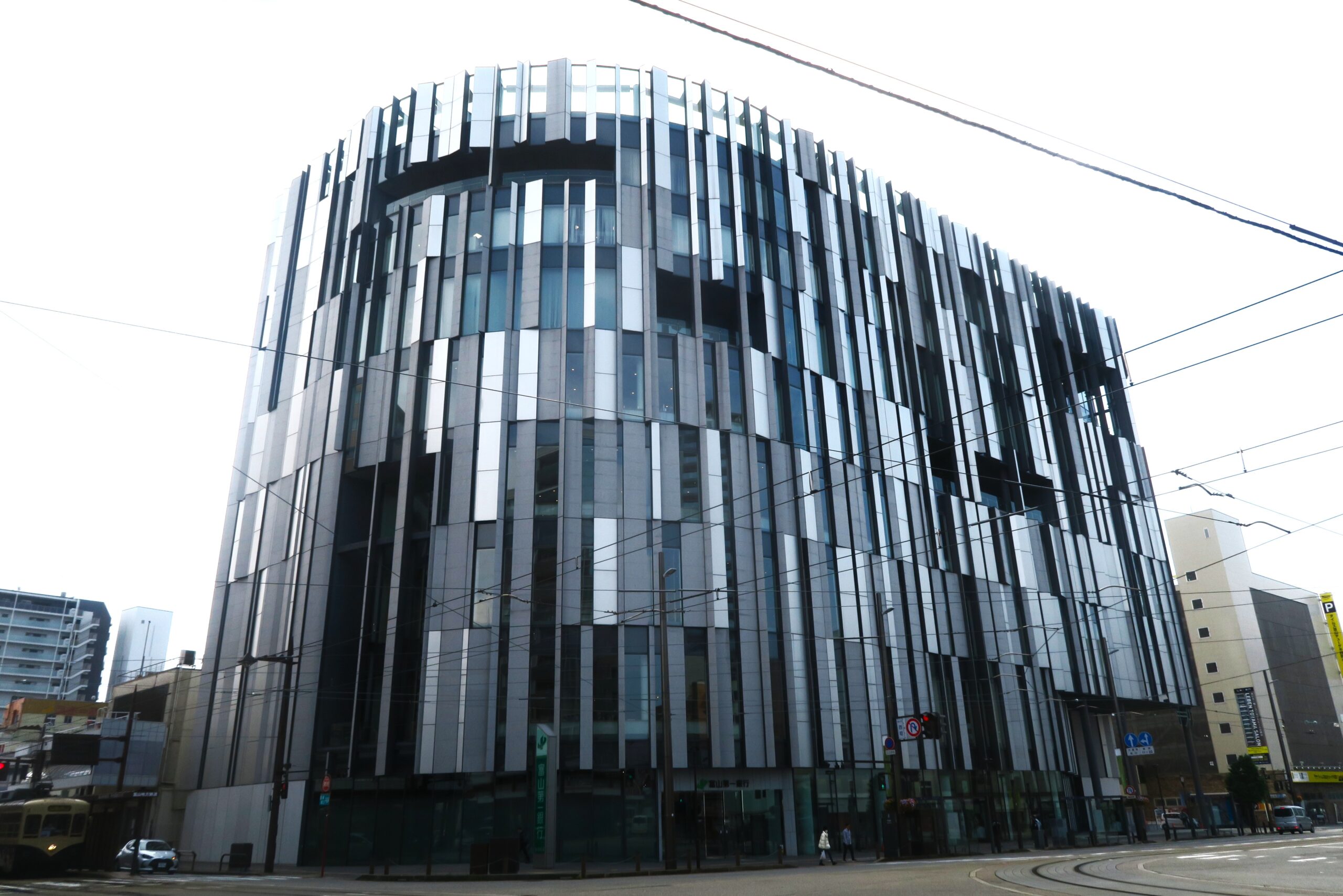 富山市をめぐるには富山地方鉄道市内電車が便利です。富山駅を中心に、富山市の南北や富山大学のある西部を結び市民の身近な移動手段として定着しています。5分から15分間隔で運行され、「一日フリーきっぷ」は観光客にも便利です。公共交通を軸としたコンパクトな町づくりを目指す富山市は、2006年、JRから引き継いだ富山港線を日本初の本格的LRTとして整備、09年には市中心部に環状線が開通、さらに20年に南北の路線がつながるなど、着実に路面電車の整備を進めてきました。富山駅から路面電車で環状線のグランドプラザ前または南富山駅前行き西町電停で下車し徒歩2分、氷の岩脈のようなひと際目立つ外観の建造物が目の前の迫ってきます。