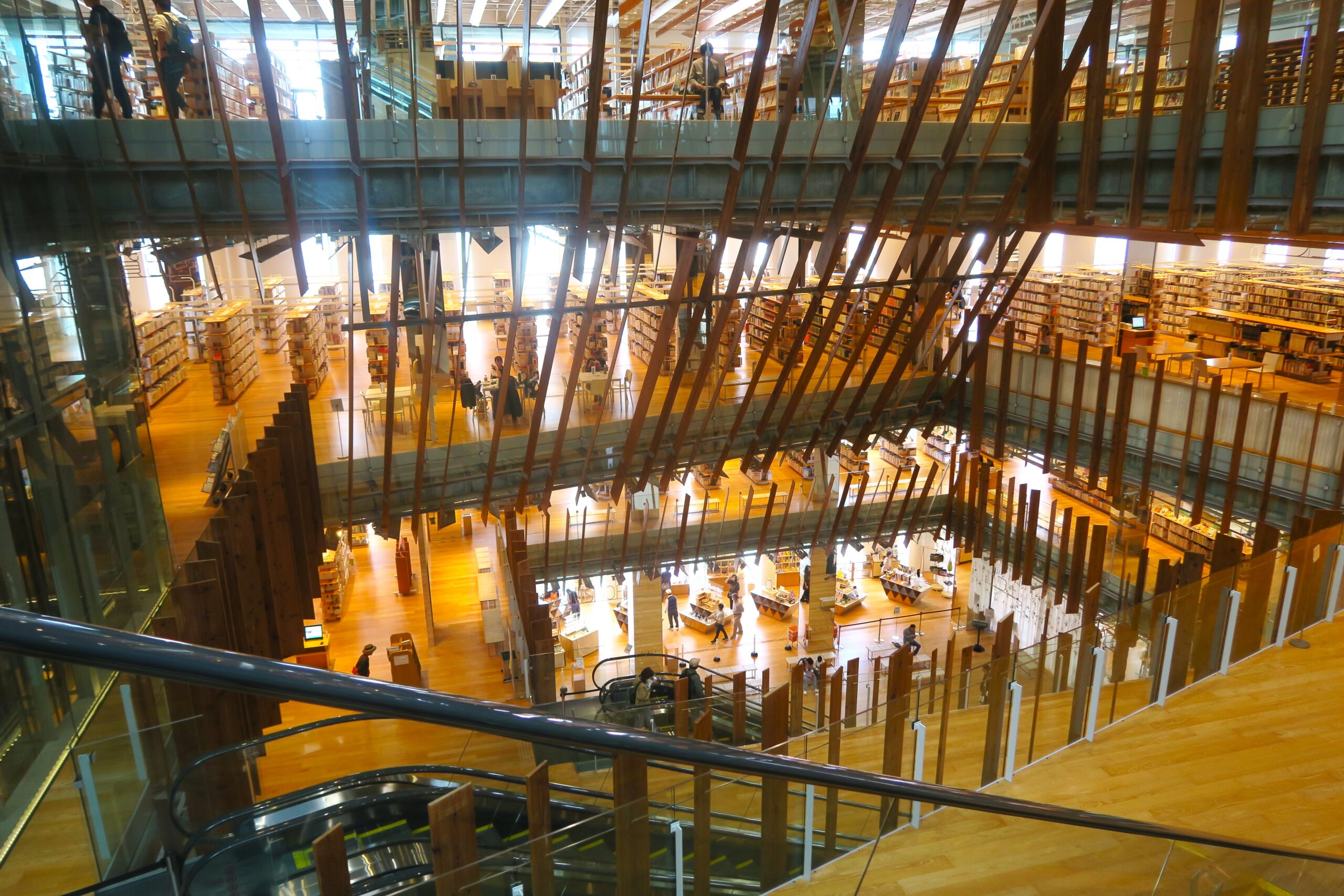 面白いのは、その外観からは想像できない館内の雰囲気。2階から6階までは四角い木枠を回転させながら積み上げたような「スパイラルボイド」と呼ばれる中央を貫く大胆な内部の吹き抜け構造になっています。斜めに大きな光の筒が貫いたような形状で、周囲には県産材の杉板ルーパー(羽板)やガラス、鏡が並び、天窓からの光とともに明るく開放的な空間を創出しています。