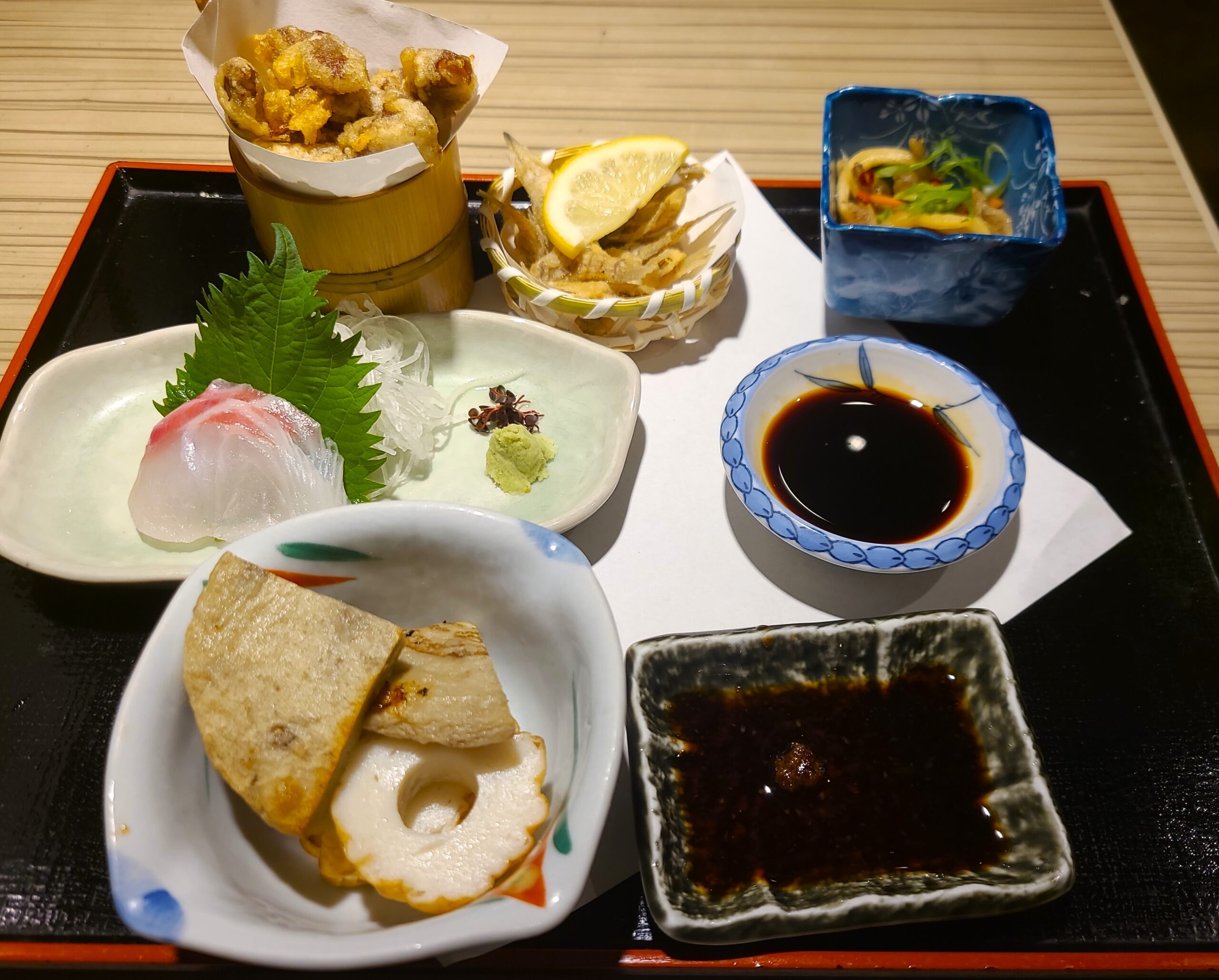 福山の名物・鯛ちくわを作り続けて50年の阿藻珍味営む飲食店「小魚阿も珍」さんすて福山店311へ。「福つまみ6点セット」1580円を注文。「福つまみ」というのは、2020年に誕生した福山特産の食材、「ねぶと」「ちいちいいか」「くわい」「ガス天」「鯛ちくわ」を使った7種類のおつまみの総称。この名称は、「福山のおつまみである」こと、そして「福が来る、幸せな気持ちになれる」とおうイメージから決められました。7種類のメニューは「ちいちいいかの天ぷら」「ちいちいいかの酢味噌」「ねぶとの唐揚げ」「ねぶとの南蛮漬け」「くわいの素揚げ」「鯛ちくわ」「ガス天」です。ちいちいいいかは小ぶりのもちっとした食感のイカ、ねぶとは小ぶりなテンジクダイ、ガスは小魚とゴボウの天ぷらで、ガスガスと歯応えのある食感じゃらこの呼び名がつきました。6点セットは鯛ちくわ・ガス天・ちーいか天ぷら・ねぶと南蛮漬・ねぶと唐揚げに鯛刺身が付きます。4点セットは鯛ちくわ・ガス天・ちーいか天ぷら・ねぶと南蛮漬でねぶとの唐揚げがセットに入っていないので6点セットを選びました。