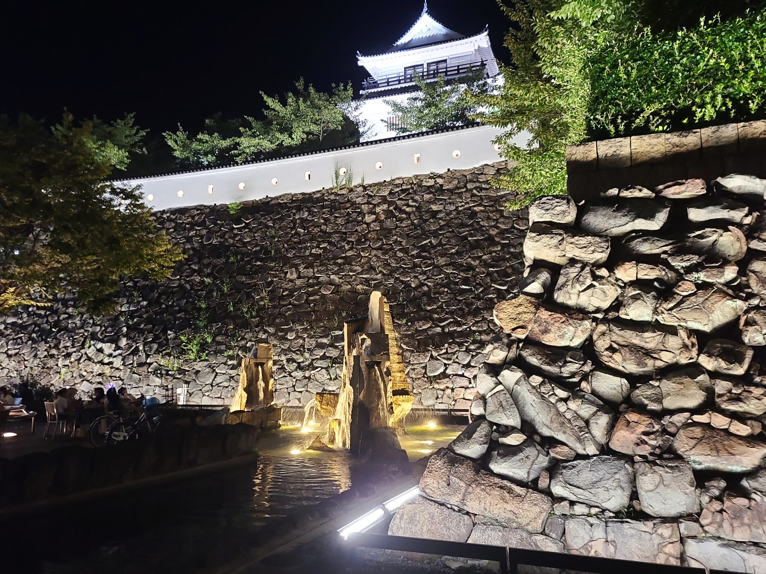 お城では、大阪城、姫路城、信州上田城の夜桜、ここ福山城も手掛け、2023年1月31日から二之丸東側の石垣(延長約125m)のライトアップも。このあたりは馬場や内堀があった場所で、大きな犬走は公園に、馬場と内堀は道路になっています。ライトアップされた石垣は非常にきれいに見えます。
