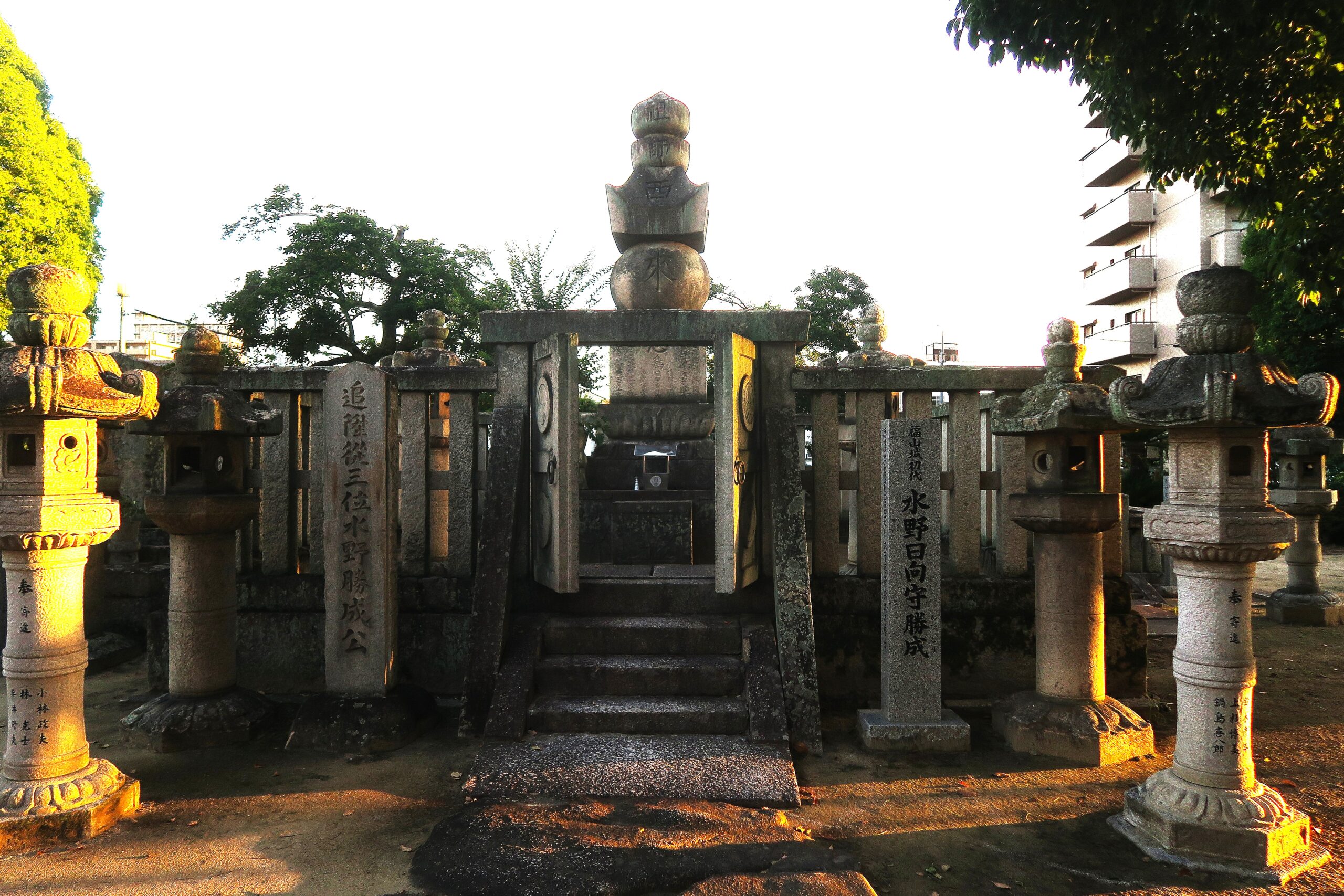 大黒町の東側の寺町には、代々藩主を務めた水野家の菩提寺・賢忠寺があります。元和8年(1622)に福山初代藩主・水野勝成が父の菩提を弔うため創建しました。水野勝成の墓は、県の史跡です。
