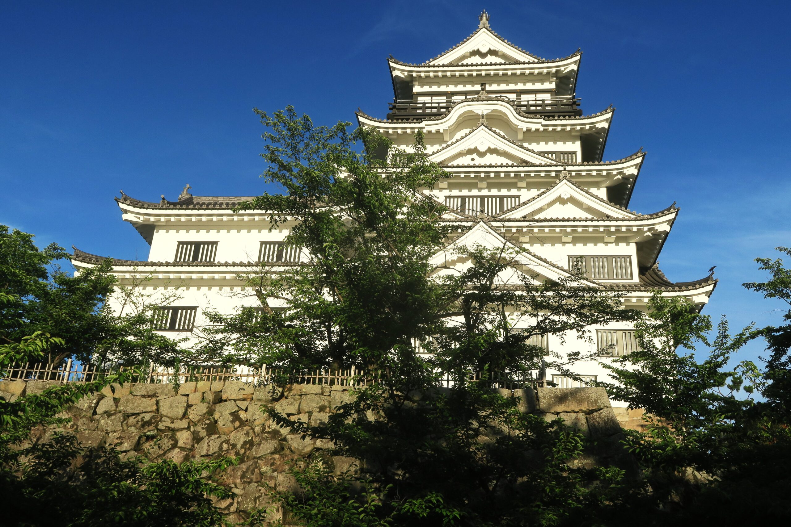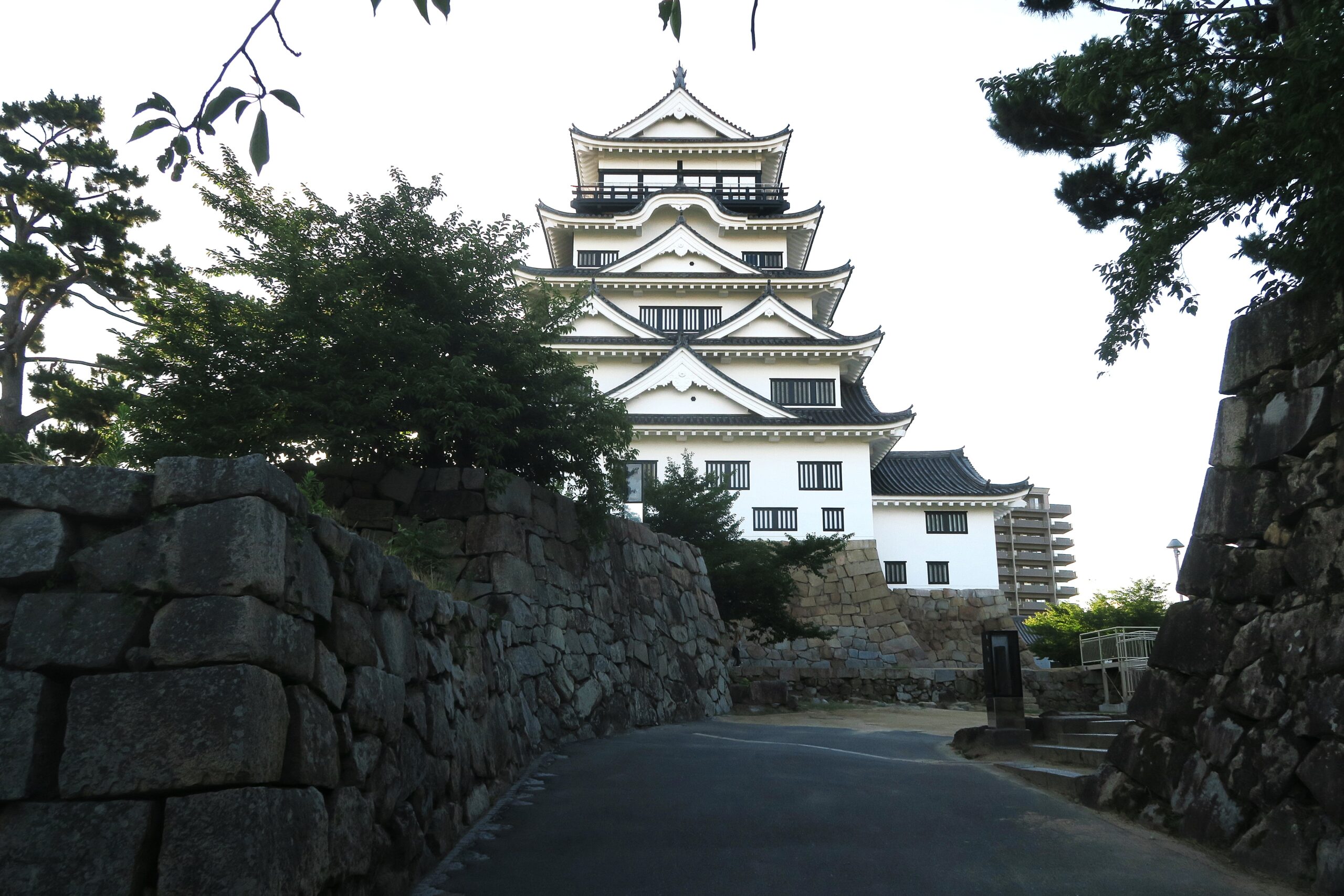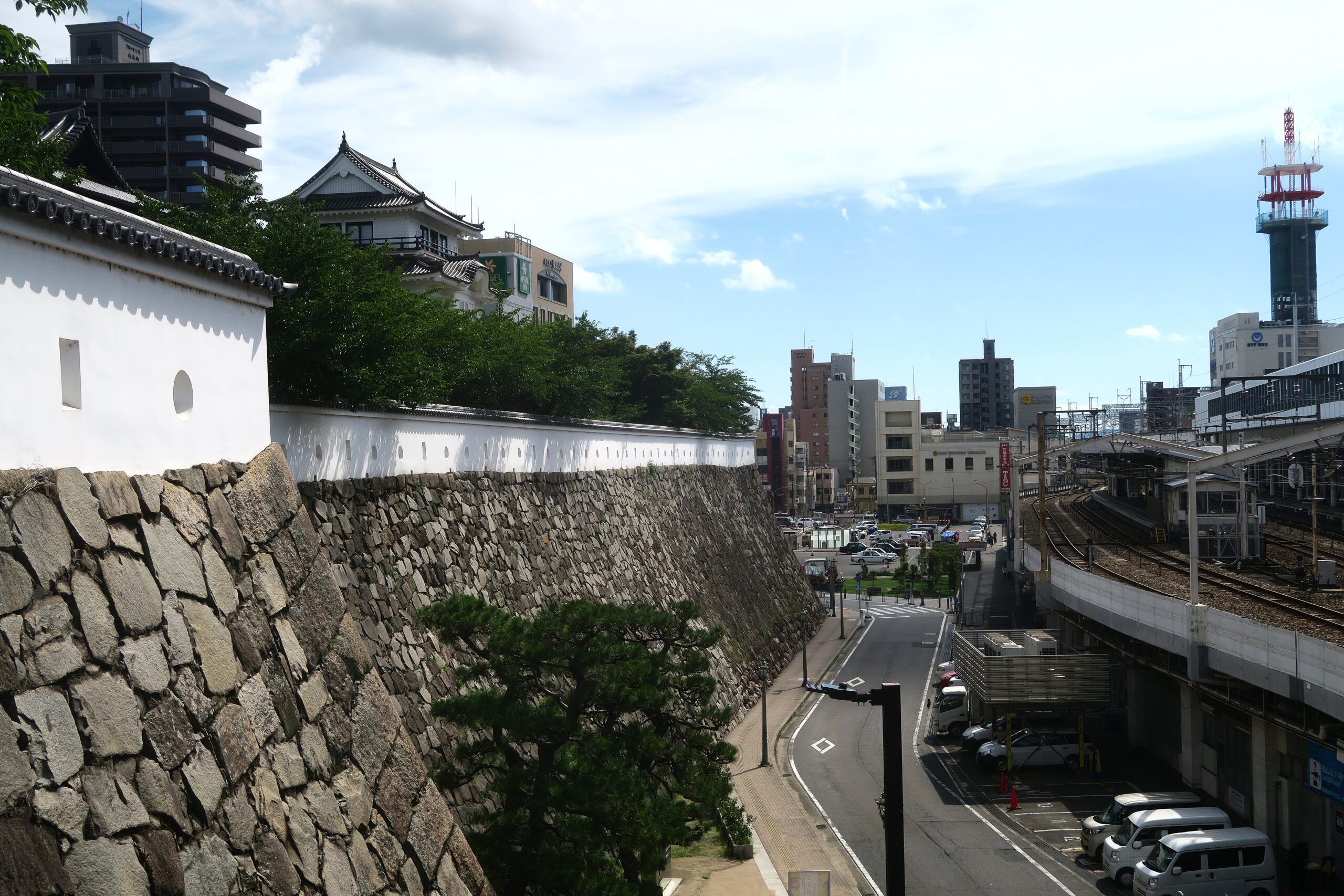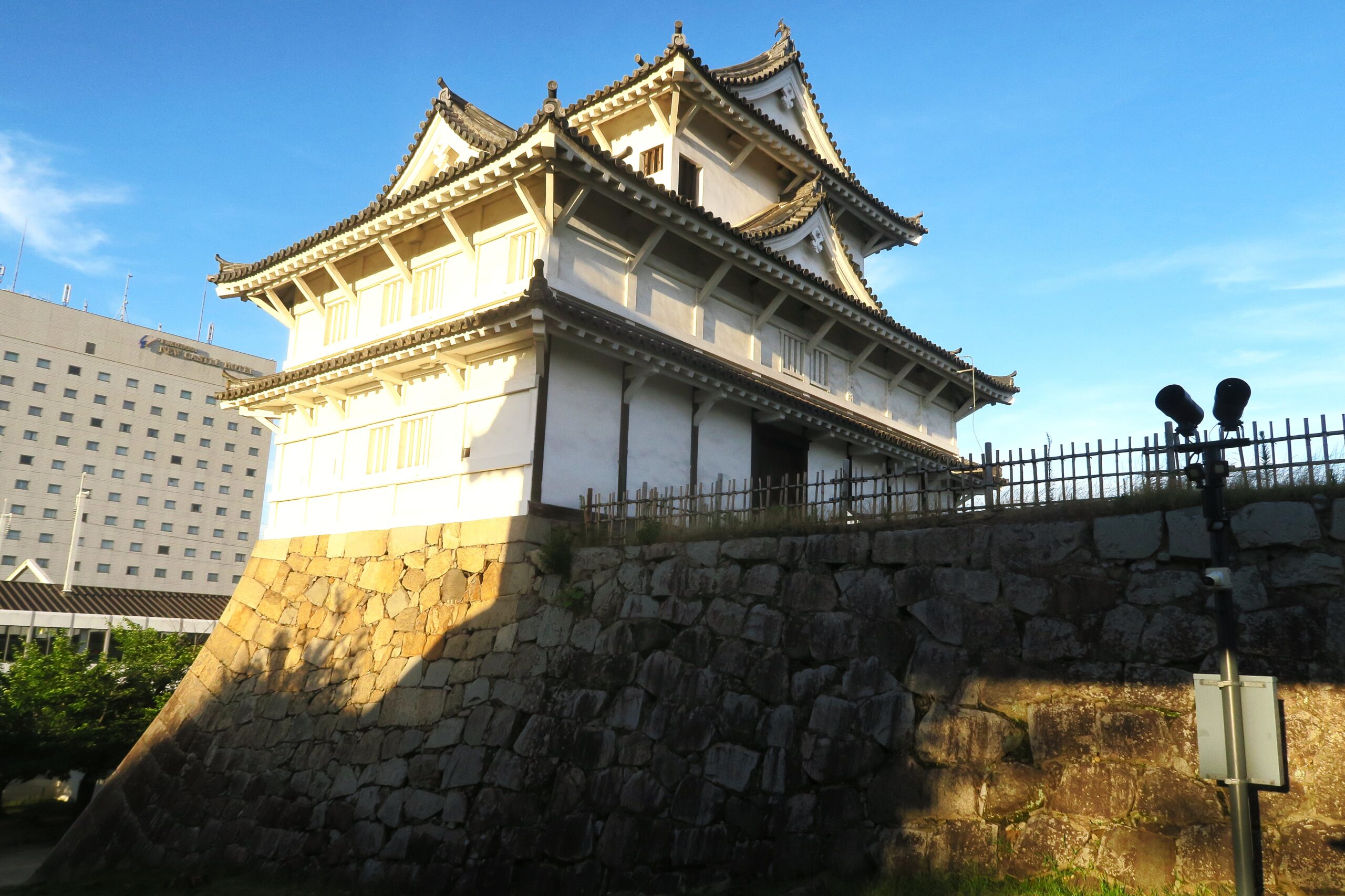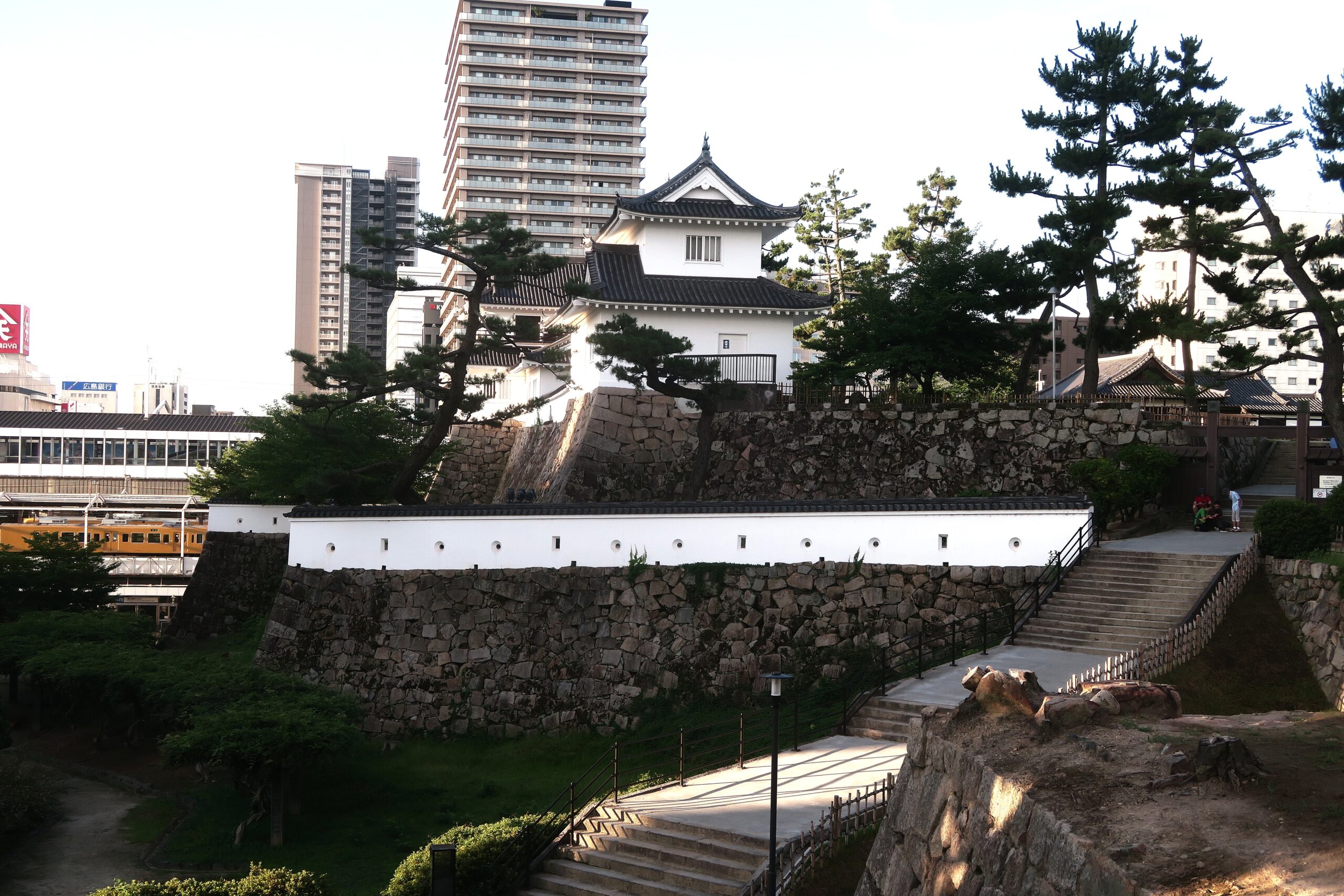 全国でも1、2を争う駅近の城で山陽新幹線福山駅の上りホームがベストビュースポットです。城と駅が至近距離にあるのは、ホームや線路がかつての場内を貫通しているからで、駅と線路は、二の丸と三の丸の間にあった堀跡に設けられています。内堀と外堀は埋め立てられて石垣が残るのみですが、かつてはここに堀があったのです。鉄道の高架下には三の丸西御門櫓台跡の大きな石垣が残っています。福山城は、山を造成し、本丸・二之丸・三之丸の石垣で構成された平山城です。雛壇状に三段の石垣で構成され、江戸時代の軍学では「一二三段」と呼ばれ、最も望ましい城の形態とされました。通常、外様の大城郭でも三之丸は石垣で造らず、土塁のままが多いが、福山城は北側を除く三之丸も石垣で築いた城でした。