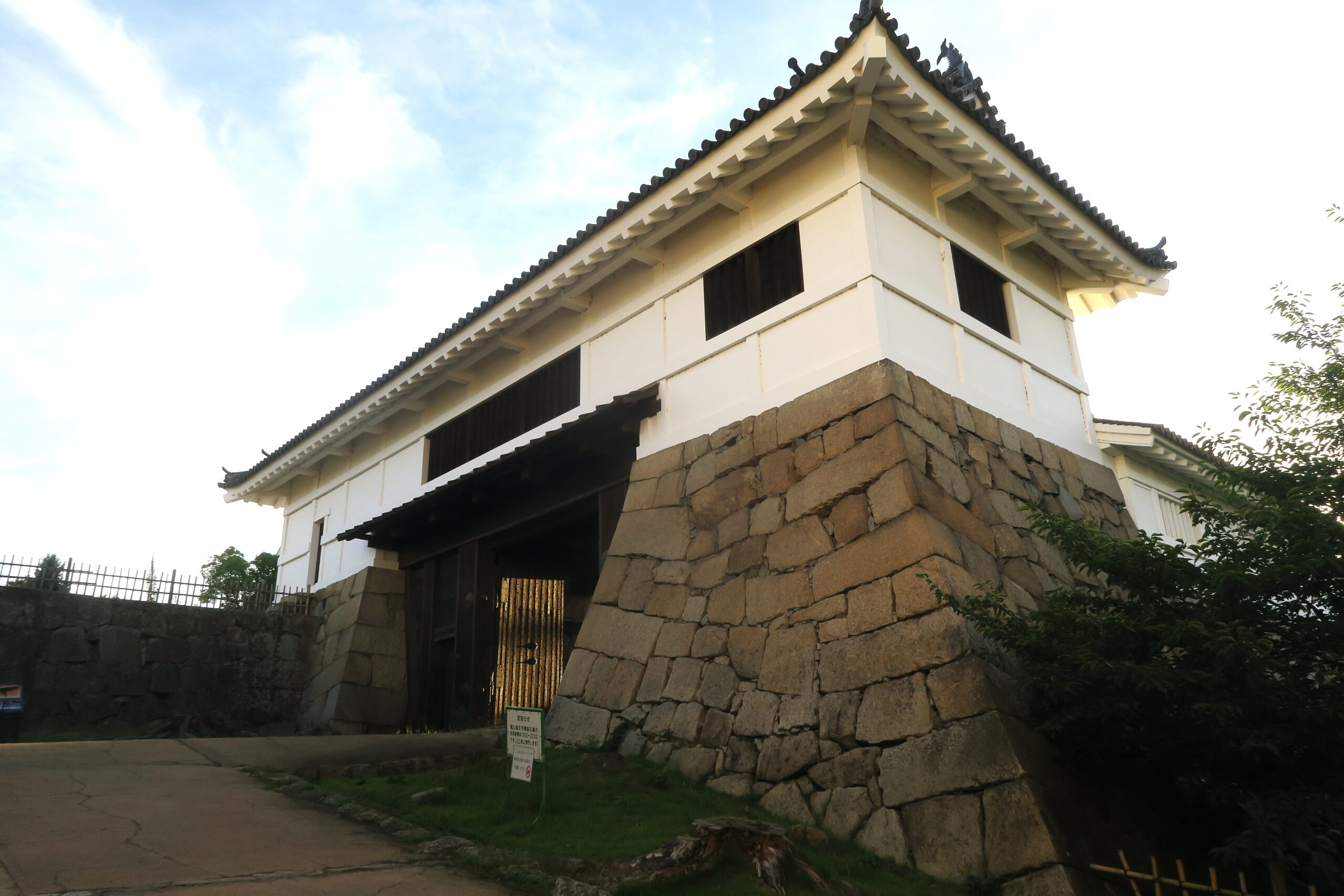 同じく伏見城より移築された入母屋造り本瓦葺きの筋鉄御門は、本丸に入る正面玄関に当たる格式の高い櫓門で、かつては渡櫓と多聞櫓で連結していました。柱や梁には硬くて丈夫なケヤキが使われ、扉や柱を強固にするため柱の角に筋鉄、扉に数十本の筋鉄を縦にうちつけていることからそう呼ばれています。外観は伏見櫓と同様に柱形や長押を漆喰で塗り出し、方杖は無く、窓は素木です。狭間は設けず、窓の格子を三角形にすることで射撃の効率を図ってる。屋根瓦には水野家の家紋である「立ち沢潟」が使用されています。門の上層は正面左端に出入口が設けられ、内部は門の上部を一段高くとり床張りとし、その左右は土間で、見張りや防衛のために武士が出入りしていました。築城当時の姿を今に残す国の重要文化財です。