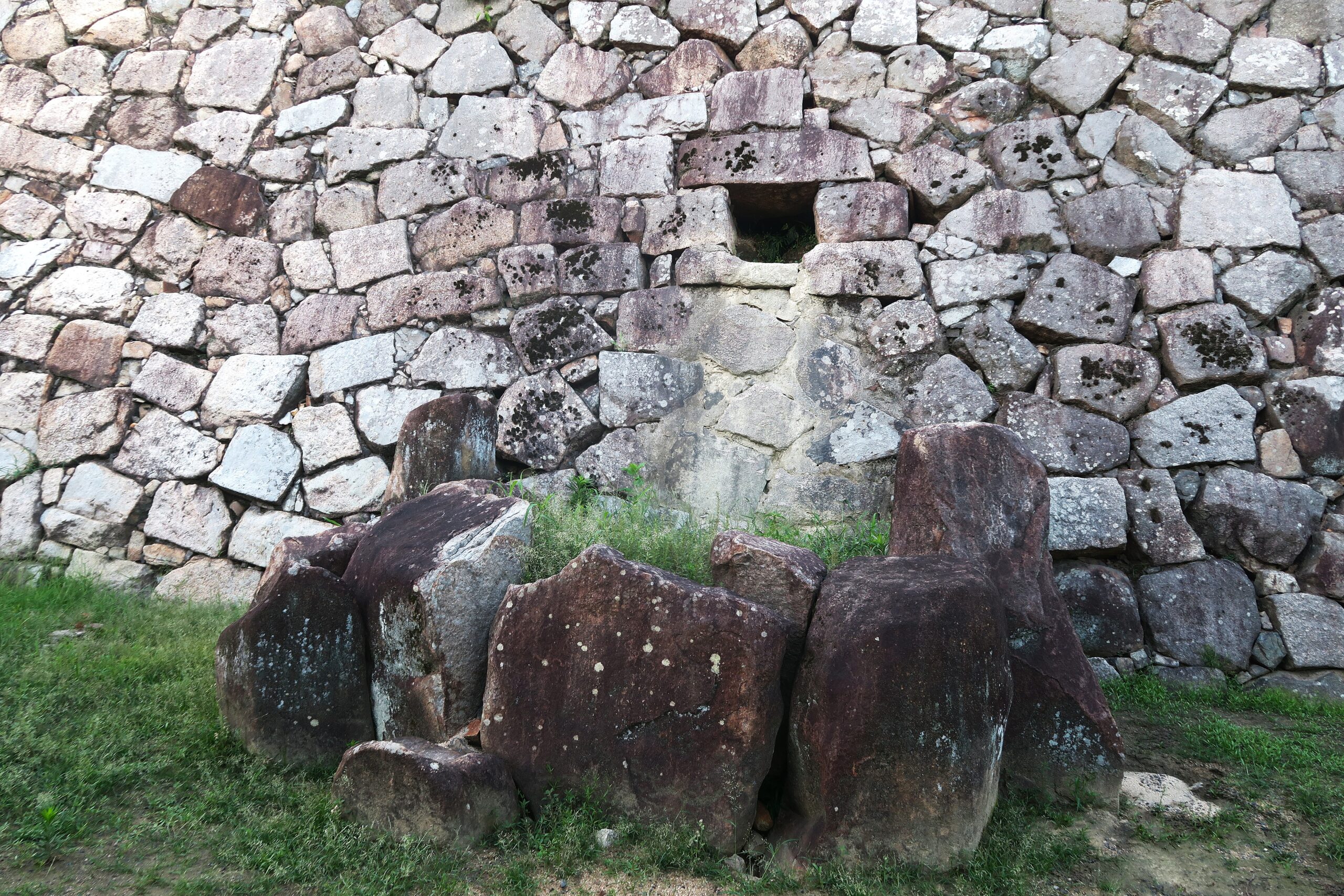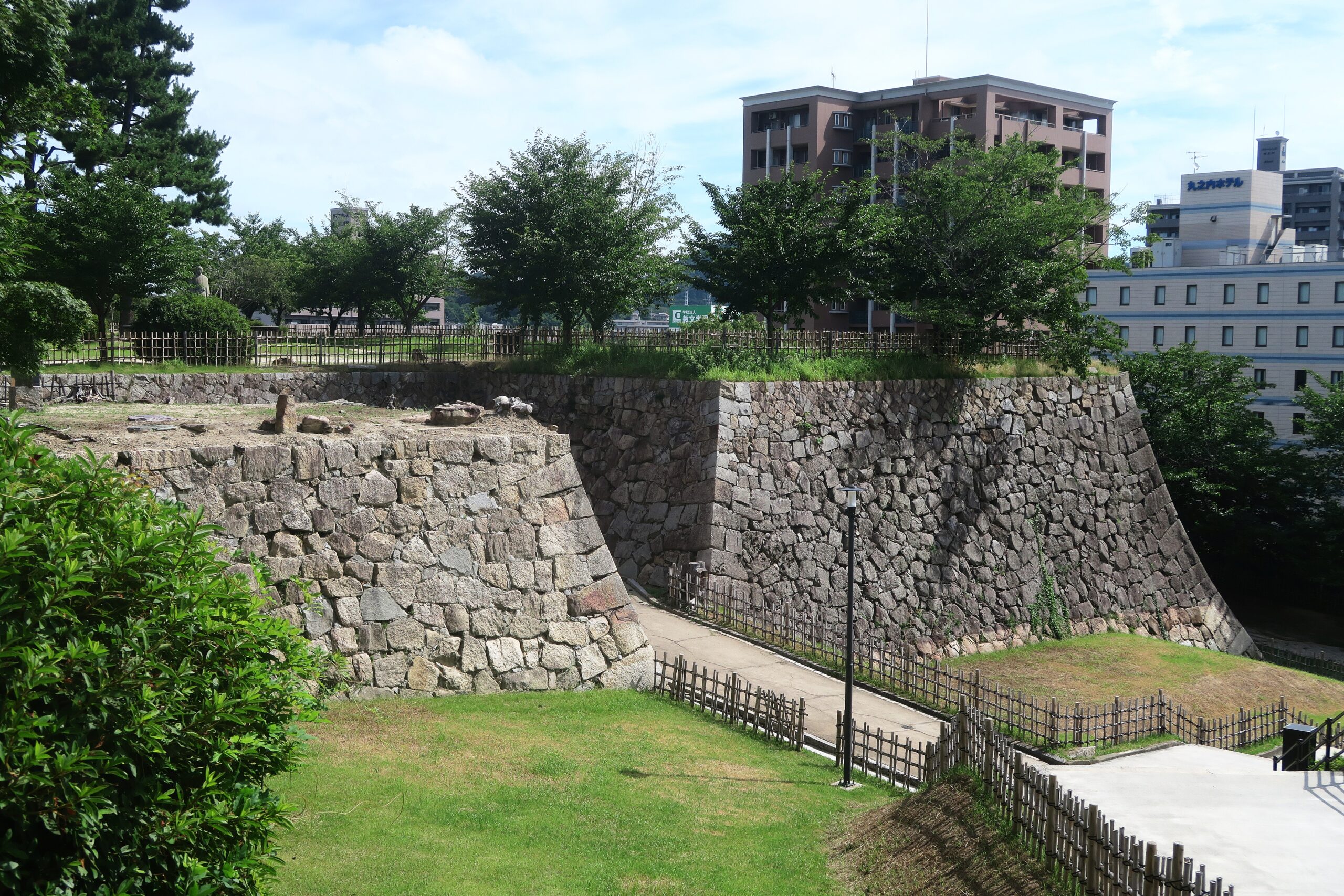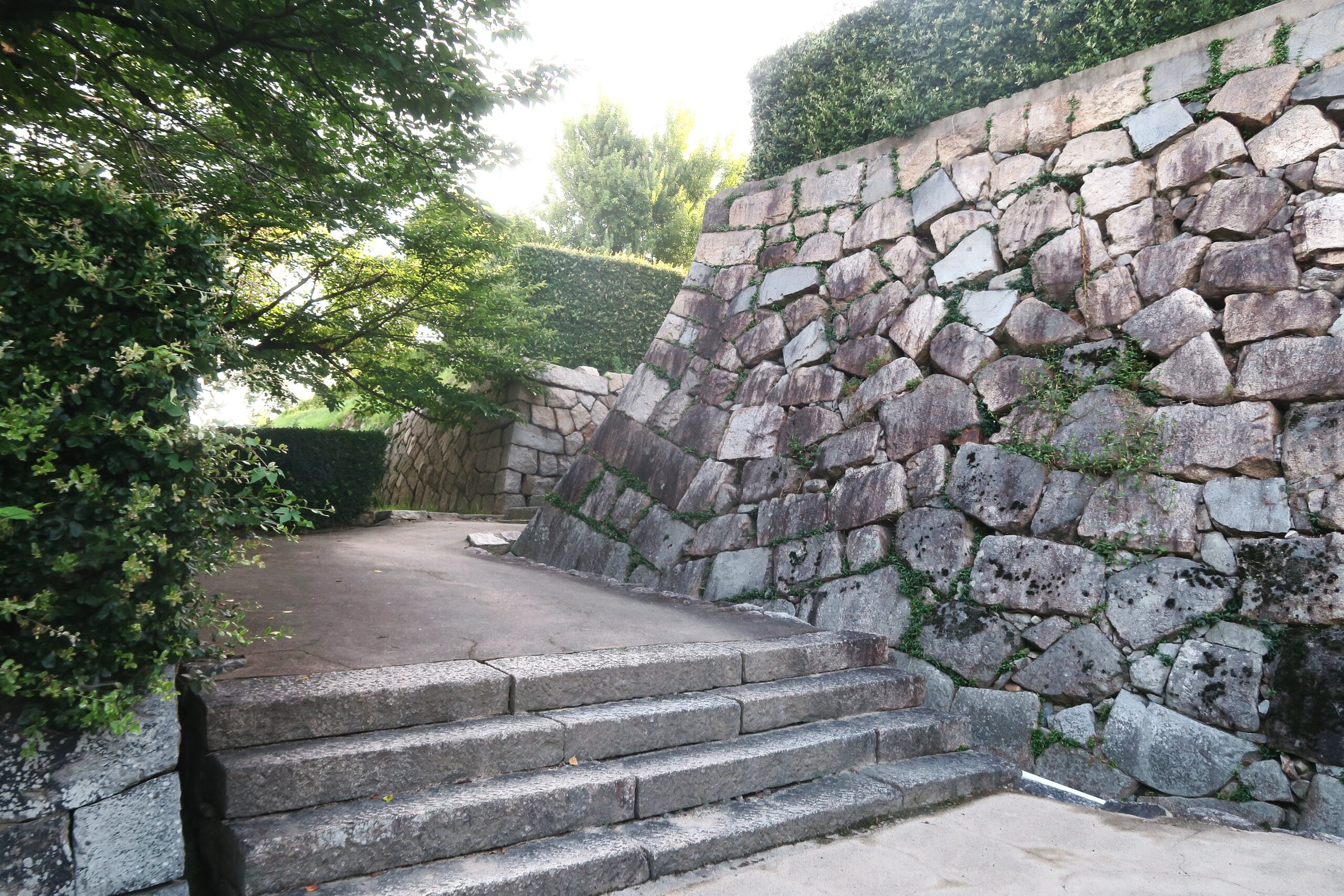 石垣は、瀬戸内地域で産出する花崗岩を主とする石材が用いられ、その表面を「割石」加工し、ハツリを施して平坦に調整しています。積み方は「打込接」の「布積」と「乱積」技法を併用して構築されていて、隅は完成度が高い、「算木積」です。福山城は天守門・門、内堀や外堀塔が南側からの眺望を重視した構えとなっていて、幾条当時の石垣にのうち特に天守台や伏見櫓・筋鉄御門のある虎口周辺、二之丸南面の石垣は、丁寧な加工による構築が行われています。