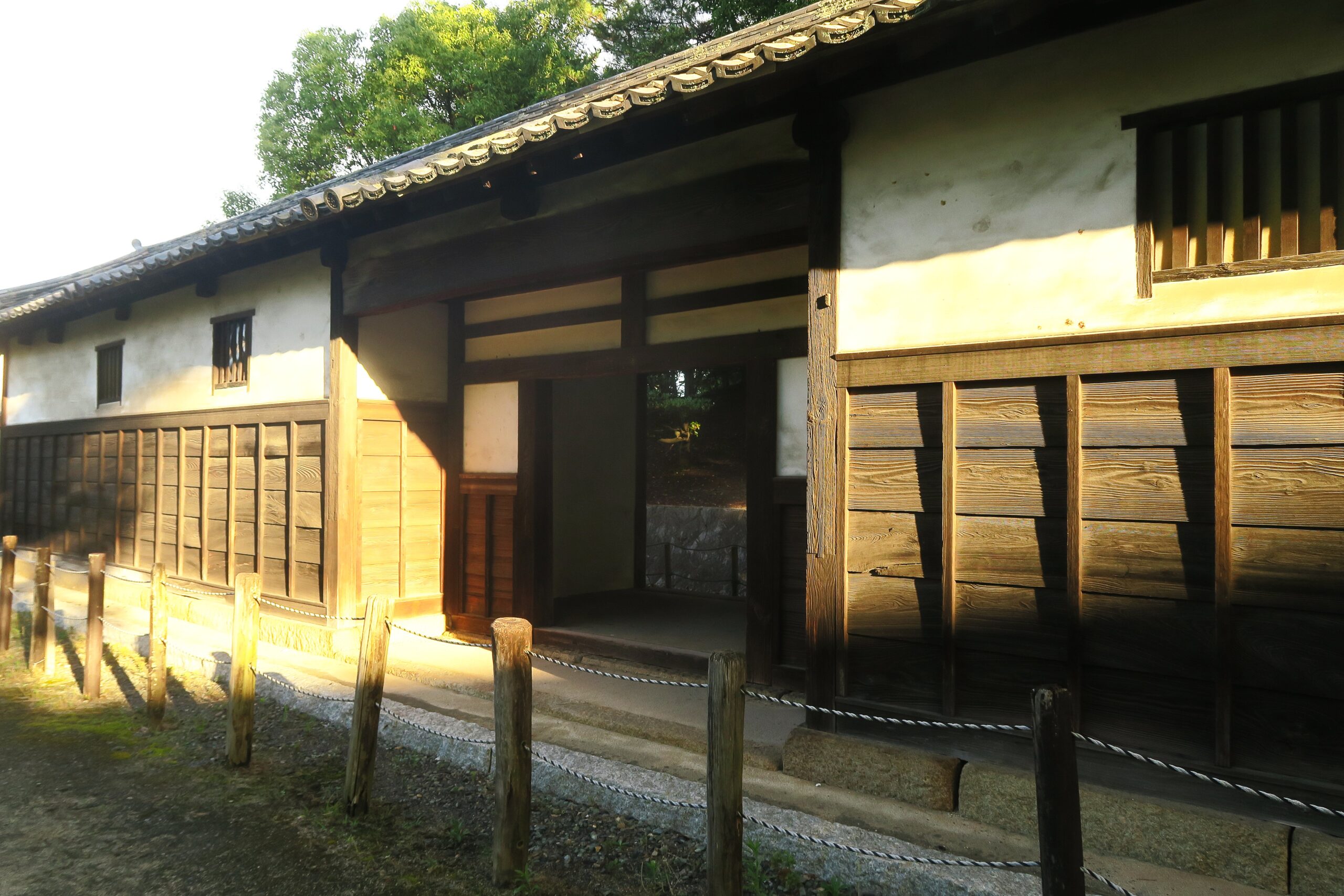 二之丸にある旧内藤家長屋門は元は福山城の西外堀に面した位置にあったようですが移築されました。阿部家が宝永7年(1710)福山藩主に封じられた際に随従し、以降明治4年(1871)の廃藩置県まで家臣として仕えた内藤家の住居で、弘化3年(1846)の江戸時代後期の建築です。平屋建てで東西に長く、東西に袖塀が付く。門の中央に入口の引戸があり、東側に内藤家で働く人が居住する部屋で畳敷の4畳半と3畳の二間、西側には土間と客を連れてきた人に休憩してもらう畳敷きの6畳一間がありました。いずれの部屋も入口は北側で、南側上方には武者窓が3ヵ所開かれ、白壁と腰下板張りとともに、外観の美しさを形成しています。