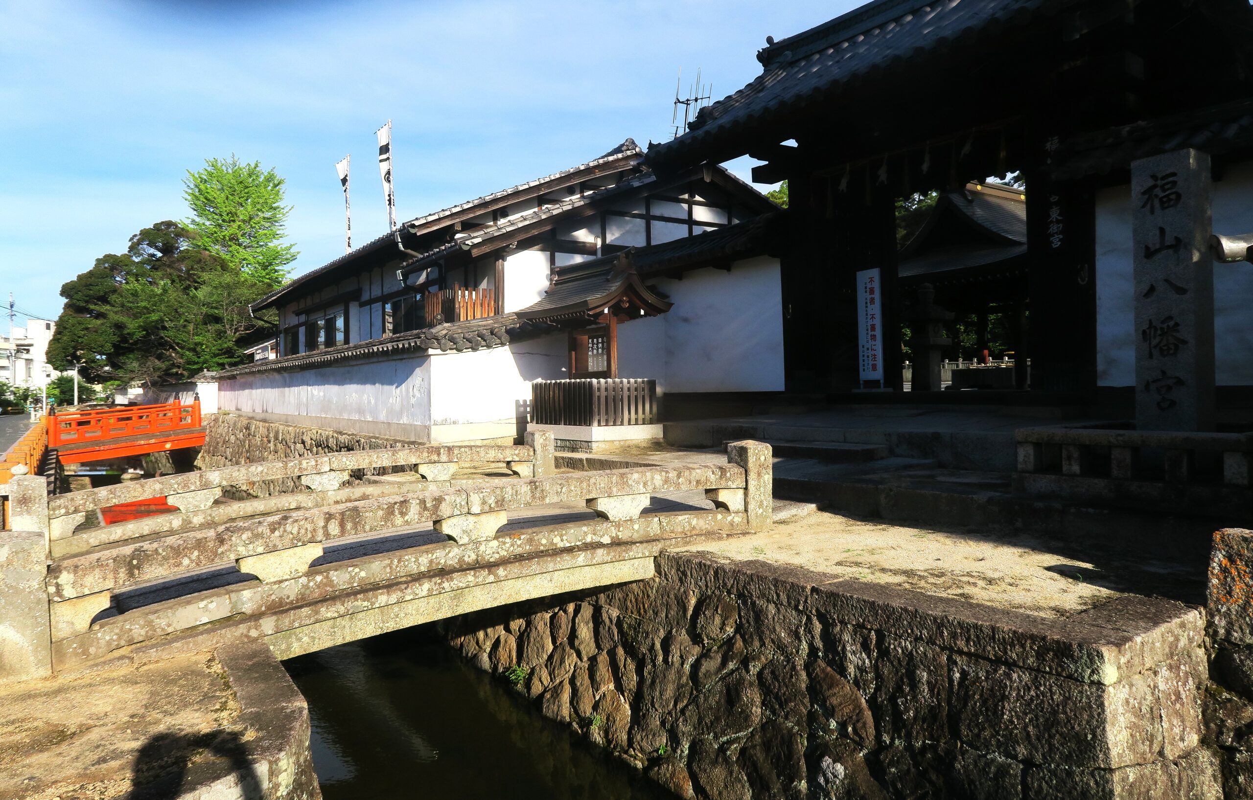その隣には福山の総鎮守・福山八幡宮があり、江戸時代の創建当時の東西に並立する社殿がそのまま残ります。福山藩初代藩主水野勝成による福山城築城と城下町整備に伴い城下に祀られるようになった東の宮の延広八幡宮と西の宮の野上八幡宮を福山藩4代藩主水野勝種が天和3年(1683)福山の総鎮守として福山城天守を南に望む松廼尾山の山頂に同じ形式・規模で並べて造営。両社の間に初代藩主・水野勝成を祀る聰敏神社が鎮座し、参道もそれぞれに専用のものが設けられました。
