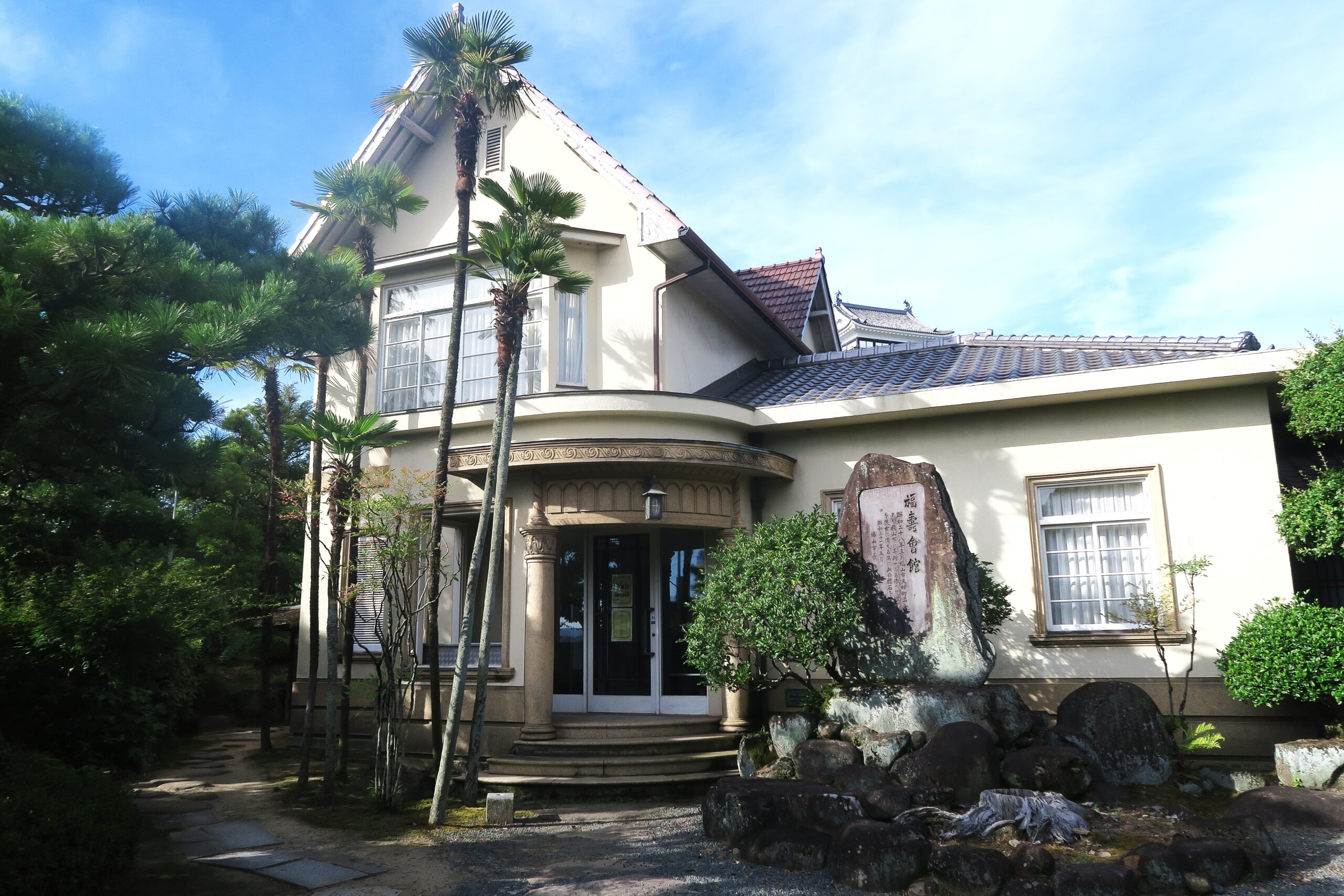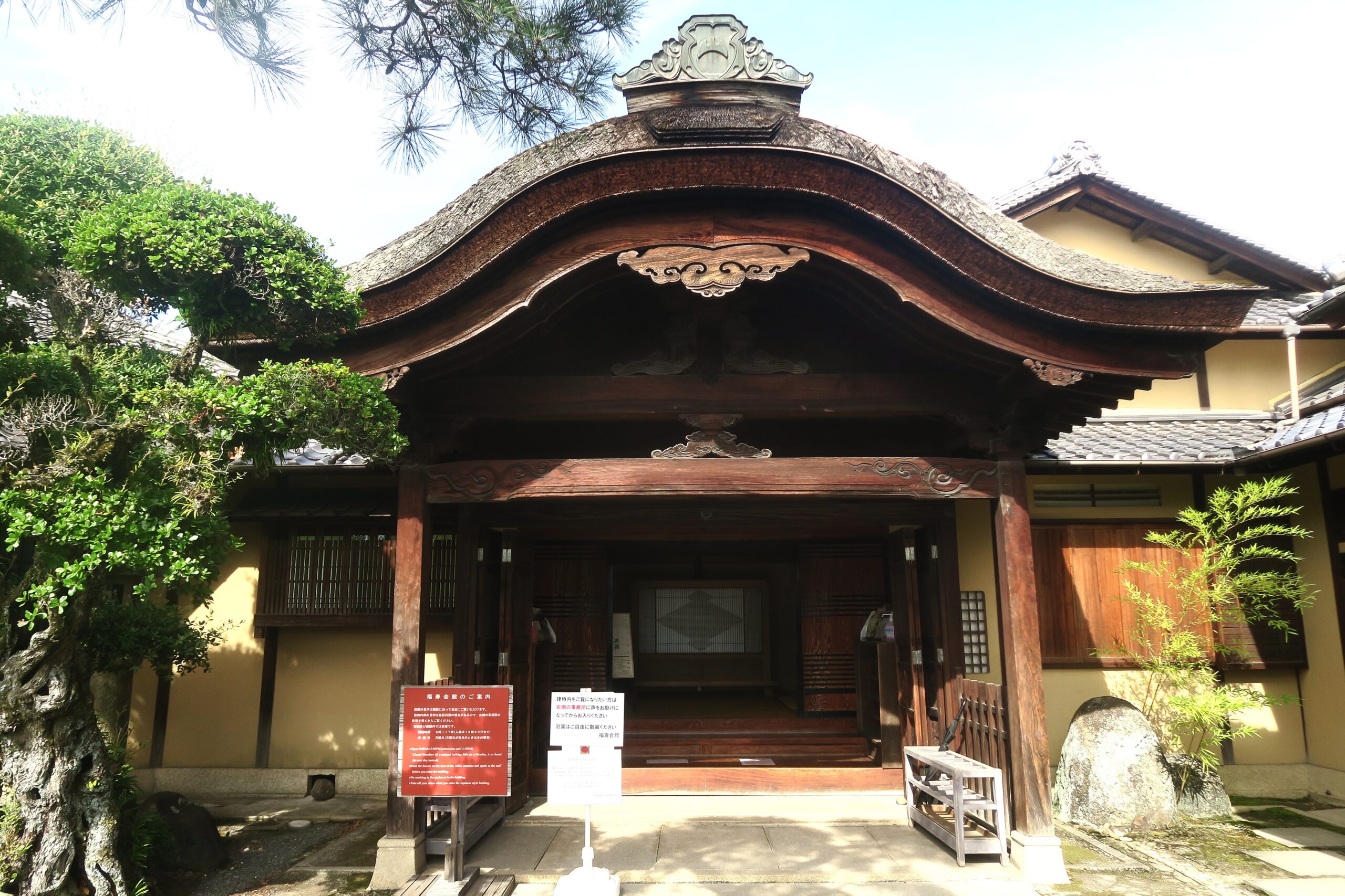 福山城の北東、三蔵稲荷神社への参道近くに福寿会館があります。海産物商で財を成し「鰹節王」といわれた安部和助氏が昭和初期・本館・洋館は昭和10年(1935)から昭和12年(1937)に建築したものです。建物は伝統的な日本建築の本館・西茶室・東茶室・西蔵・東蔵とルネッサンス風の洋館があり、敷地は7395㎡、建築面積872㎡、木造平屋一部2階建てになっています。本館は、平屋で数寄屋風造りを基本に造られています。表玄関は檜皮葺・神社を思わすような拝殿造りの唐破風屋根で、天井は一部格子状の格天井です。
