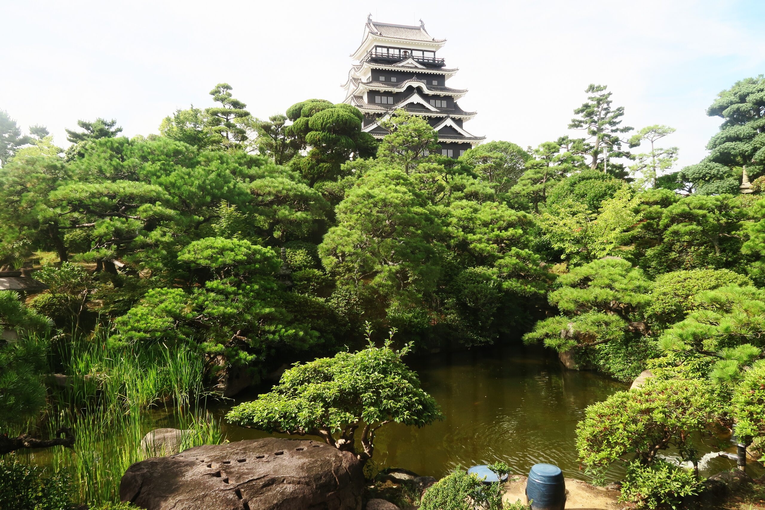 敷地内に広がる回遊林地式庭園はみどころのひとつで、京都の作庭家西村氏の指導により、完成までに10年の歳月を費やしたといわれています。池を中心に築山を築き、松の老木や山の草花、各地の銘石をふんだんに取り入れ、四季折々の景色を鑑賞できるように造られています。庭園ごしに鉄板が張られた福山城天守が望めます。