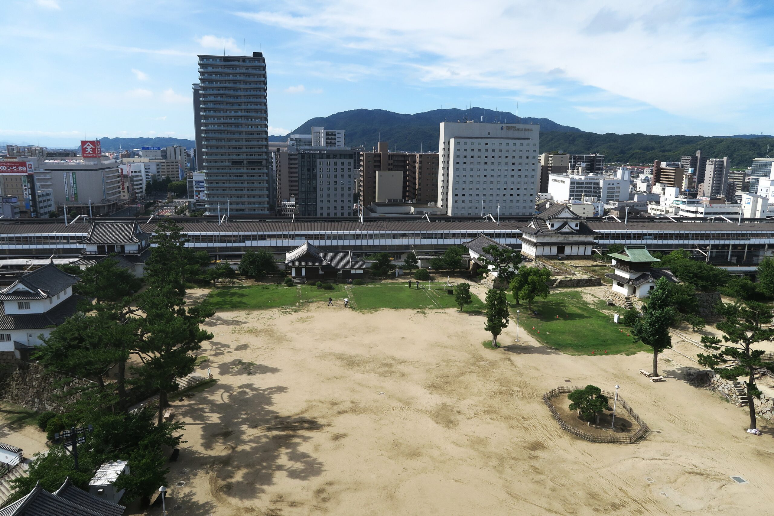 天守最上階からは、福山市街の360度の眺望が楽しめます。写真は南、福山駅方向を見た本丸跡です。