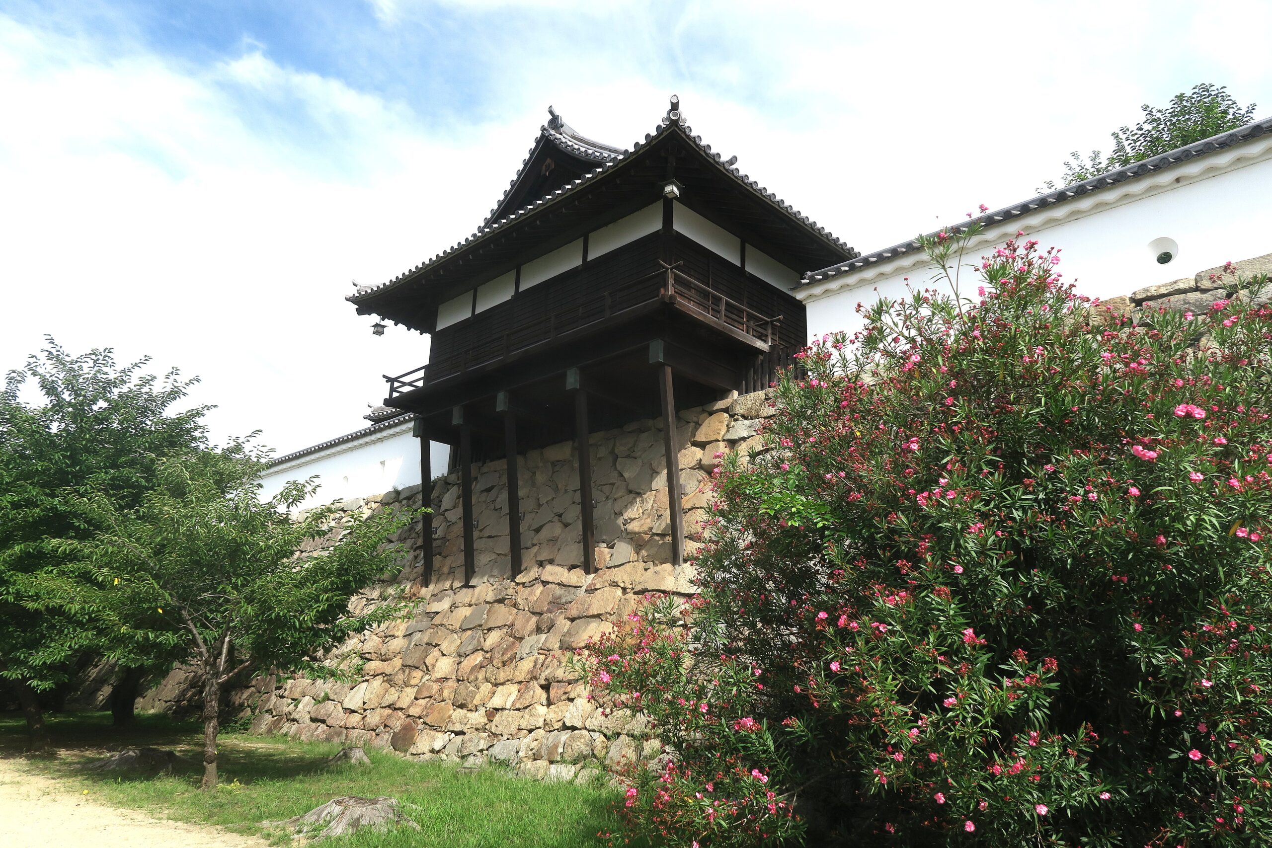 月見櫓は、福山城本丸南東隅に位置する二重櫓であり、その北側に付櫓を備えています。京都伏見城内から移築したと伝わりますが、1階の壁は伏見櫓などとは異なり、柱形や長押を塗りださない大壁造りです。福山藩時代は「着見櫓」という名で呼ばれ、追手側(南)の入川方面も展望できる南東隅に築かれ、藩主の船が城付近に到着したことを確認するために使われていました。1階屋根には壮大な唐破風が据えられ二階には天守最上階と同じく壁を設けず、南面と西面には高欄付の縁を巡らせた優美な姿です。水野家時代の絵図にも月見櫓と書かれ、その名の通り藩主が櫓に上って月見を楽しんだとされることが櫓の名前の由来です。1階南面には石落としがある古い建築様式をもっています。明治の初め頃に取り壊されましたが、昭和41年(1966)秋、天守とともに再建されました。
