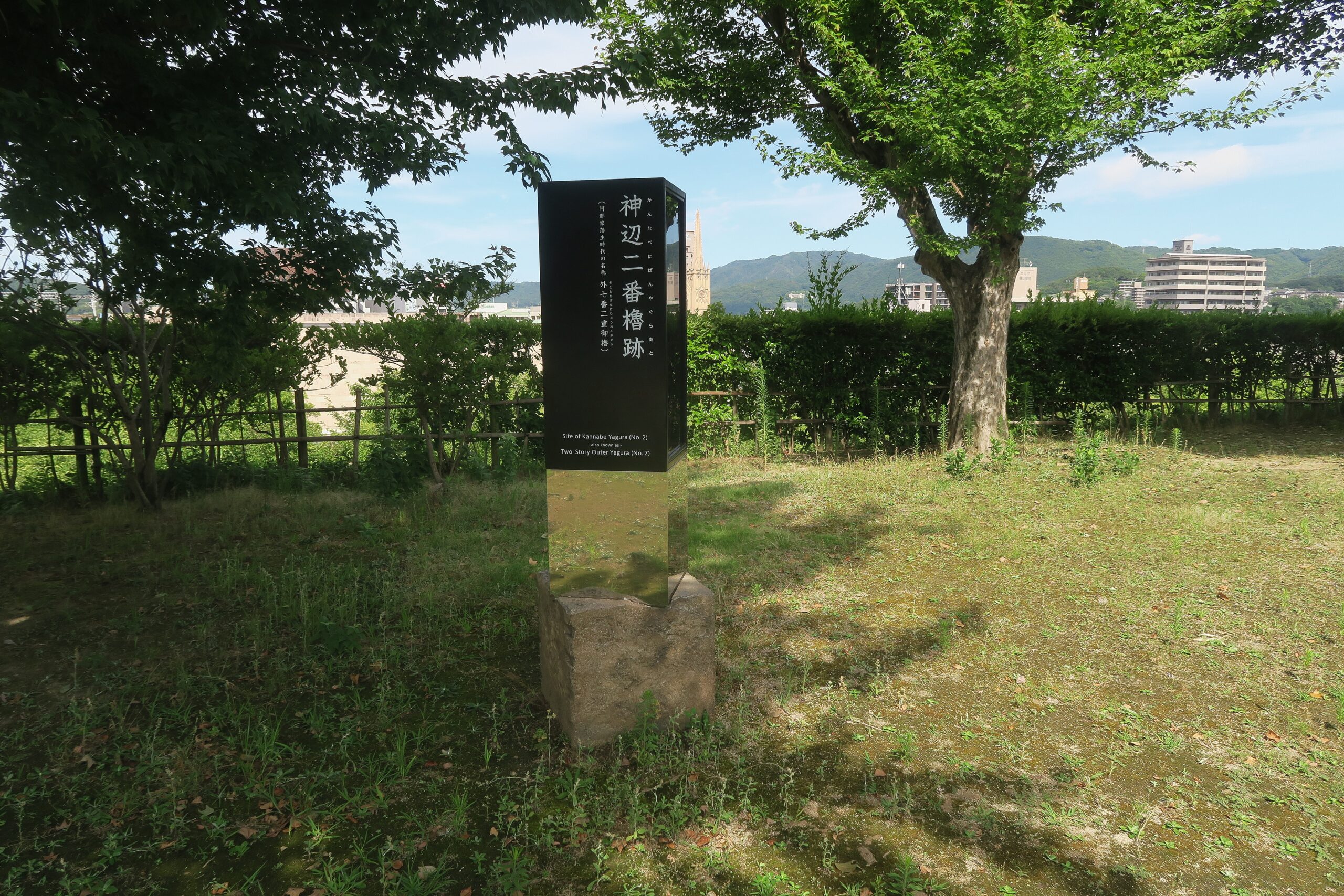 伏見櫓の北へ曲がると二之丸(西)で神辺櫓群の跡があります。福山は備後国の中心地で、室町時代は山名氏が守護としてこの国を治めていました。その山名氏の居城が「神辺城」です。水野勝成はこの城の天守や櫓を西側に移築しました。移築した櫓は全部で4つあり、一番櫓は二之丸南西部の角に配され、多聞櫓で西坂口門と神辺二番櫓につながり、本丸には伏見櫓から連なる多聞櫓がありました。写真は西坂口門跡