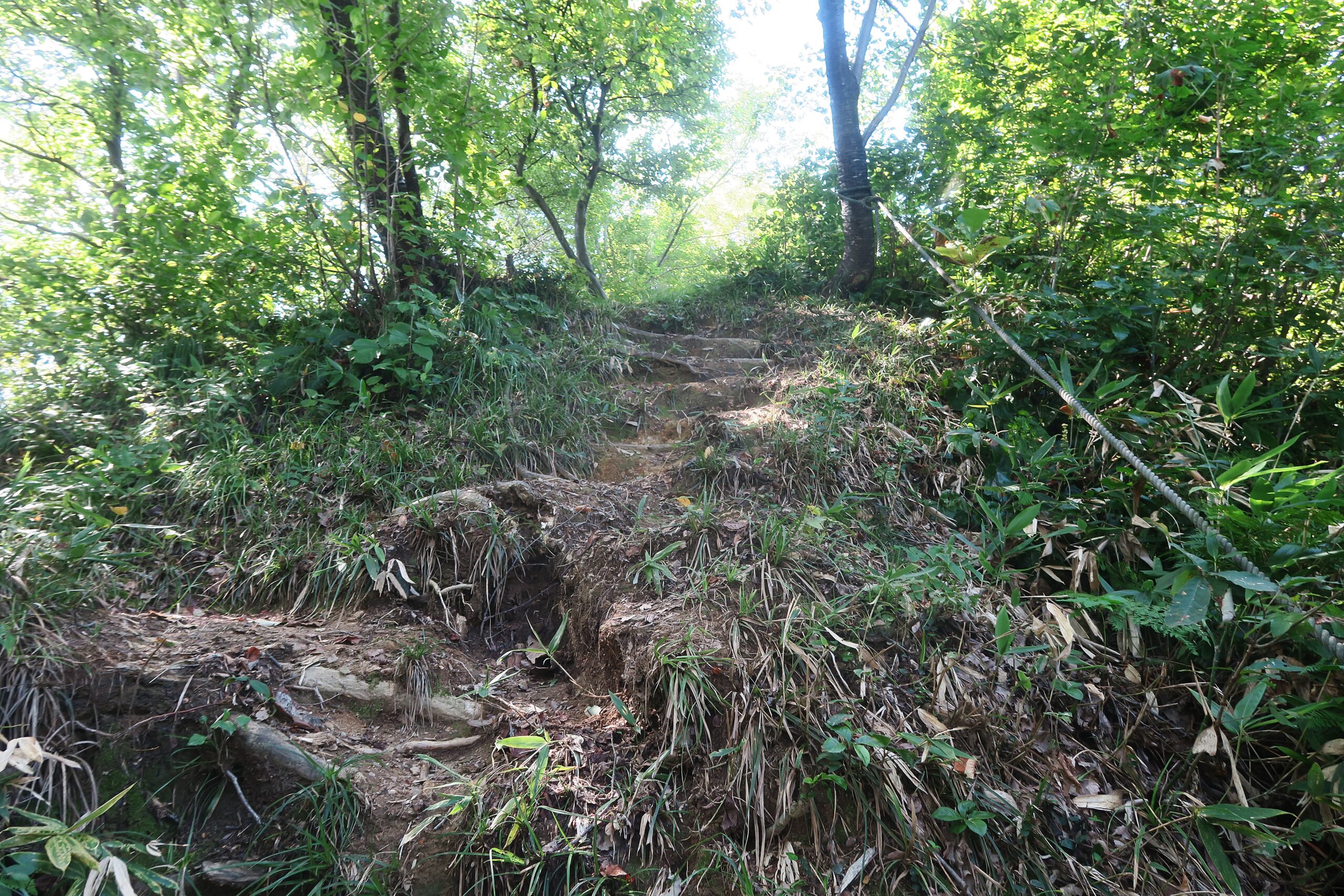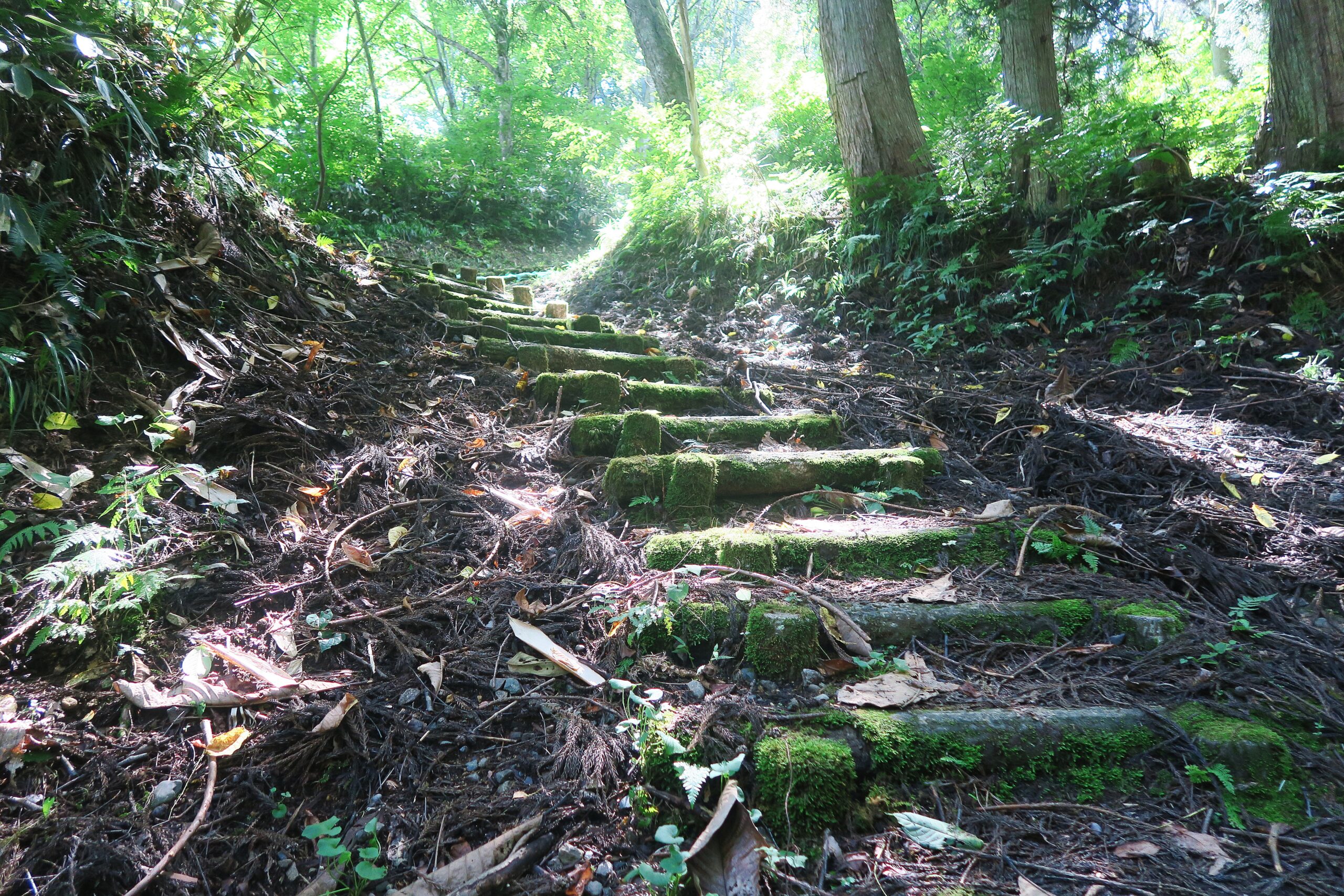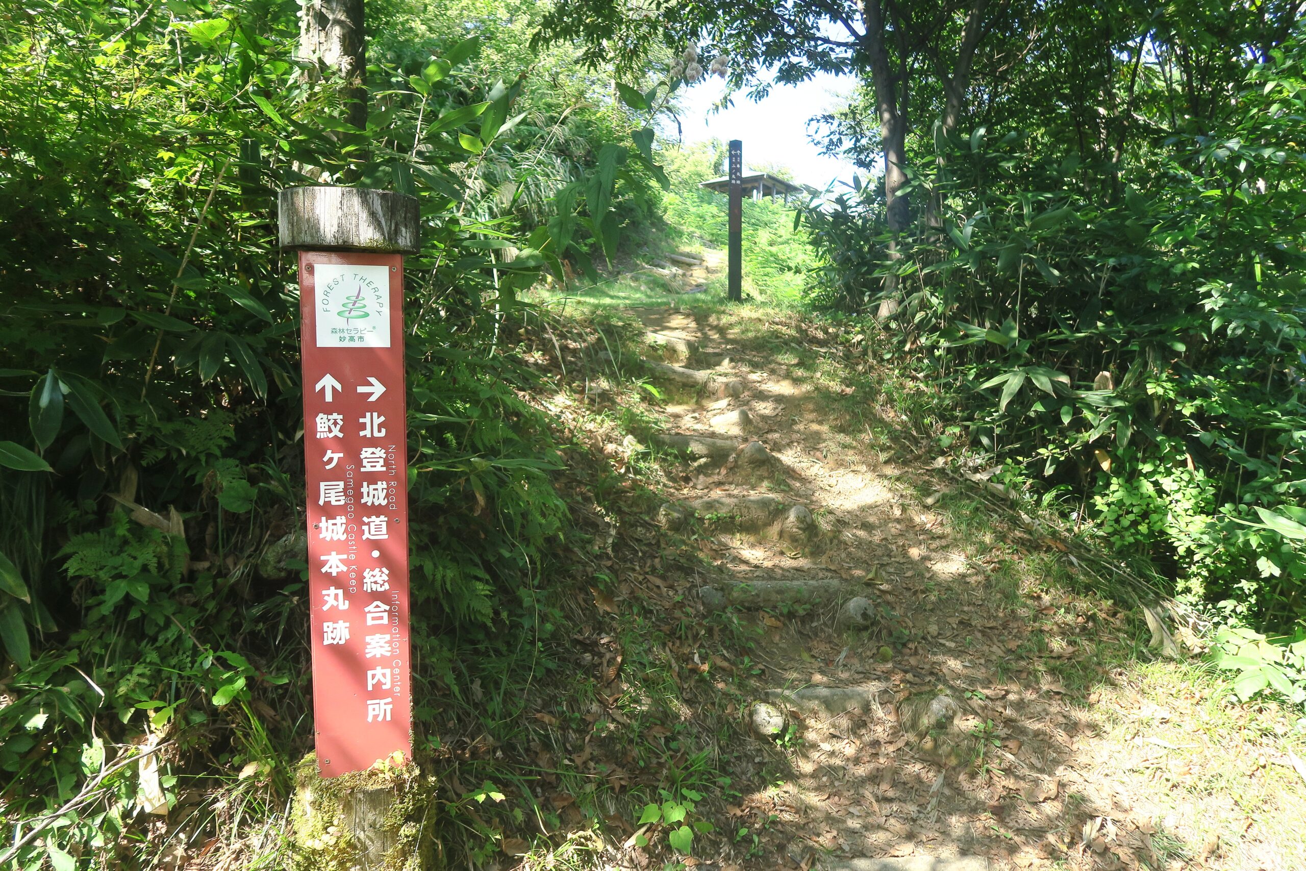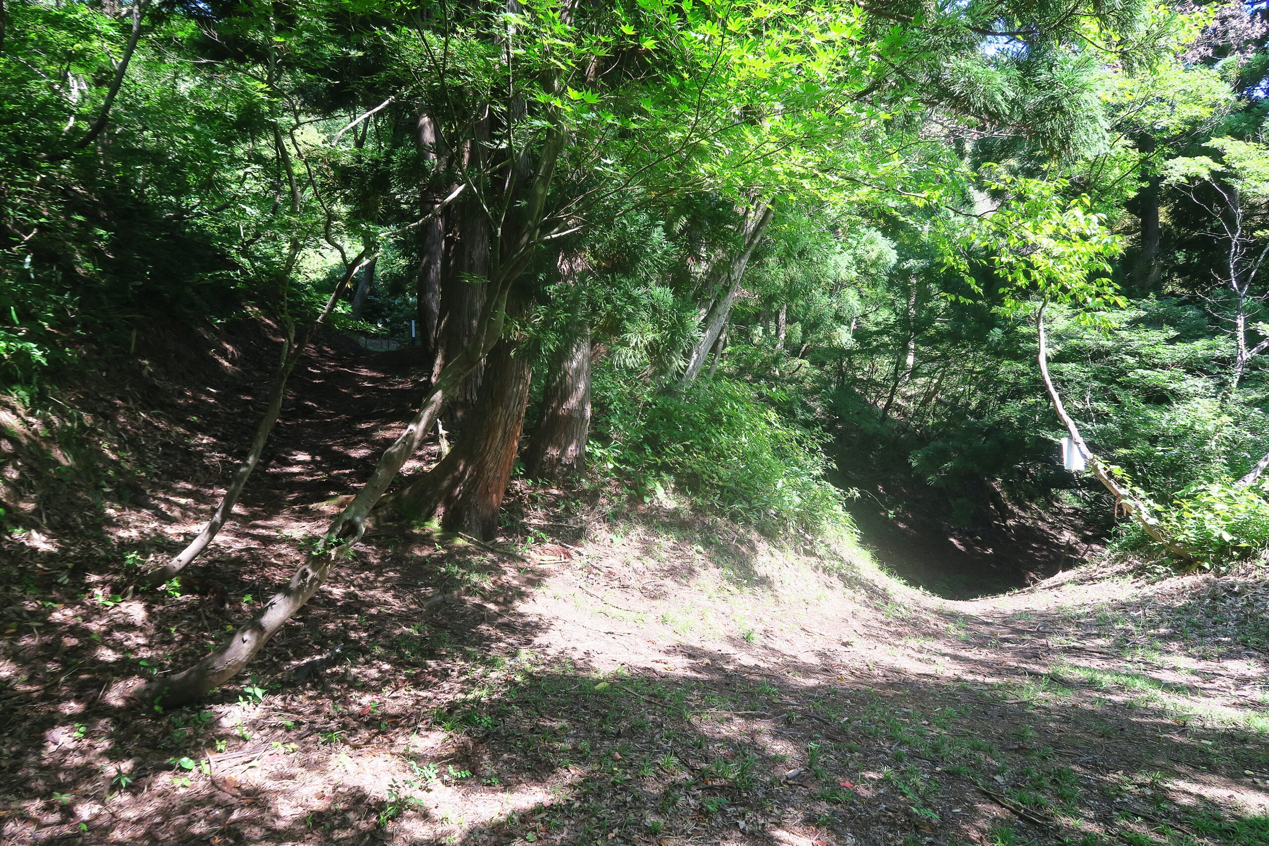 米蔵跡を正面に見て右手に下っていけば北登城道となり、総合案内所まで約20分で下れます。北登城道は深い沢を超えて山頂尾根の北斜面を行く登城道。途中までは杉林が広がり、山頂の真下まで近づくと切岸が現れます。擬木階段を用いた整備された登場道なので綱張りに興味がなく、単に山頂を目指す場合はおすすめの道です。
