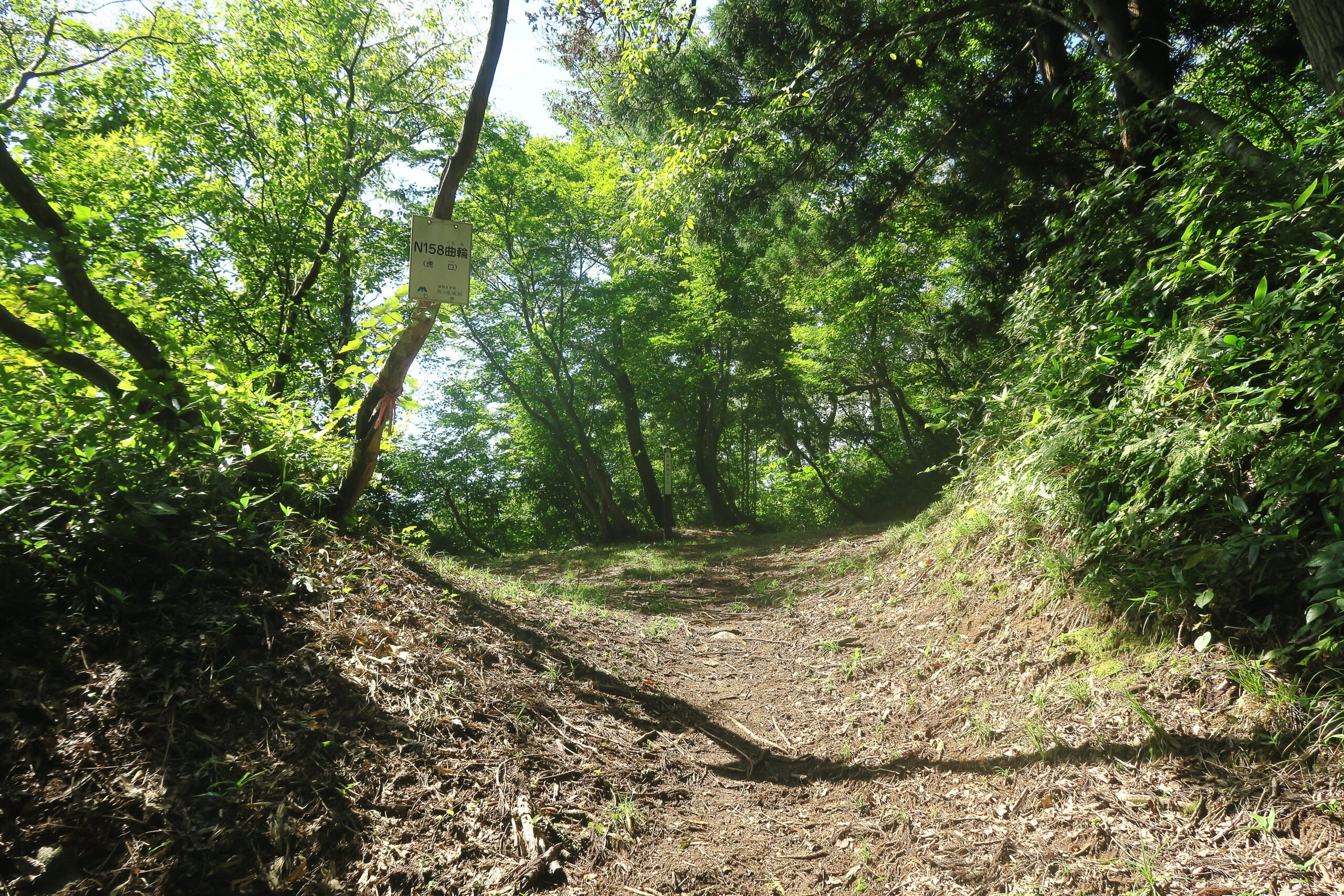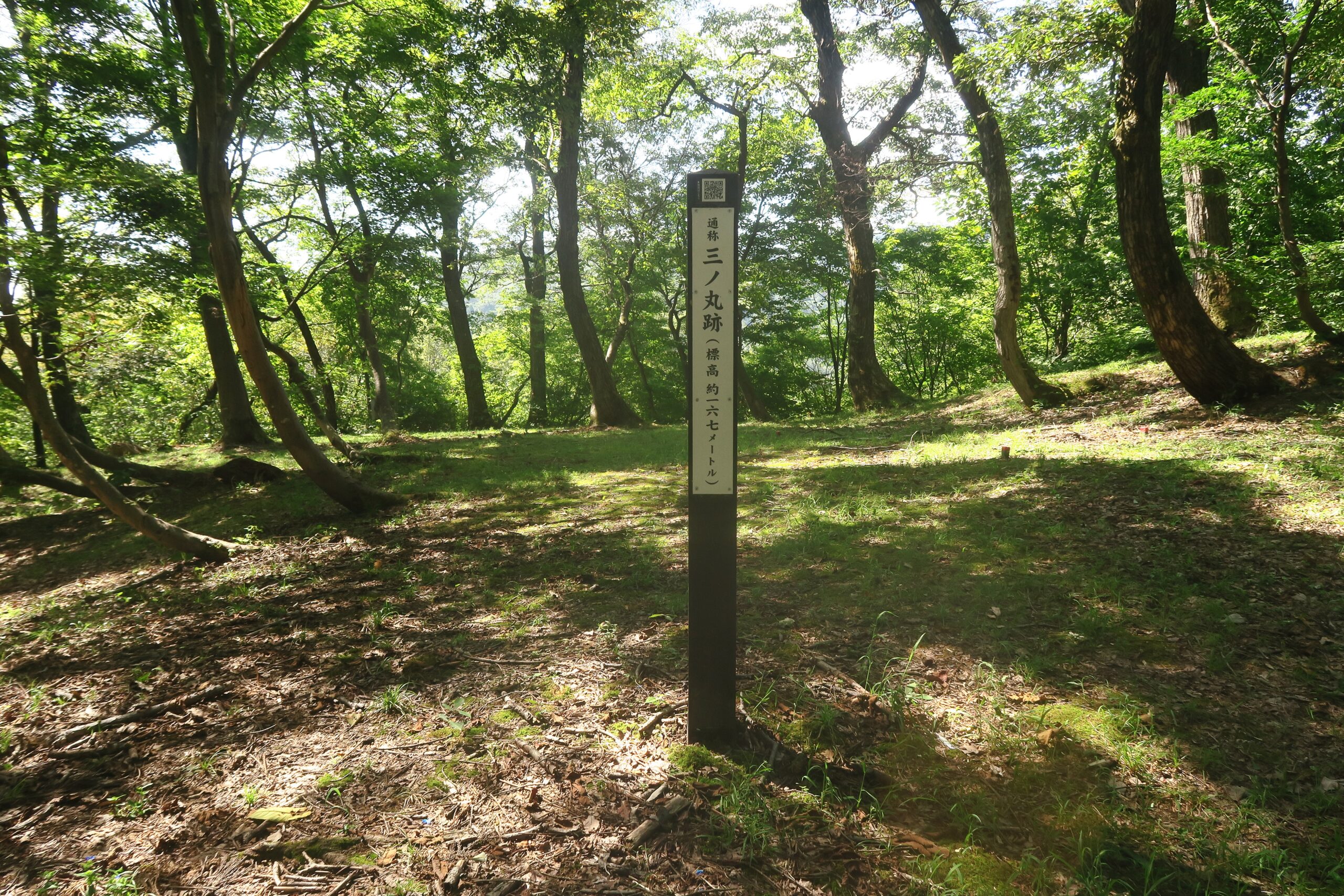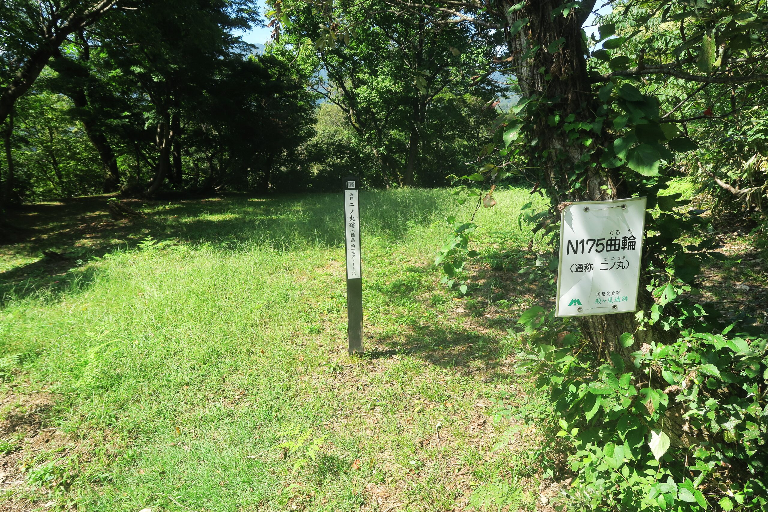 右手からの北登城道との合流地点でもあり、案内標識には南登城道とは書かれていませんが、左へは通称三ノ丸跡(N167)へ行けます。写真奥の標識には左矢印で二ノ丸跡とあります。