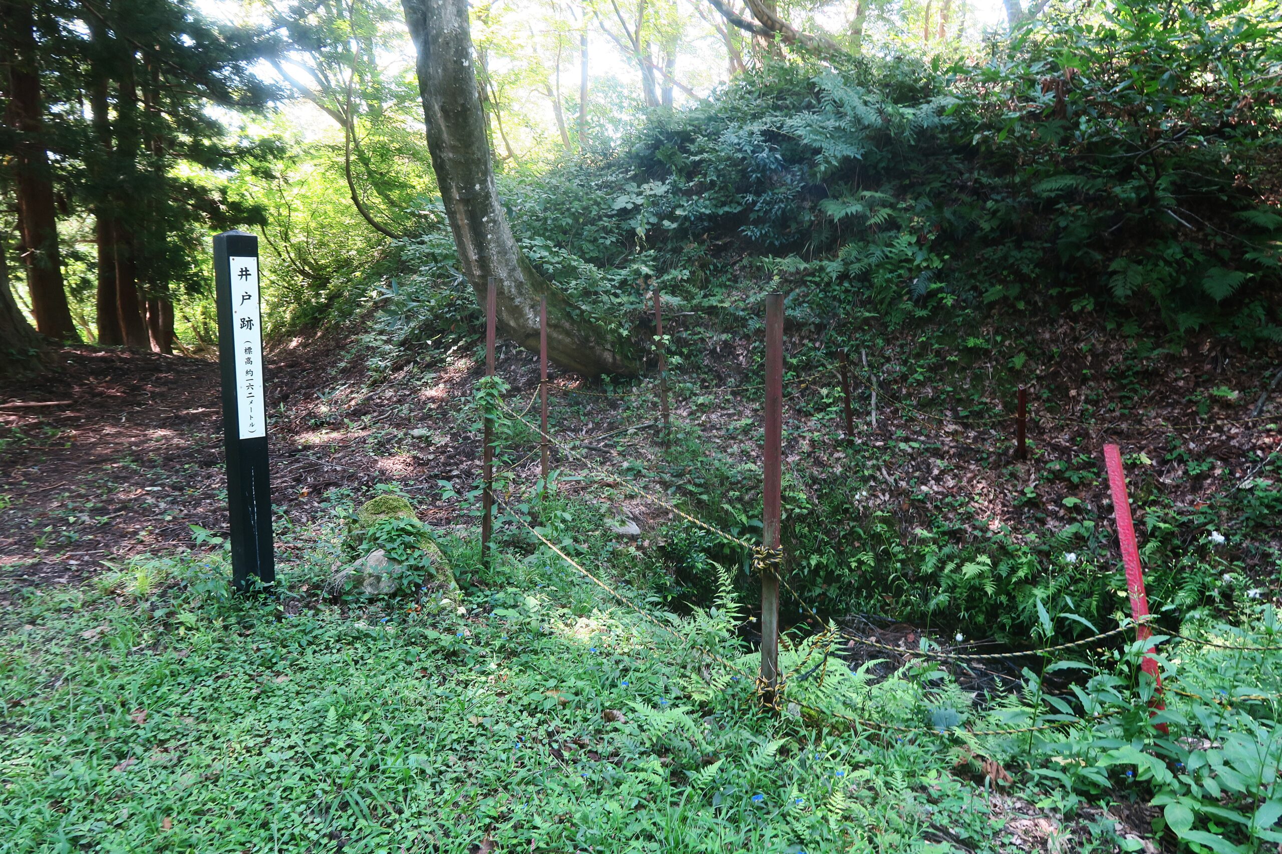 下段にある井戸跡の脇からスロープ状の登り道が付いているため、曲輪に上ったところにあるくぼみが三ノ丸虎口の痕跡であると考えられています。虎口跡の正面には土塁が築かれ、虎口を突破した敵兵を攻撃する鉄砲隊が身を隠すために利用されたと思われます。