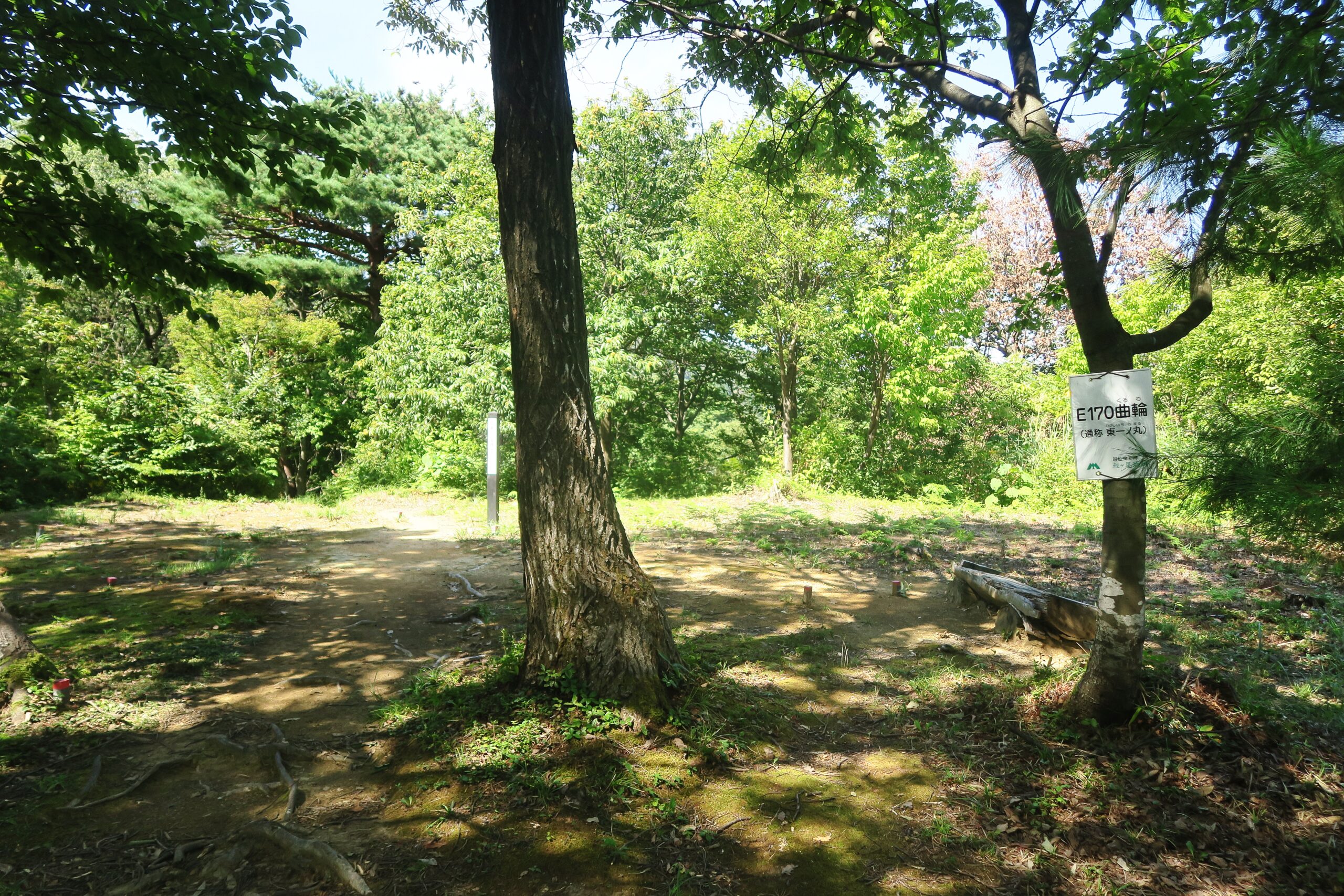 その後切岸や小さな堀切を抜け、通称東一ノ丸跡(E170)に。発掘調査で山城の遺構の下から弥生時代の墳丘墓が発見されています。