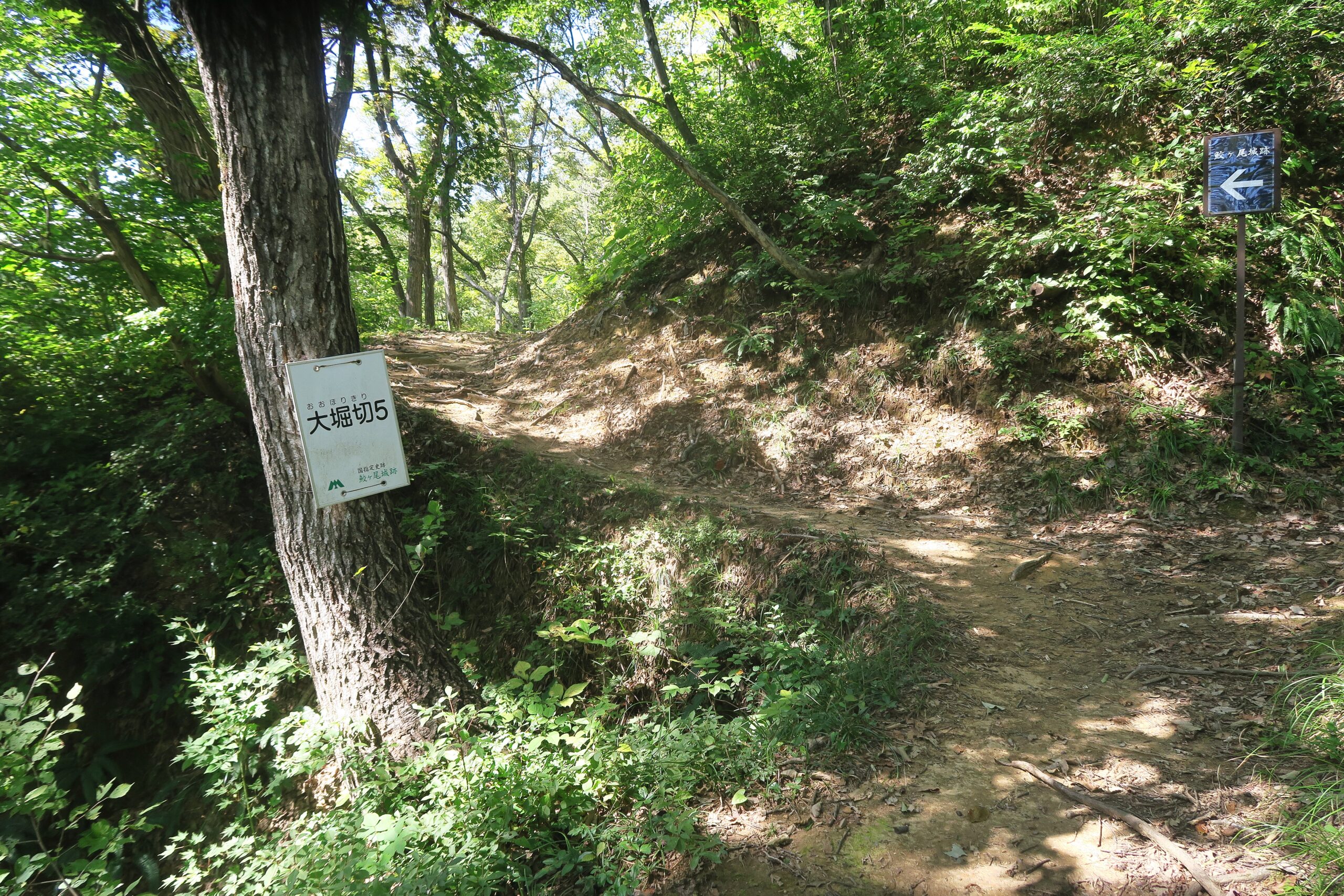 東登城道は緩やかな勾配で長く延びる東側の尾根を行く登山道で、搦手道でした。尾根筋に往来の妨げとなる堀切が多く造られていますが広い曲輪はほとんど造られていません。