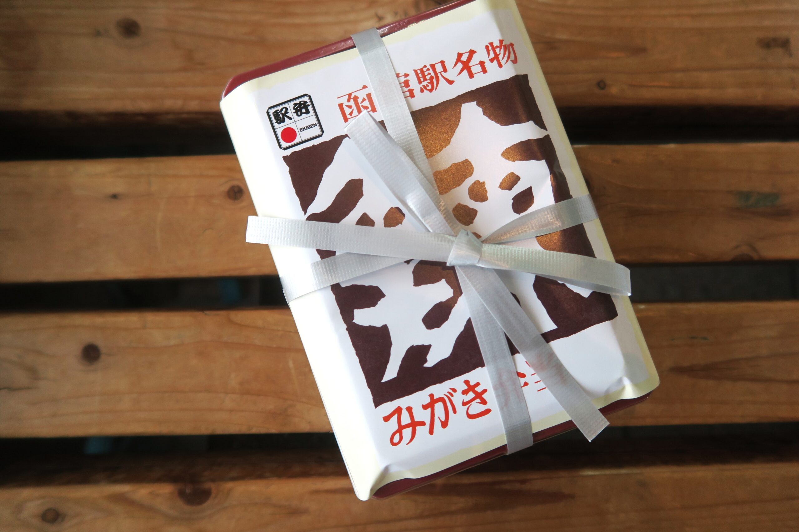 函館駅から洞爺駅へと続く函館本線と室蘭本線は、内浦湾を望み、火山の裾野を走る。雄大な自然が車窓に展開する絶景路線であり、かつ北海道を代表する名駅弁が並ぶ黄金街道でもあります。内浦湾は、周囲を火山に囲まれているため別名、噴火湾と呼ばれ、天然の良港に恵まれた海産物の宝庫で、駅弁も沿線の海産物から生まれたものが多くあります。函館駅の名物駅弁「鰊みがき弁当」は、登場して半世紀以上が経つ長寿にして人気の駅弁です。じっくり煮込んだ鰊の甘露煮2切れと味付けかずのこが3切れ、他に茎わかめの醤油漬けと味噌漬け大根が入っています。