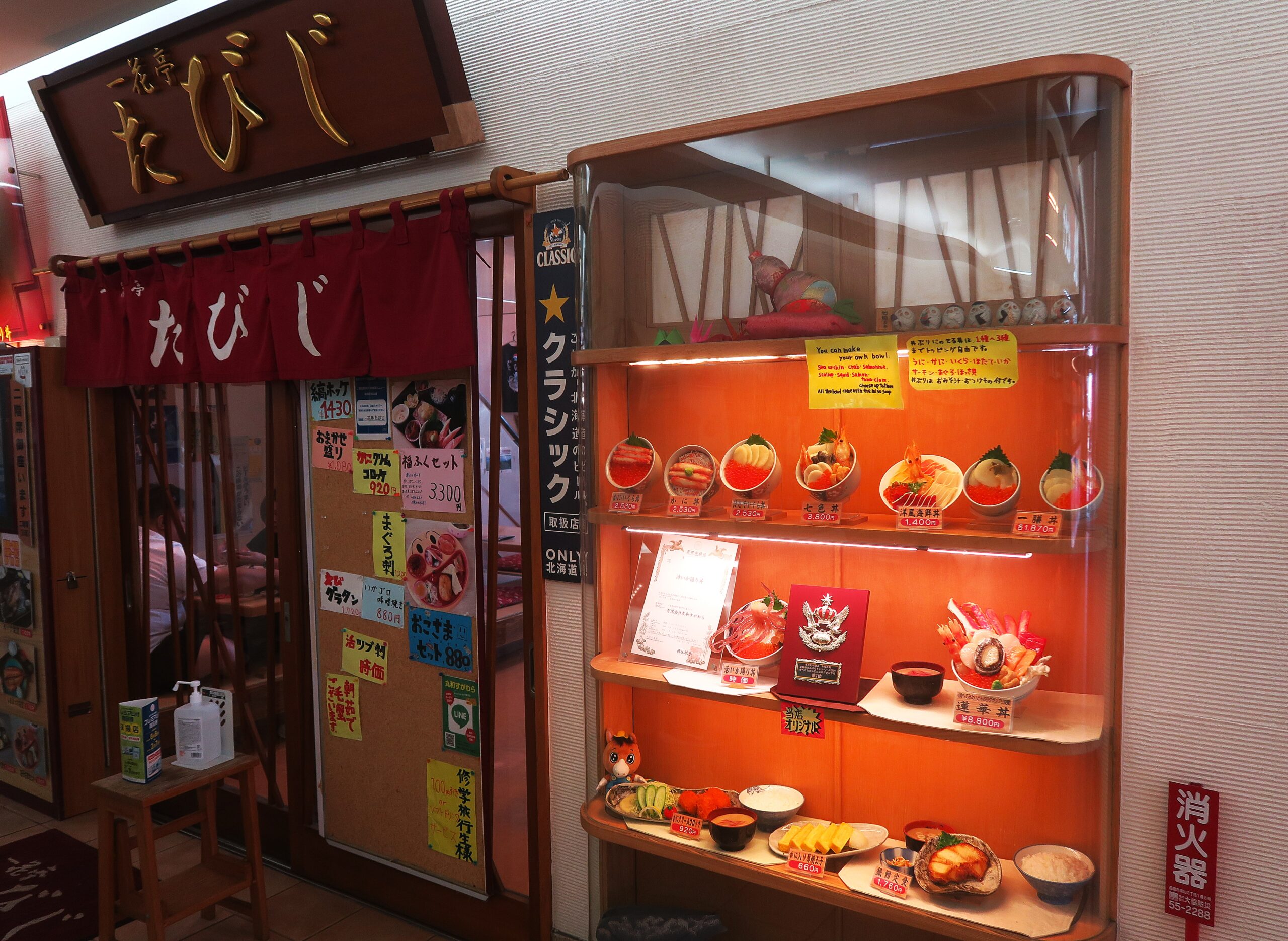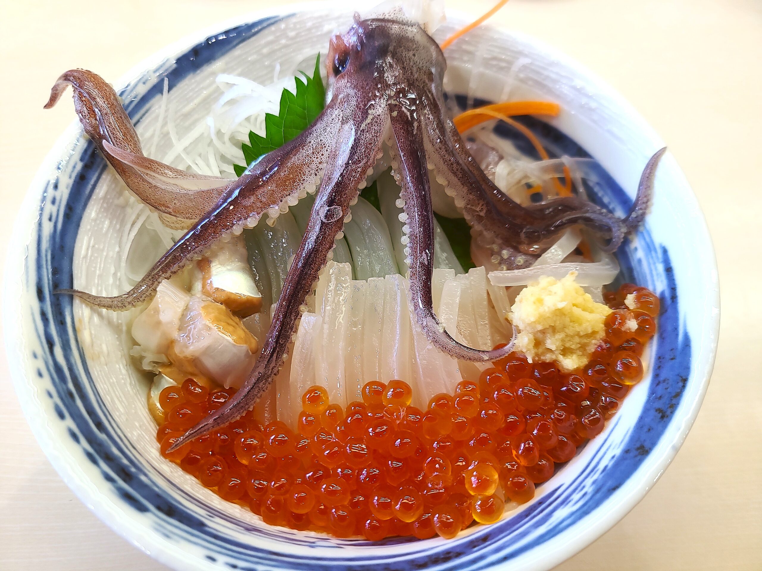 函館朝市の一角に立つどんぶり横丁は、平成17年にリニューアルされ、海鮮食堂10件、寿司屋一軒、物販店6軒など計20店が軒を連ねる人気スポット。このうち11軒では、ウニ、イクラ、ホタテ、ズワイガニなど、近くの漁港に揚がった、海の恵み満載の丼が楽しめる。中でも「一花亭 たびじ」でいただけるのが、さばきたてのイカを贅沢にまるごと使った活いか踊り丼です。