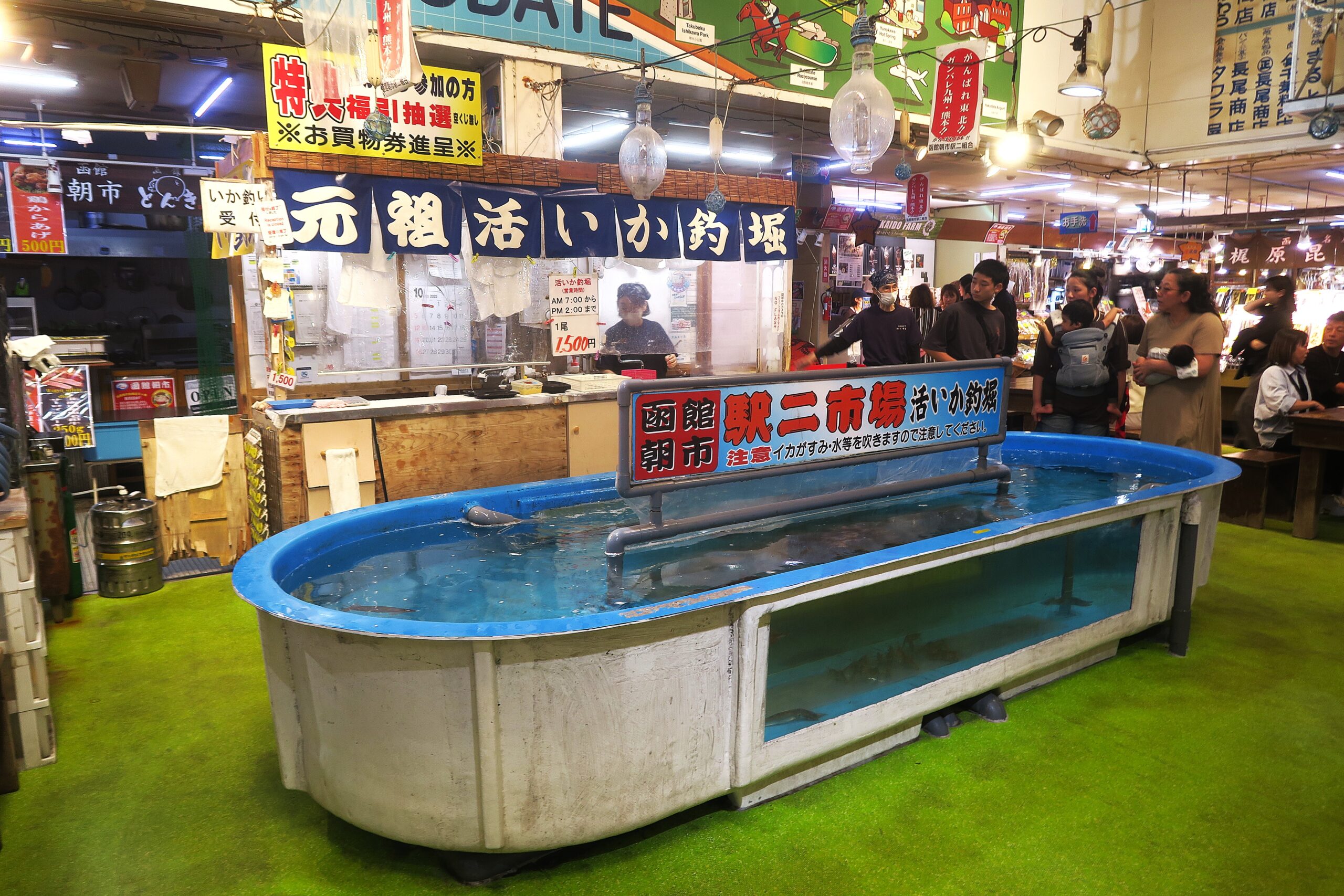 えきに市場の中央にあるのが、朝市名物イカ釣りに挑戦できる釣り堀“元祖活いか釣堀”。グルメとアミューズメントの両方を味わいたい人にはオススメ。竿を受け取って針を水槽に垂らし、イカの三角のエンベラ部分に針をひっかけて釣ります。釣れたイカはその場で捌いてもらえ食べることができます。部位によって歯応えの違いを感じながらいただきます。