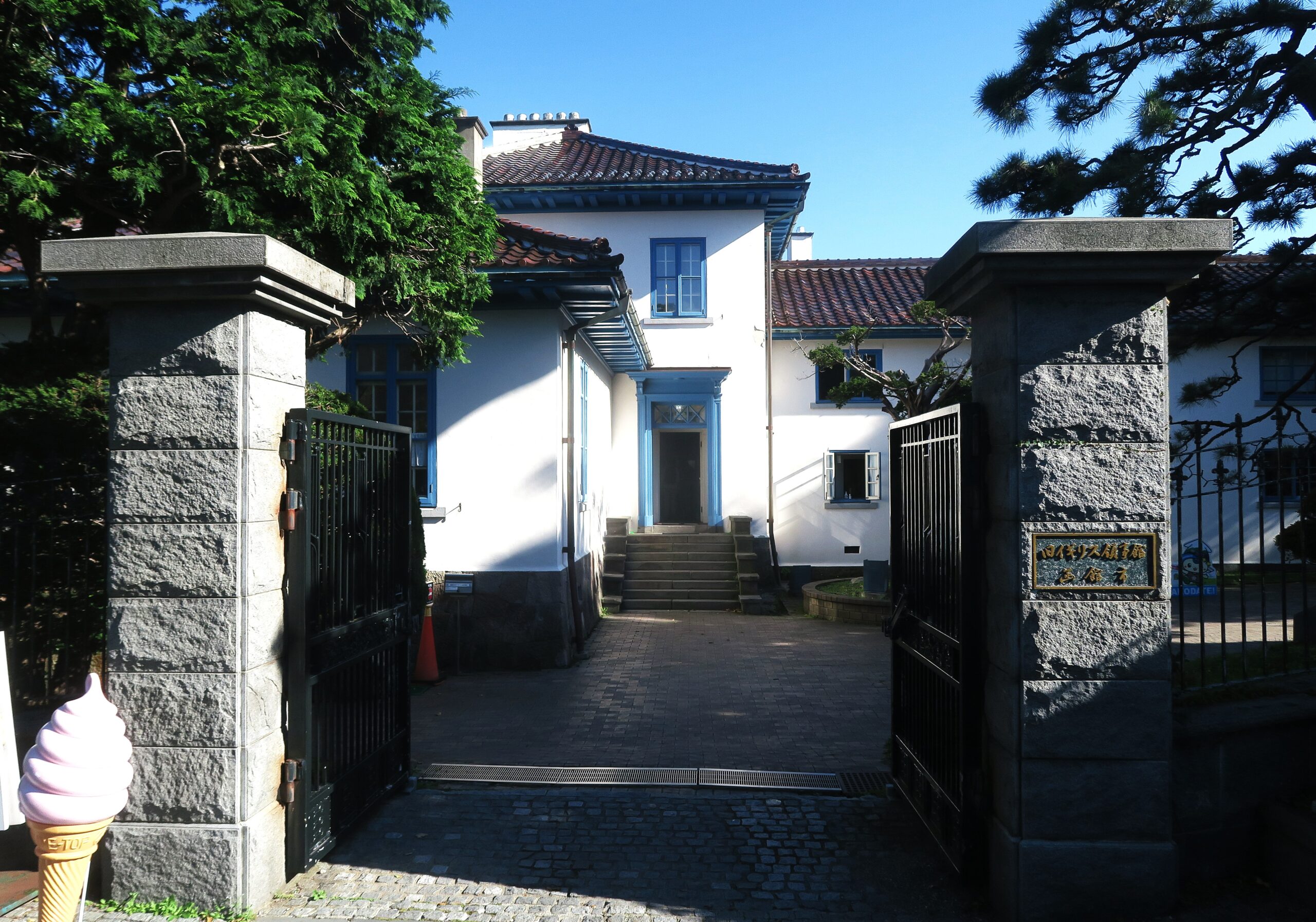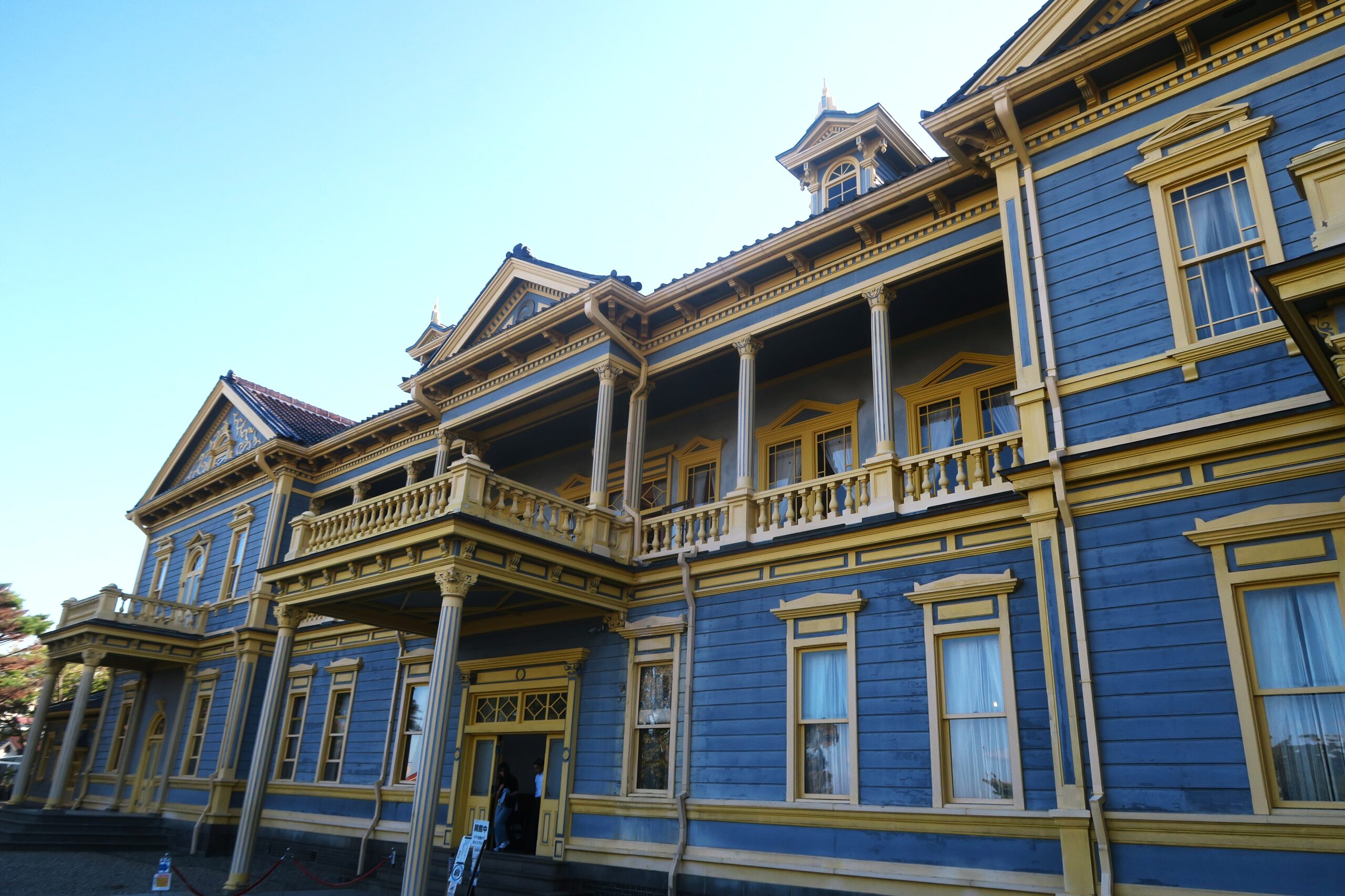 元町公園から基坂を上った高台に立つのが、グレープブルー×イエローのモダンな外観が印象的な旧函館区公会堂です。明治40年(1907)の大火で町会所が焼失した後、開港時に越後から渡ってきて北海道屈指の豪商として成功した相馬哲平の寄付により新たな区民の集会所として明治43年(1910)に建設されました。左右対称のコロニアルスタイルの建物は、オープンベランダが張り出した玄関ポーチなど欧風文化華やかな明治時代を偲ばせる木造洋館です。設計は函館区の小西浅次郎という役所で長くキャリアを積んだ人物ですが建築の正規教育を受けたわけではないので、階段の手すりは、ギリシャ建築のコリント式の意匠に使われるアカンサス(葉アザミ)がモチーフになっていたり、唐草模様の装飾など描かれたりと和風が混じり合い、函館に培われた初期洋風建築の流れも感じることができます。ミシュラン・グリーンガイド・ジャポン二ツ星