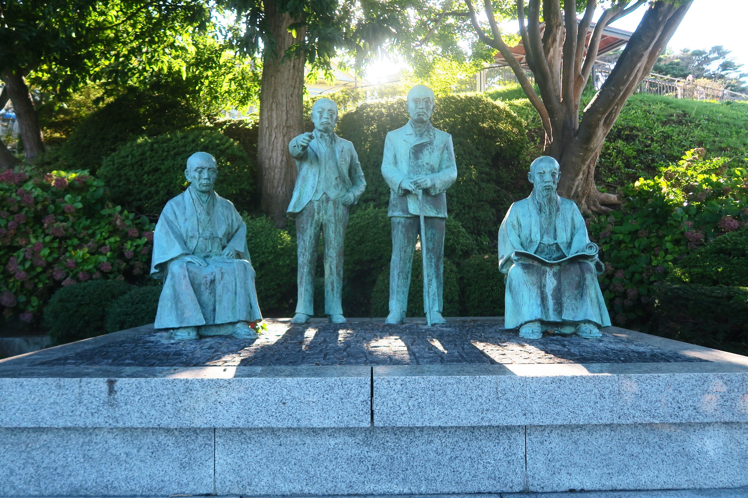 かつては政治の中心であった基坂上の元町公園へ。幕府の蝦夷地直轄時代には「函館奉行所」が置かれ、当時警備薬の津軽藩や南部藩の陣屋も近隣にありました。いざ開港が決まると、この見晴しのいい奉行所の位置は、外国船からの砲撃という危機感を生み、市街地から離れて「五稜郭」が築城されました。公園内には明治期の函館の発展に尽力した4人の財界人、左から今井市右衛門(北摂社)・平田文右衛門(廣島屋)・渡邊熊四郎(金森洋物店)・平塚時蔵(函館新聞)のブロンズ像の函館四天王像があります。