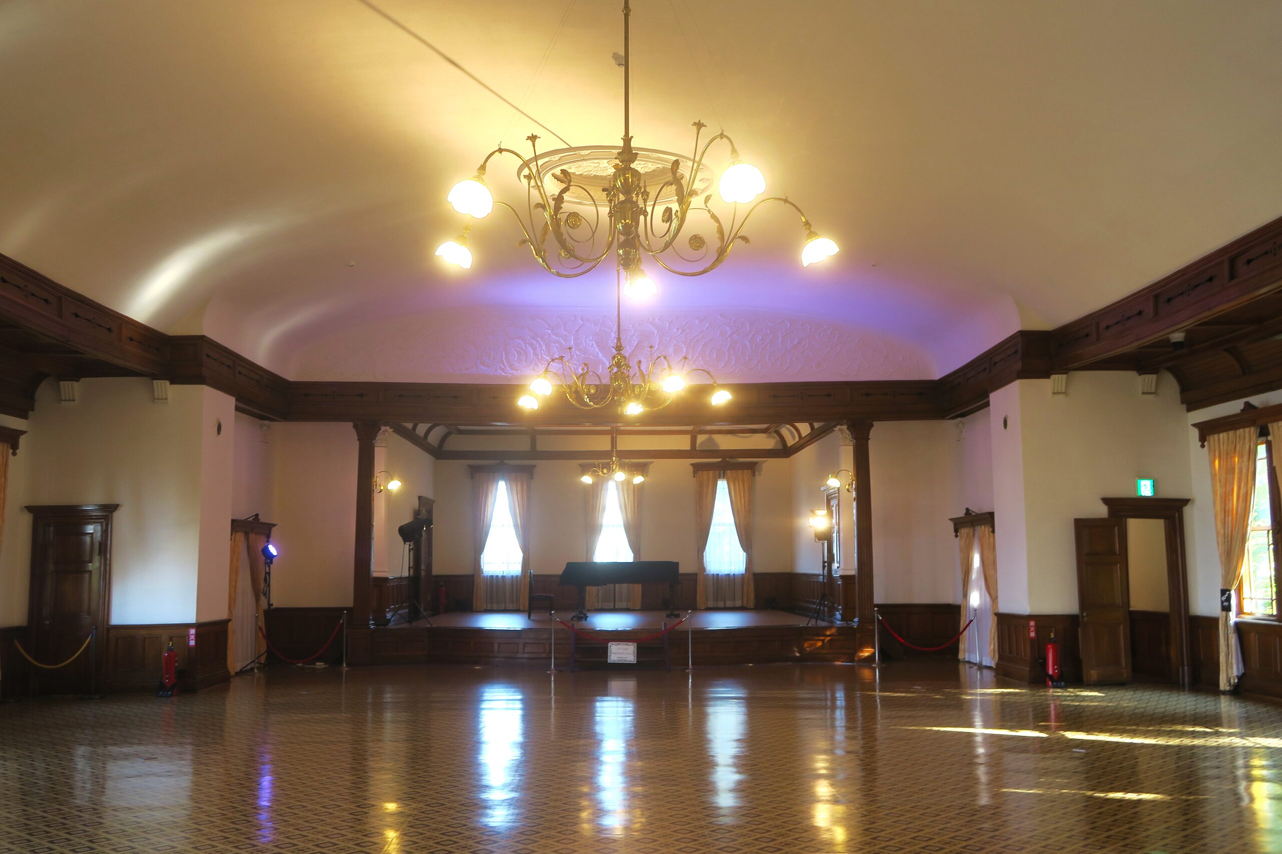 2階の130坪(260畳分)の広さのある大広間は、柱が1本もなく、蒲鉾型の天井が、音声を柔らかく響かせます。大正時代には舞踏会も開催されたといいます。