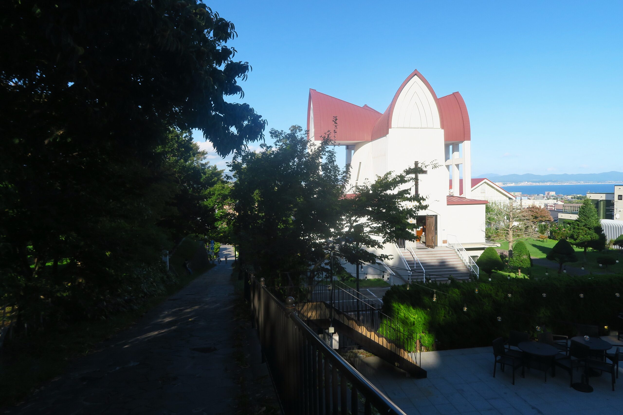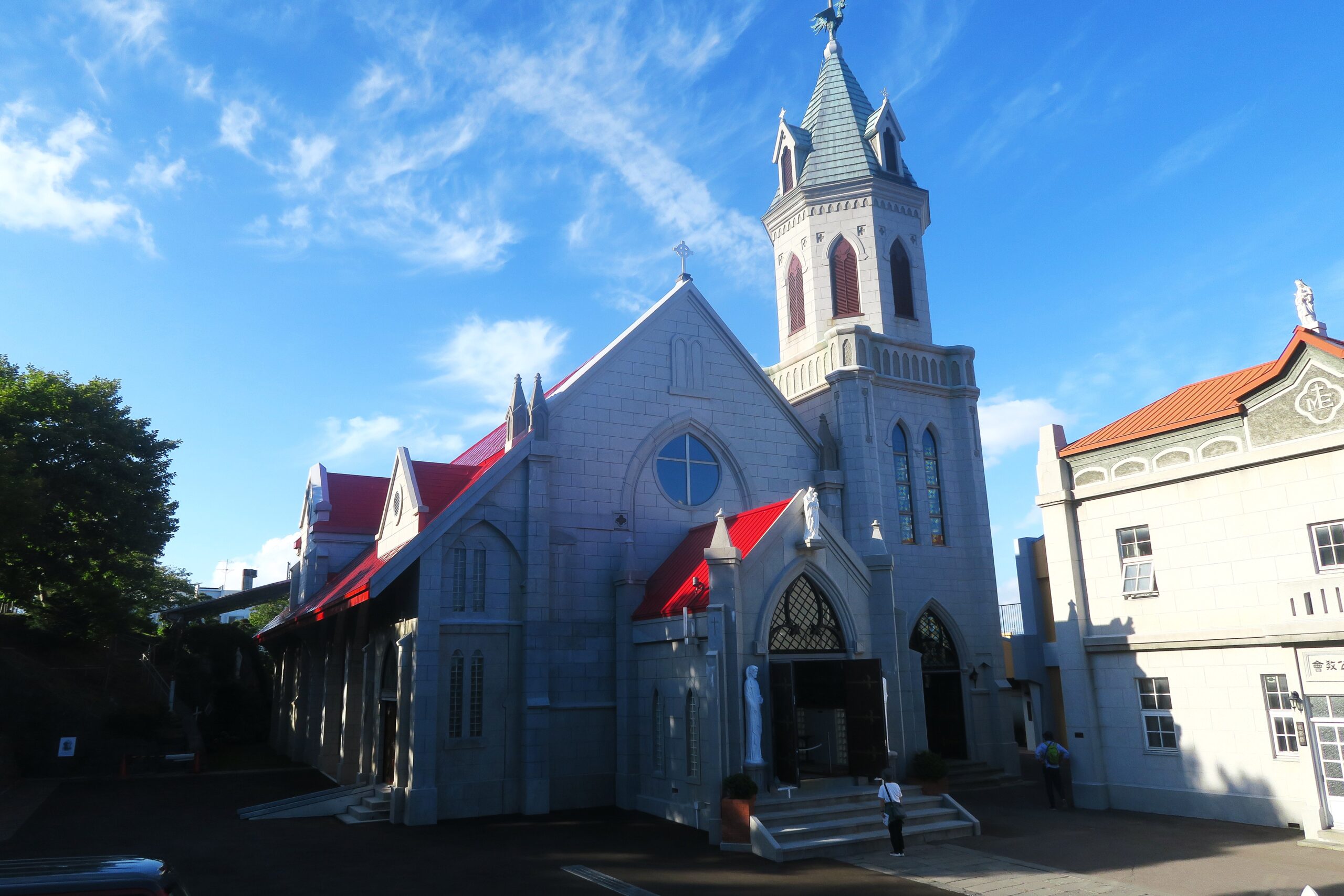 チャチャ通りから続く大三坂は、「日本の道百選」に選ばれた石畳がお洒落な坂道。その坂道沿いにあるカトリック元町教会は、高く尖った六角屋根の大鐘楼とてっぺんの風見鶏が印象的な北日本最古の教会です。安政6年(1859)の開港と同時に来日したフランス人宣教師メルメ・ド・カション(パリ外国宣教会司祭)が、仮聖堂を建てたことに始まる。徳川幕府によるキリシタン禁教令の廃止後、国内に先駆けて建てられた横浜の山手、長崎の大浦と共に最も古い歴史を持つ教会のひとつです。レンガ造りだった建物は、大正10年(1921)に大火で被害に遭いモルタルを塗るなどして補修してゴシックスタイルの耐火建築として大正13年(1924)現在の姿に完成。大聖堂内にある中央祭壇、左右両壁十四景の十字架道行の壁像はイタリアチロル地方の木彫りで、火事見舞いとして時のローマ法王ベネディクト15世から贈られた由緒あるものです。ミシュラン・グリーンガイド・ジャポン一ツ星