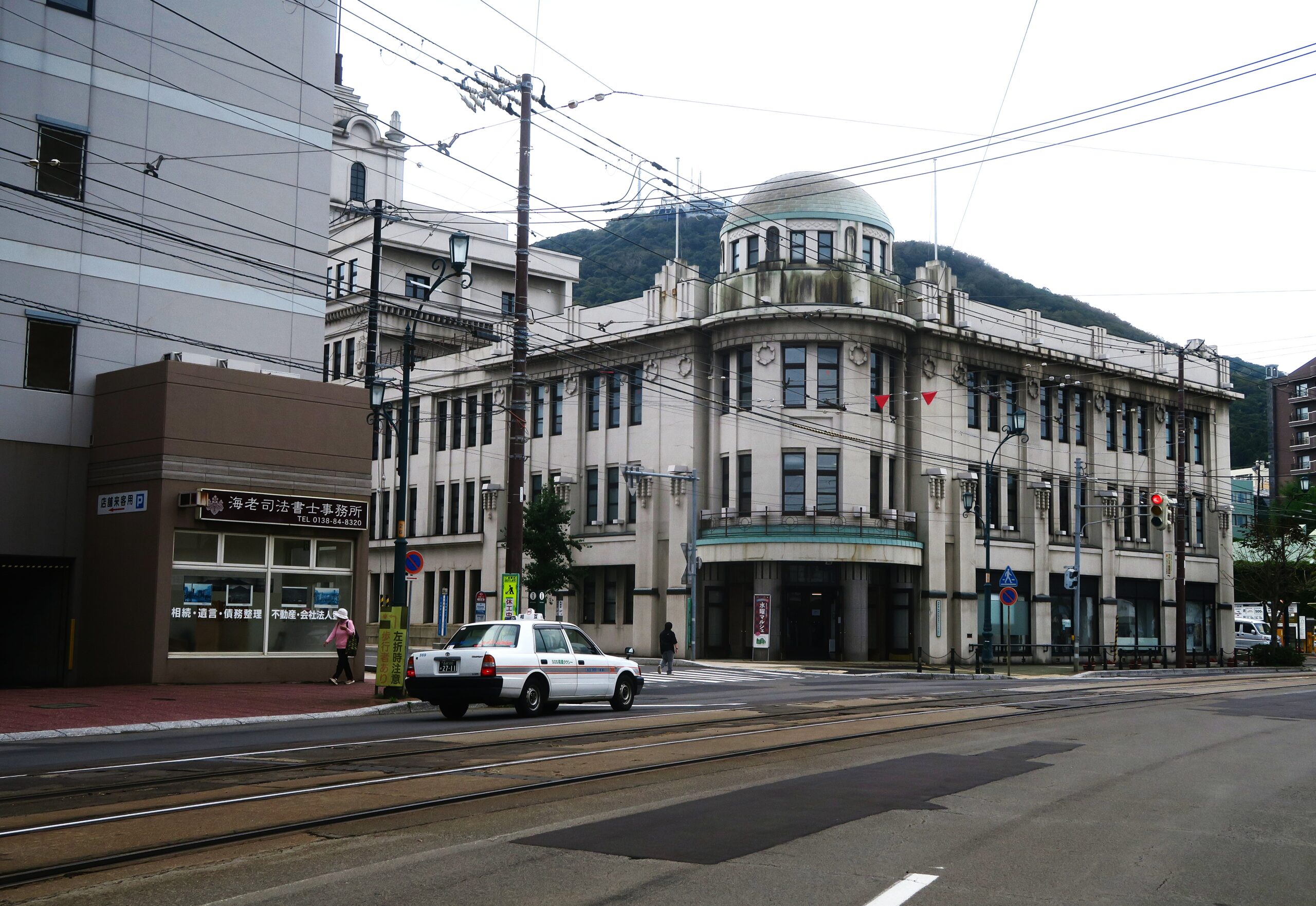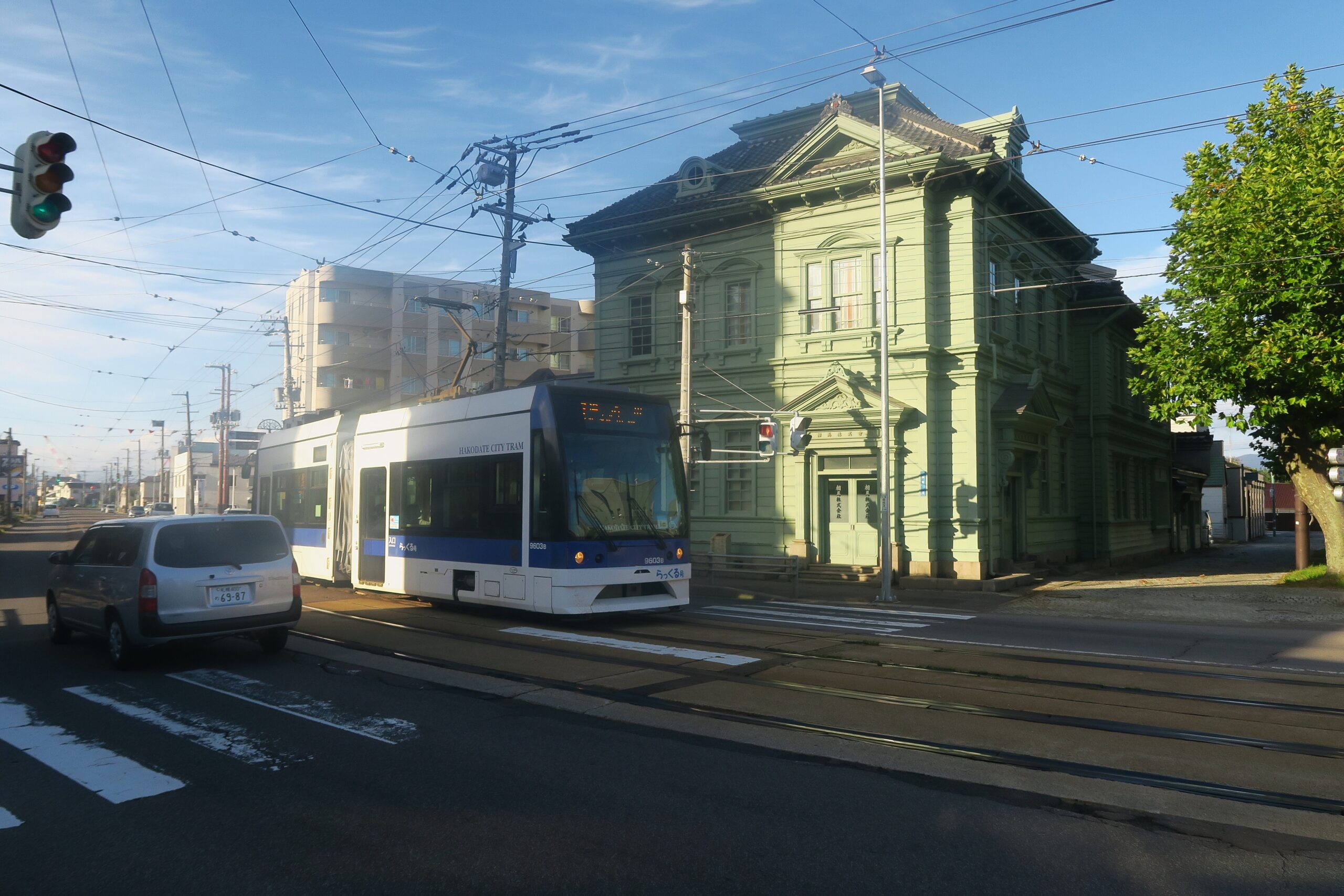 十字街電停から湯の川温泉へは、函館市街から路面電車に揺られること33分で行けます。写真の洋館は、基坂と電車通りの交差点に建ち、ペパーミントの外観が目を引く西部の町並みのランドマーク的存在である相馬株式会社の社屋です。相馬株式会社は文久3年(1863)米穀商として相馬哲平が創業した会社の大正2年(1913)築のルネサンス風事務所社屋で、石積みが基礎の木造2階建て、ペディメント(西洋式切妻破風)などにわずかに和風意匠を残す特異な建物です。ミシュラン・グリーンガイド・ジャポン一ツ星