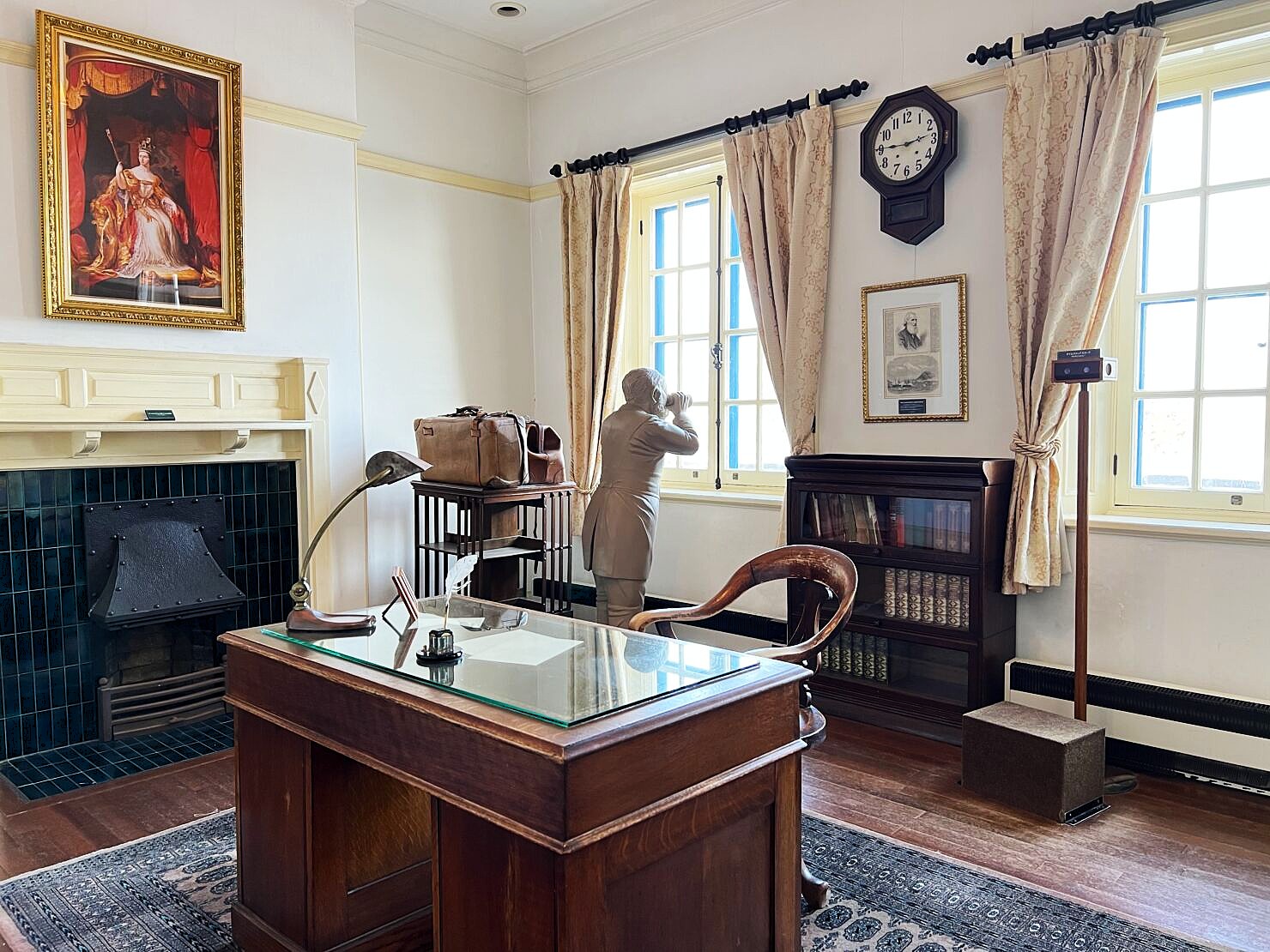現在は開港記念館として一般公開されています。館内には函館開港の歴史を「イギリス領事館」「函館開港の歴史」の2つのテーマを基本に展示しています。1階は開港ミュージアムが併設、2階に復元された領事執務室には函館市民に愛されたリチャード・ユースデン領事像が双眼鏡を手に港を眺めています。